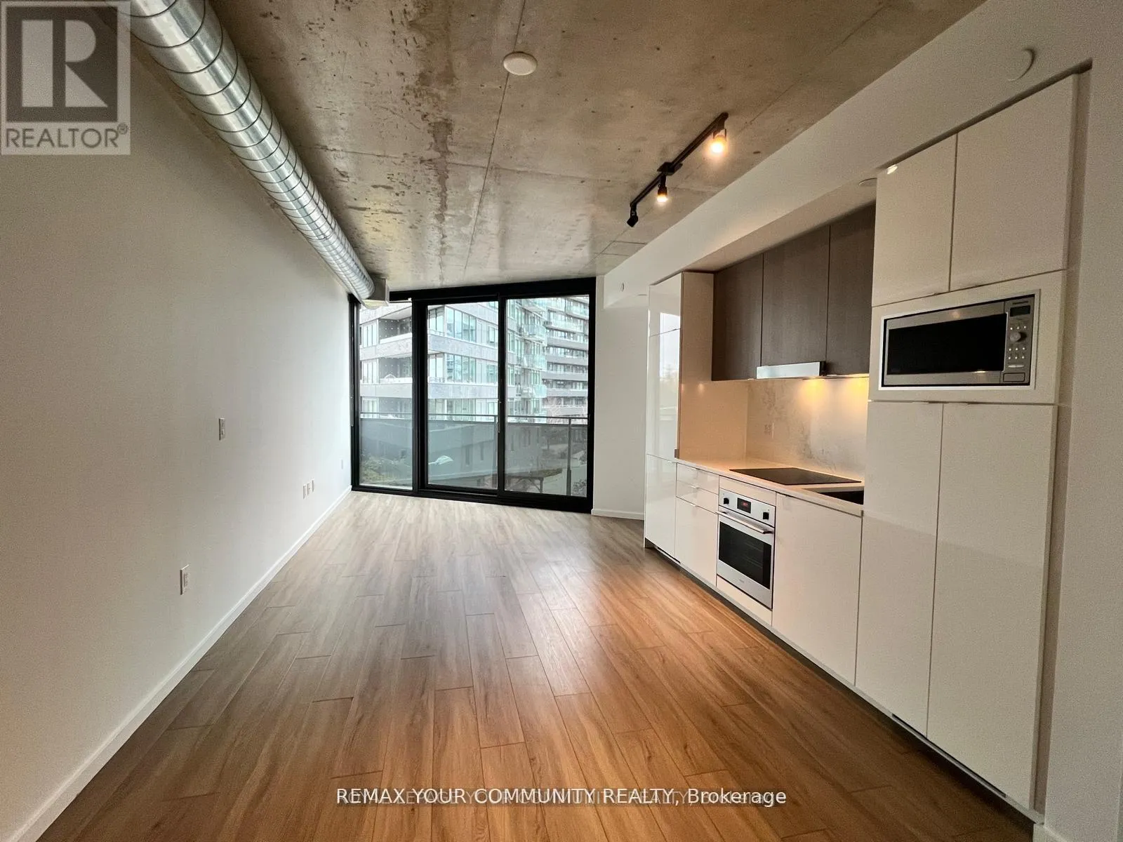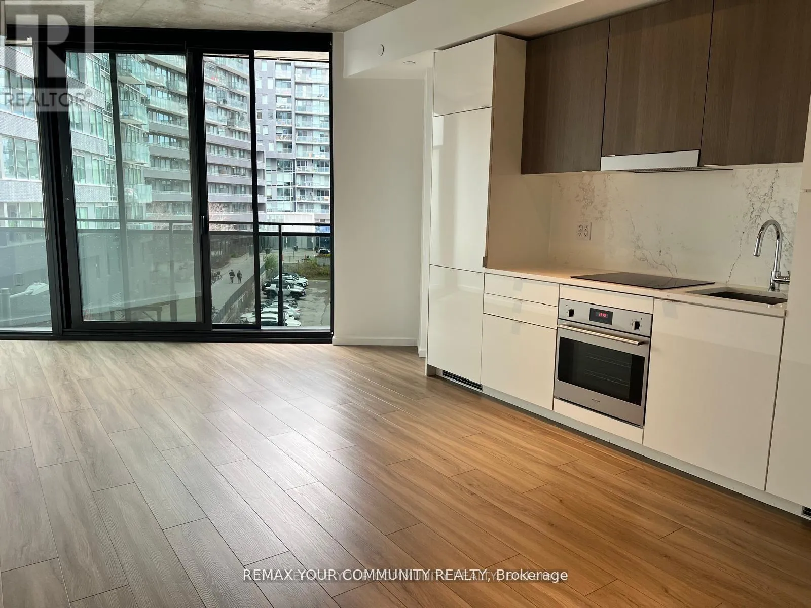 Eastern Ave. & Lower River St. Welcome to Harris Square Condos in West Don Lands, Toronto. This modern one-bedroom suite features exposed 9-ft ceilings and premium vinyl plank flooring throughout. The sleek kitchen offers quartz countertops and integrated appliances, while the spacious bedroom includes a large closet for ample storage. Enjoy an unbeatable location within walking distance to Corktown Common, Don River Park, and the Distillery District, with restaurants, shops, transit, and highway access just steps away. Building amenities include concierge service, gym, and a stunning roof top lounge with CN Tower views (id:27476)