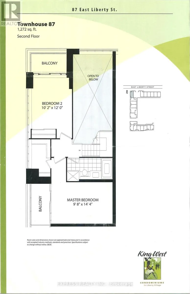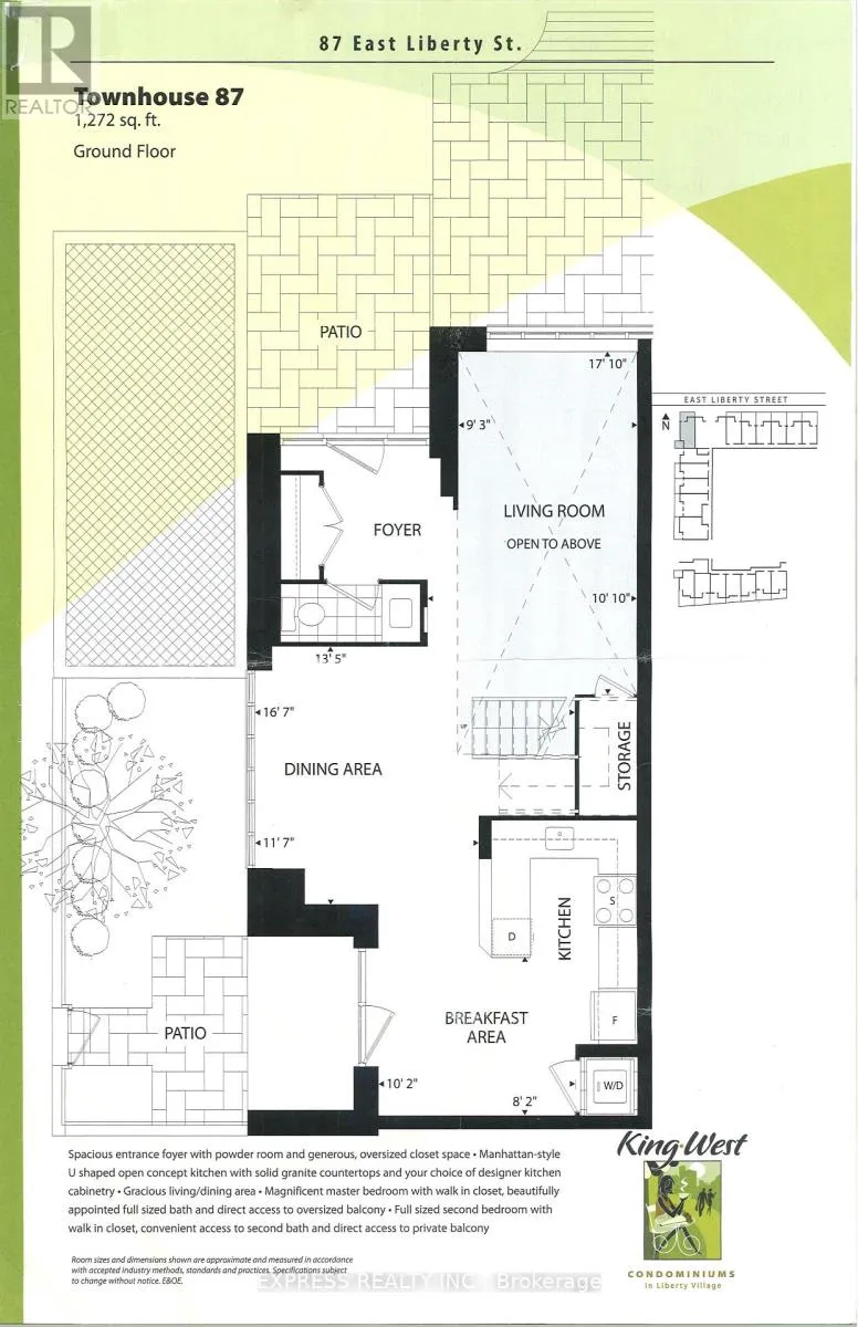 King St W / Strachan Ave 2 - Storey Townhouse at East Liberty Village, 1,272 SqFt. Feature with Spacious Entrance Foyer. Generous oversized Closet space. Living Room with High Ceiling Open to 2nd floor. Manhattan Style u shaped open concept Kitchen w Granite Counter top. Gracious Living / Dining Area. Magnificent Master Bedroom W W/I Closet. Direct access to Balcony . Exclusive use of patio ! 1 Parking & 1 Locker. (id:27476)