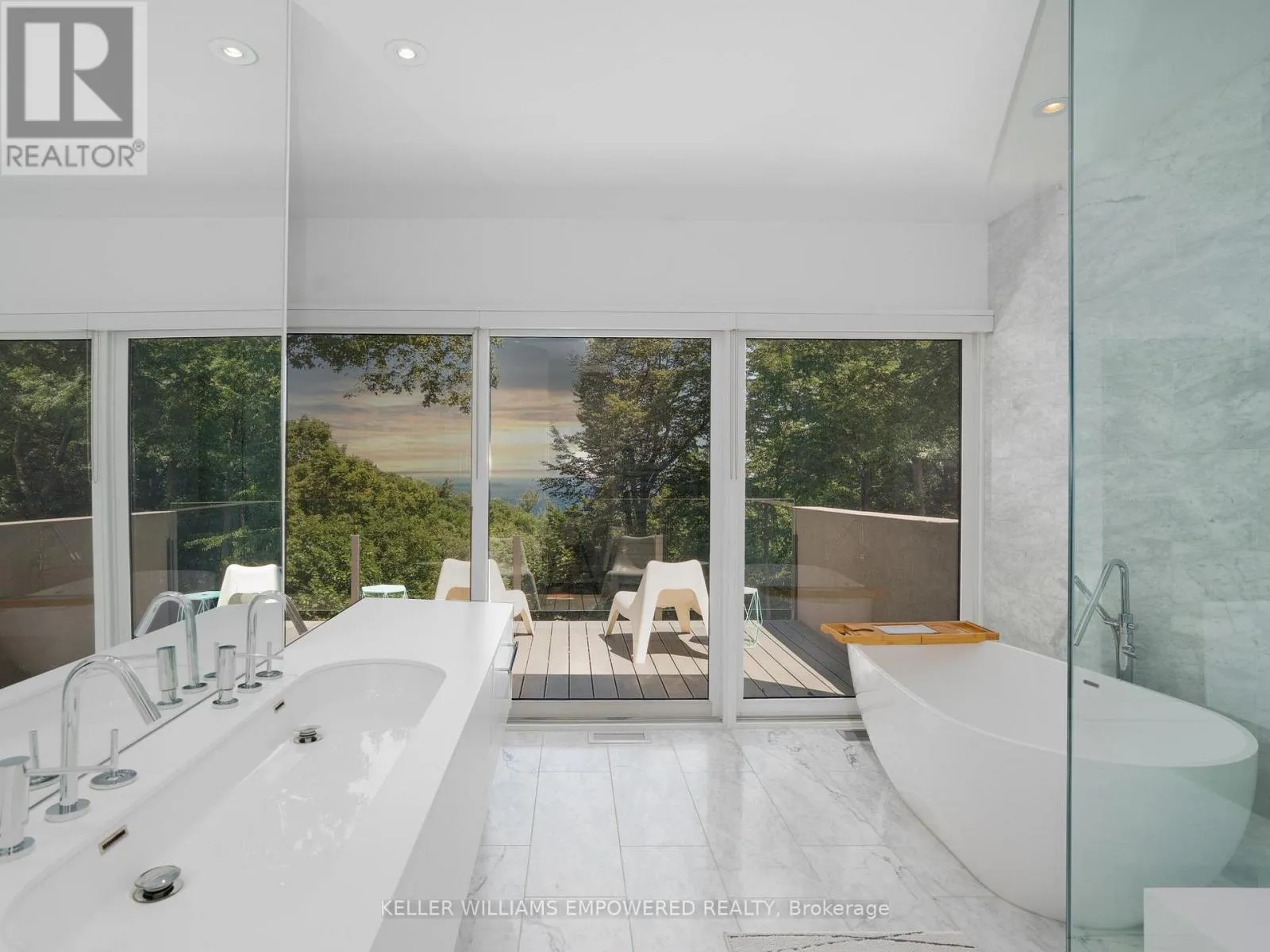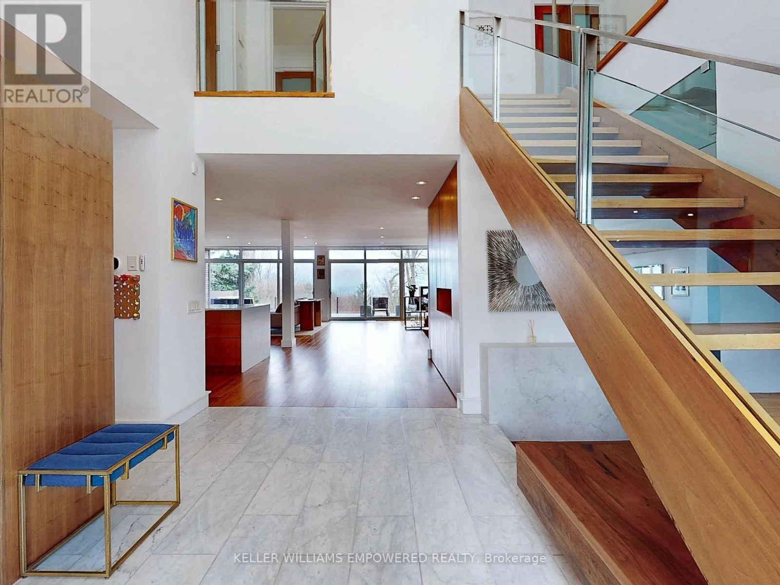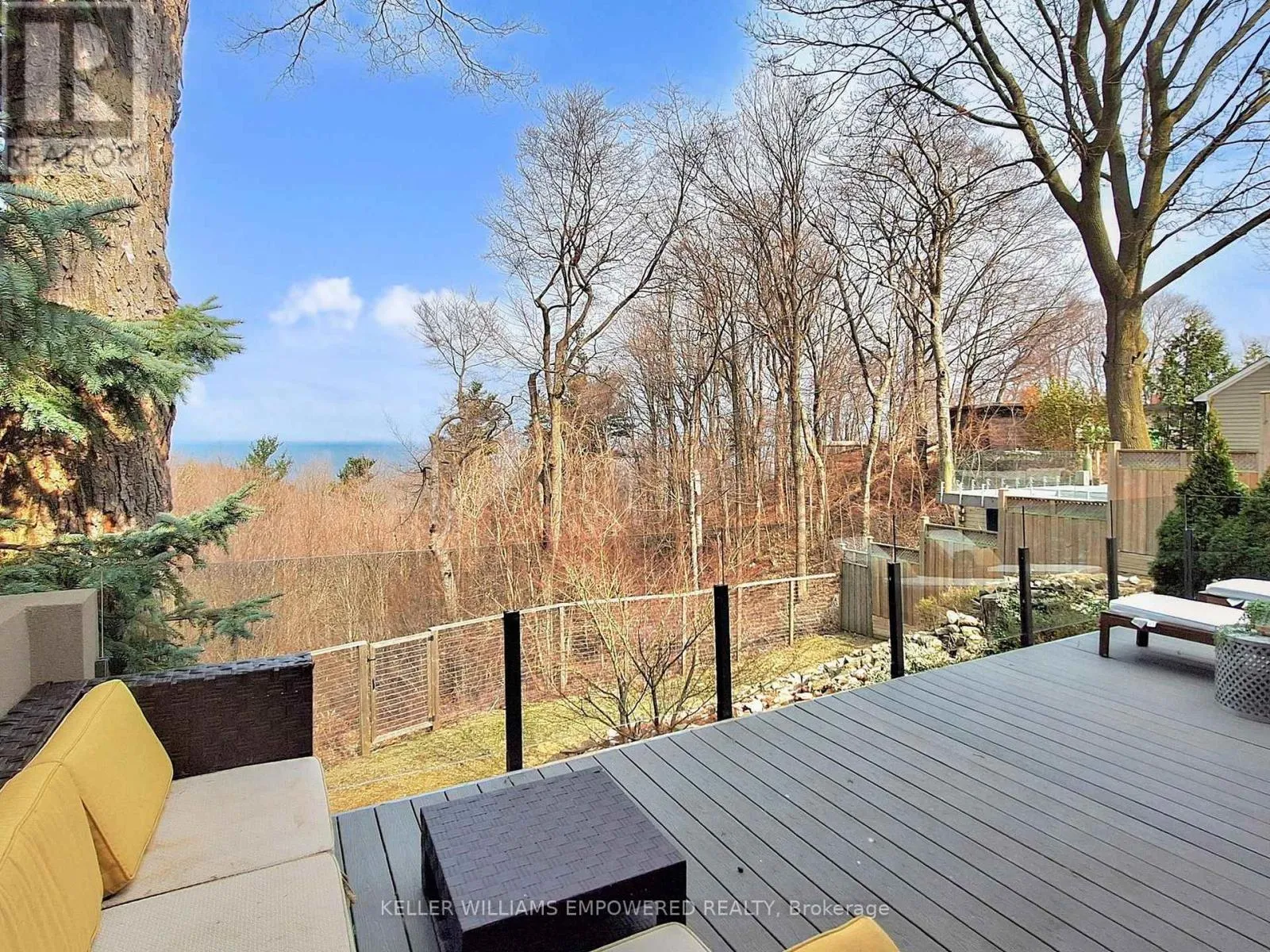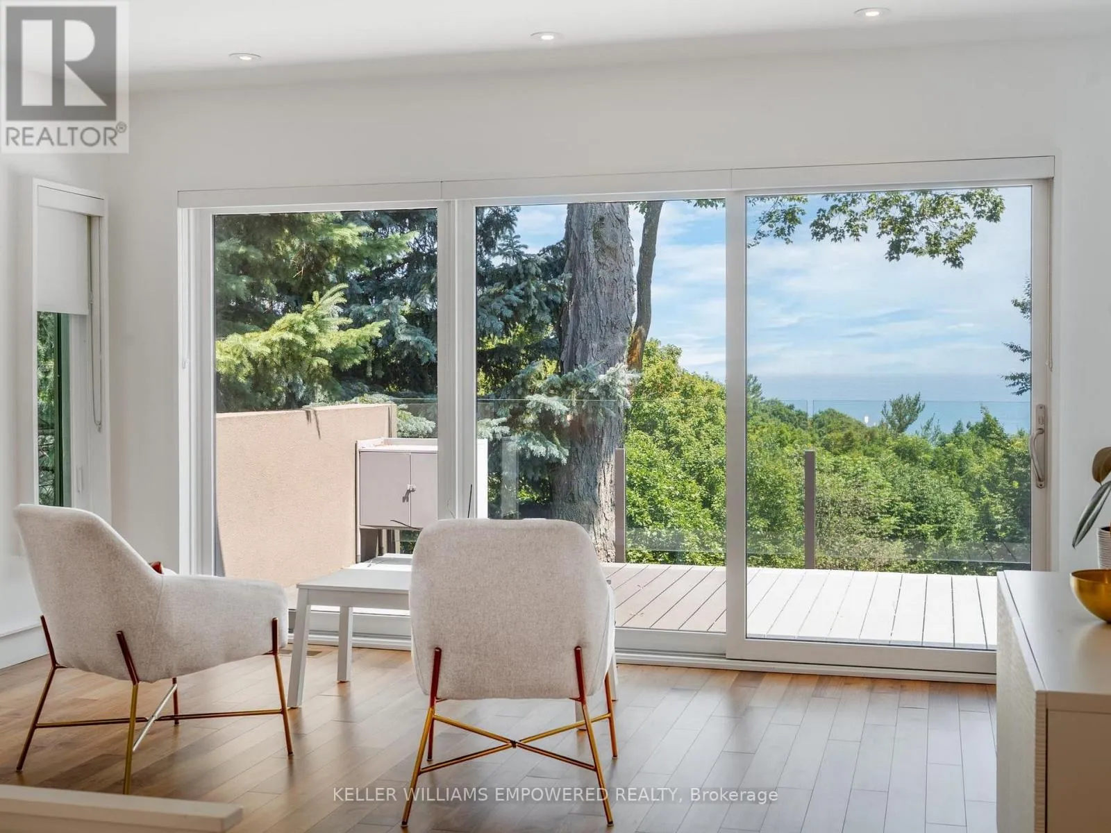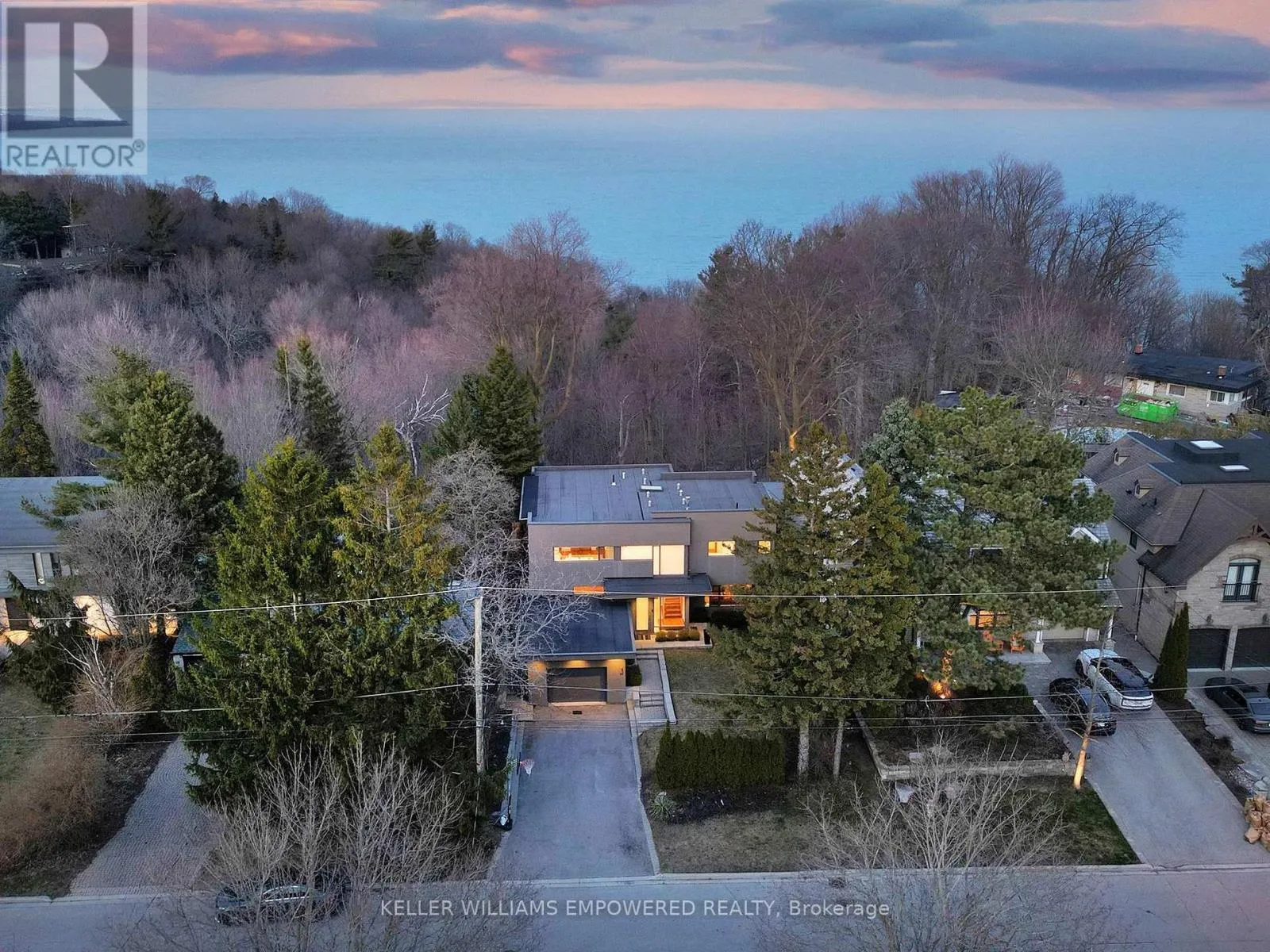 Kingston Road & McCowan Road Discover this exceptional lake-view residence, where contemporary design meets serene natural beauty. This stunning home features a sleek open-concept layout, accented by expansive windows and multiple walkouts, showcasing unobstructed views of Lake Ontario and lush conservation land. From the moment you step into the grand foyer with soaring 18.5-foot ceilings, a statement chandelier, oversized marble slab flooring, a two-storey window, and a custom Walnut guest closet you'll be captivated by the sophisticated details throughout. The main level is an entertainers dream, offering a seamless flow between the spacious living, dining, and family rooms, all adorned with pot lights and rich Walnut flooring. The chef-inspired kitchen is the heart of the home, boasting a dramatic waterfall island with Stone countertops, seating for four, and custom pull-out organizers. This space opens directly to multiple outdoor entertaining decks, perfect for hosting or relaxing while enjoying panoramic views. Ascend the striking open-riser Walnut staircase, framed with glass railings and stainless steel handrails, to find a luxurious primary retreat. The serene primary suite offers a private sanctuary, complete with its own balcony, window wall with lake views, a custom dressing room with skylight and extensive cabinetry, and a spa-like ensuite featuring heated floors and serene conservation views. The fully finished walk-out lower level adds even more space to unwind, with a large recreation room featuring heated floors and direct access to the beautifully landscaped rear grounds. Enjoy quiet evenings around the firepit or take advantage of the convenient access to the upper decks, seamlessly connecting indoor and outdoor living. This exceptional property offers the rare combination of modern luxury, privacy, and spectacular natural surroundings perfect for those who love to entertain or simply soak in the beauty of the outdoors. Video and audio may be on during viewings. (id:27476)