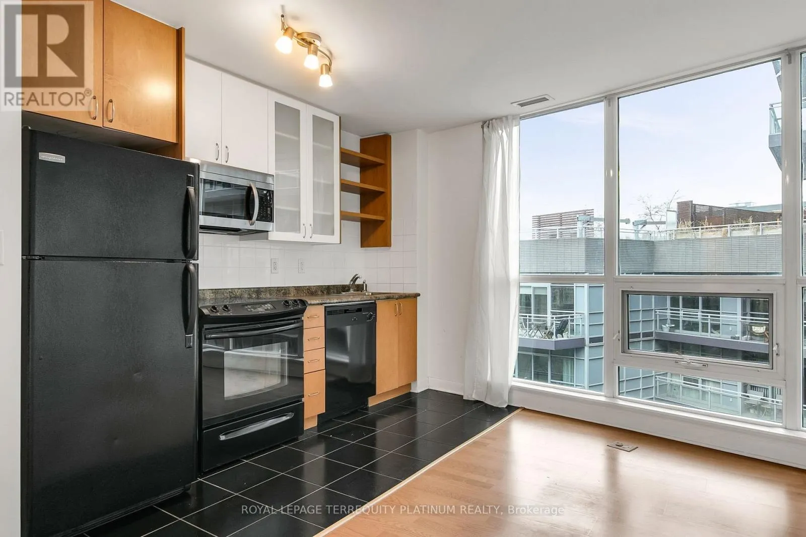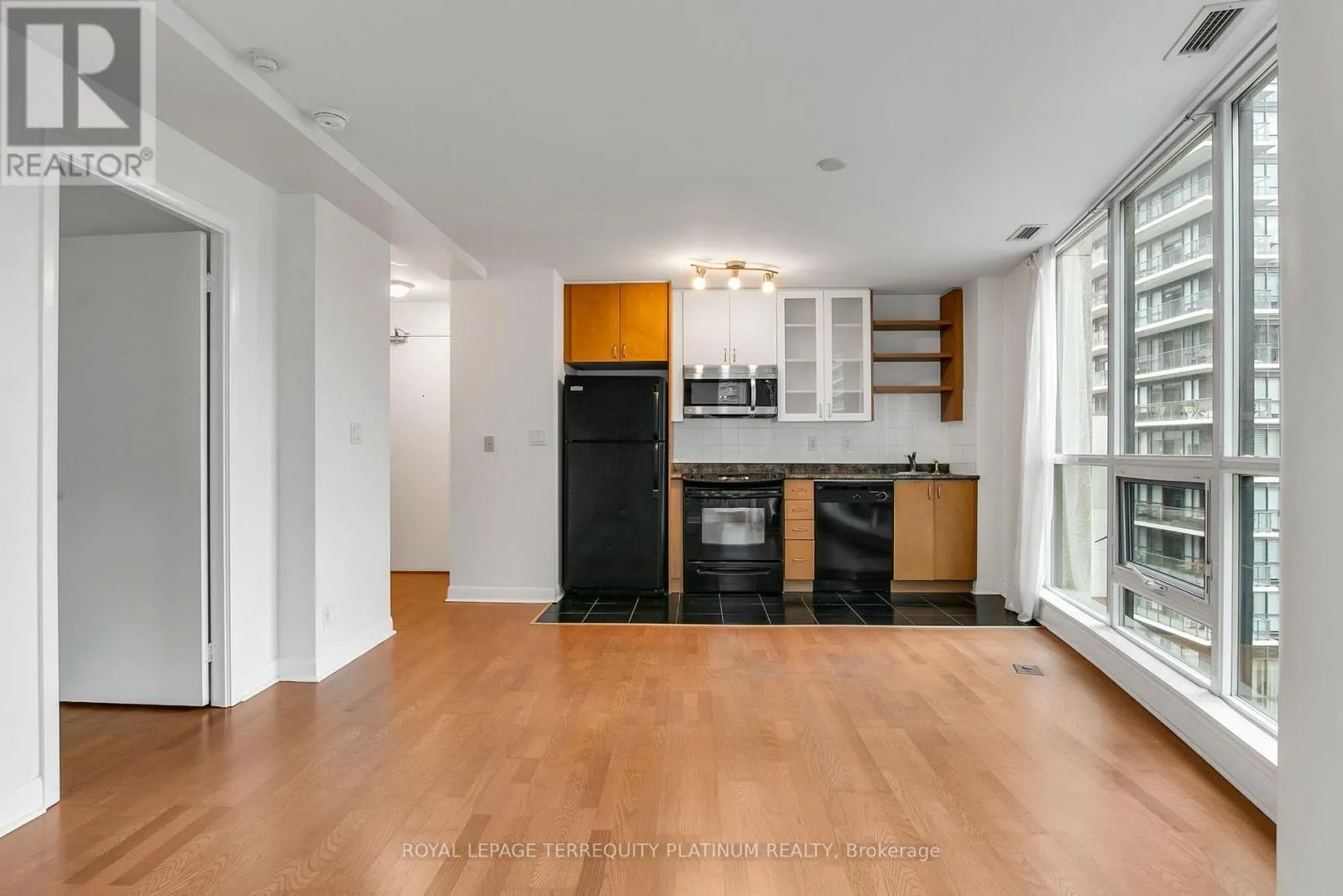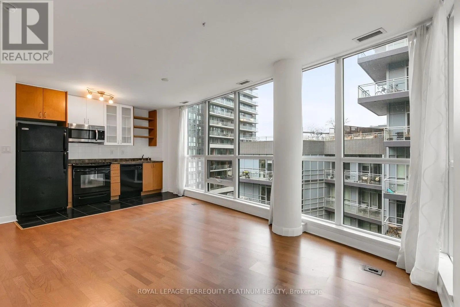 Bathurst/Lake Shore It's time to make your new year's resolution of moving downtown happen! This total package is located in downtown Toronto's thriving waterfront neighbourhood, steps to the lake, park, running trails, dog park, TTC at your door, Billy Bishop Airport, Loblaws, LCBO, King West bars/ clubs/restaurants,local dining/cafes and so much more. This 1-bedroom corner suite at the end of the hall offers a functional open-concept layout with large northeast-facing windows overlooking the building's quiet courtyard. No wasted space! Wood floors run throughout, and the living area opens to a balcony for a breath of air any time of day. Residents enjoy some of the best amenities in the neighbourhood, including a 24-hour concierge, indoor pool and hot tub, a fully equipped gym, a rooftop terrace with BBQs, ample visitor parking, and a stylish party room with kitchen and bar. Owned locker for convenient storage of larger items, and the bonus is the owned parking space so you can take a drive with easy access to the Gardiner, getting you in and out of the downtown core efficiently. GO Train access at Exhibition Station is also a walkable, convenient option. Note that some images are virtually staged. (id:27476)