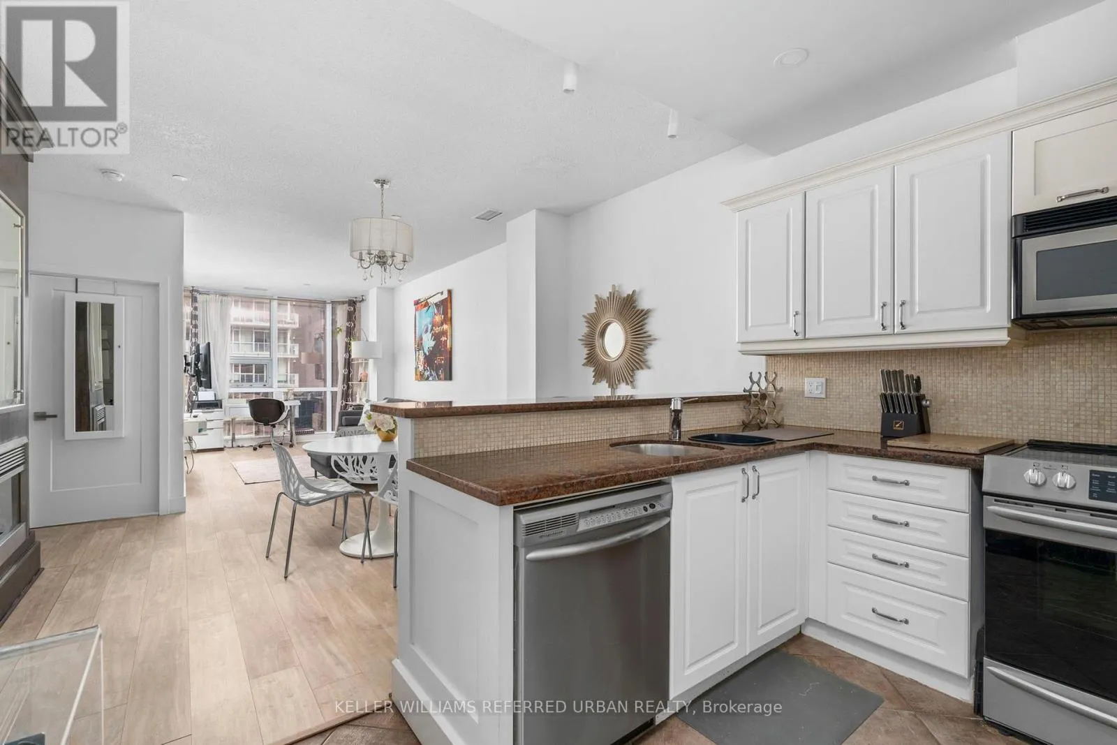 Cross Streets: King/Spadian. ** Directions: South side of King, east of Spadina. A hidden gem in the heart of King West! Discover this boutique, low-rise building ideally located just steps to transit, top restaurants, and everyday conveniences. This extensively upgraded, owner-cherished suite offers a bright, well-proportioned open-concept layout with 9-foot ceilings and a rare fireplace anchoring the living space-adding warmth and character rarely found in modern condo living. The generously sized primary bedroom is complemented by a spacious den, ideal as a home office and easily convertible into a second bedroom. Enjoy stainless steel appliances, excellent in-suite storage, and a truly exceptional convenience: an owned parking space plus a locker located just steps away on the same floor-an extremely rare and highly sought-after feature. With a Walk Score of 100 and three elevators servicing only 12 floors, this well-run, low-density building offers effortless daily living. Residents also enjoy a well-equipped fitness studio and ample visitor parking-making this a standout opportunity in one of Toronto's most vibrant neighbourhood. (id:27476)
