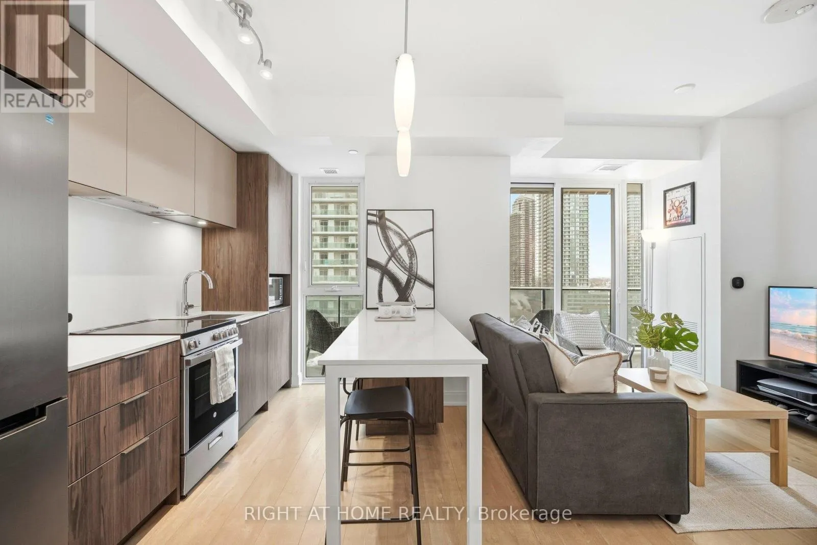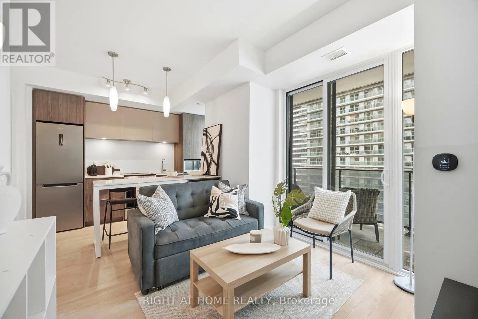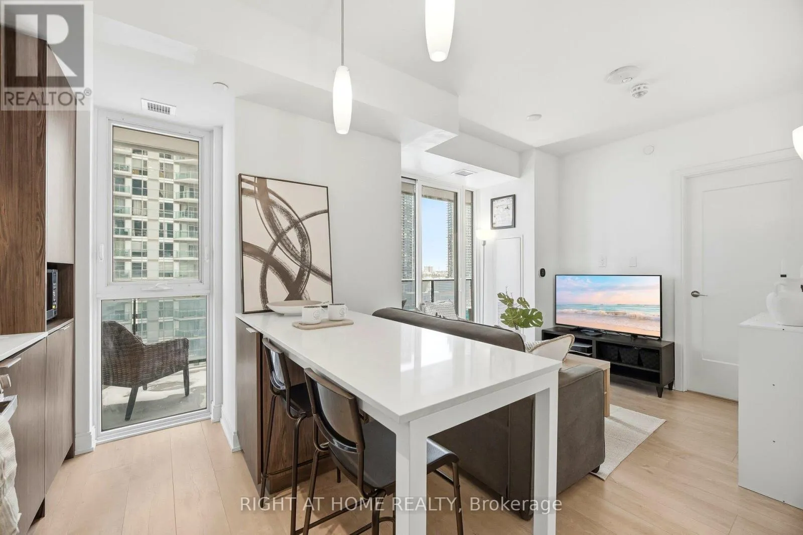 Cross Streets: Silver Moon Dr & Annie Craig Dr. ** Directions: Lakeshore Rd W & Silver Moon Dr. Experience modern lakeside living at Vita on the Lake. This stylish 1+1 bedroom, 2-bathroom condominium by Mattamy Homes offers an open-concept layout with lake and sunset views. Contemporary finishes include laminate flooring throughout and a sleek kitchen featuring granite countertops & backsplash, stainless steel appliances, and a breakfast island with upgraded ceiling lighting. Sliding glass doors in both the living room and bedroom open to a spacious 30' x 5' private balcony, with views of the waterfront setting. The primary bedroom is complete with a private ensuite bathroom featuring a glass-enclosed shower, while a separate 4-piece bathroom with tub provides added functionality.Den can be used as bedroom or office with sliding glass doors for privacy. Residents enjoy modern amenities including a fitness centre, outdoor pool, and a refined party room and billiards lounge with fireplace and large-screen TV. An expansive terrace with outdoor barbeque area, lounge seating, and gas firepit creates an ideal setting for entertaining and relaxing with views of the lake.Located within walking distance to local lakeside restaurants and cafés La Vecchia, Firkin on the Bay pub, Eden Trattoria, San Vito cafe, scenic walking and biking trails, nearby parks, and the beach-offering the best of waterfront living and outdoor lifestyle. Transit at your doorstep.Walk to nearby shopping Metro, Shoppers drugmart, LCBO for all your needs. Mimico Go train to Union Station in 15 min. Pet friendly condo enjoy walks with your dog by the waterfront. Dog wash station on main floor. (id:27476)