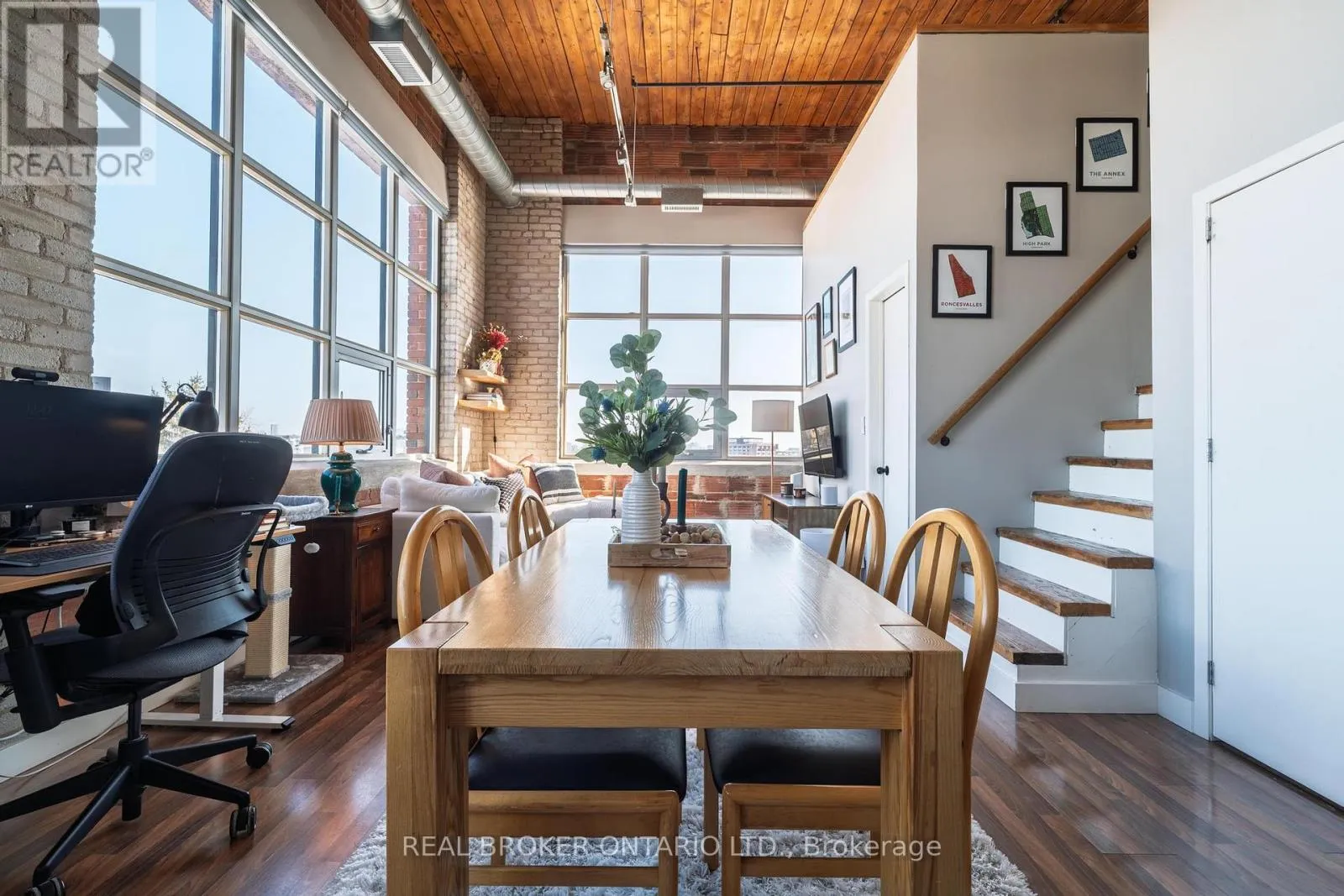 Dundas West & Bloor West Like No Other, This Authentic 2 storeys Loft Combines 699 Sq Ft, With 14 Foot Ceiling Steps away from Roncesvalles. Bright & Authentic Design Scheme With Understated Yet Distinctive Original Details. The Expansive Living-Room And Dining-Room Spans Over 29 Feet In Lenght and 20 Feet in Width, And Features Oversized Windows Overlooking Mature Trees With Southeastern Exposure. City Views to admire as well, as if it was not Magical enough... Open concept throughout W Kitchen Island and SS Appliances. This Loft can also pride itself to be a Penthouse And a Corner Unit, which is, all in all, Absolutely Extraordinary. Convenientlty located steps away from trendy shops, restaurants and coffee bars, the Subway and the Go Train. It can be Yours, a Unique and Timeless Loft that inspires you to live out your Best Dream ... (id:27476)