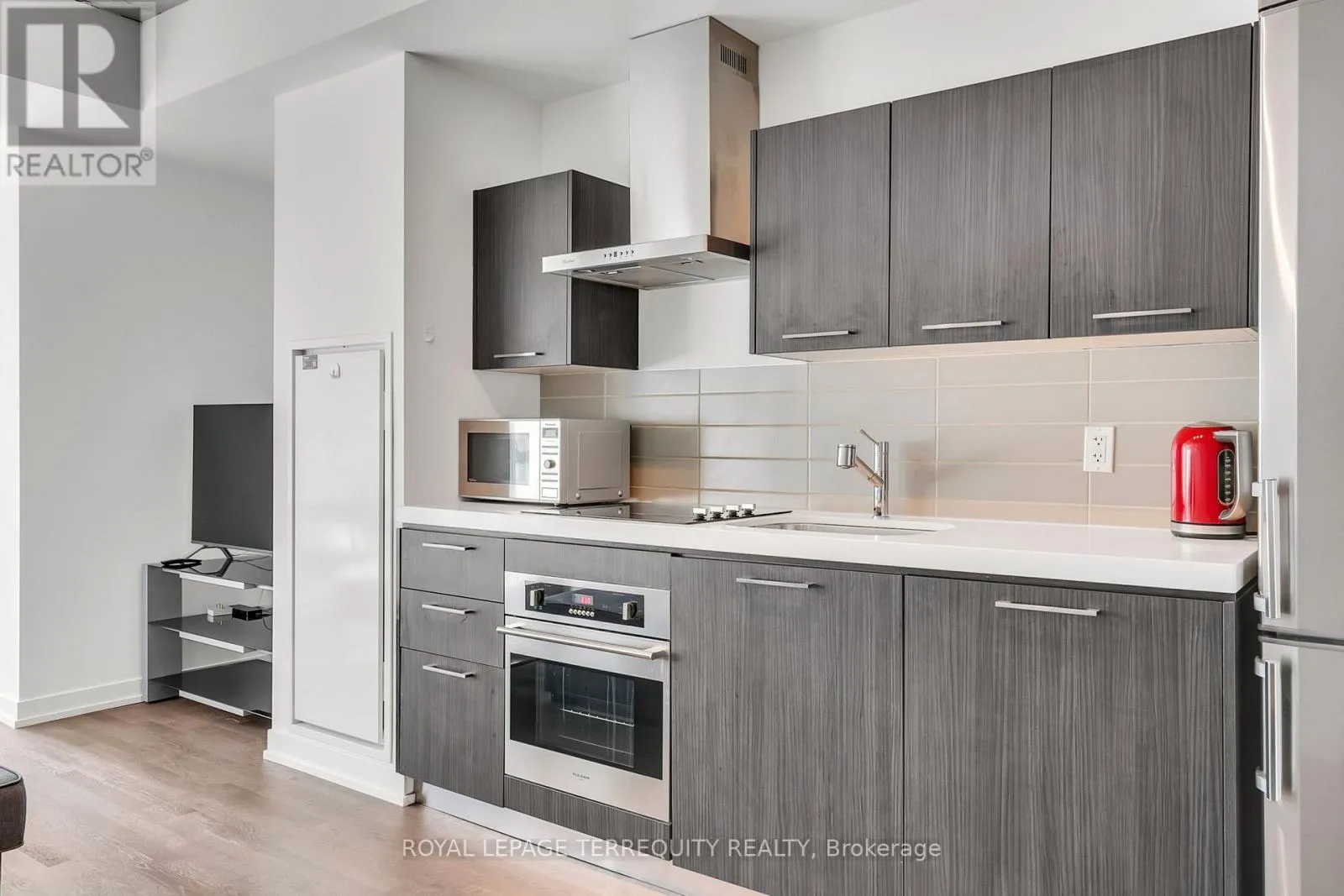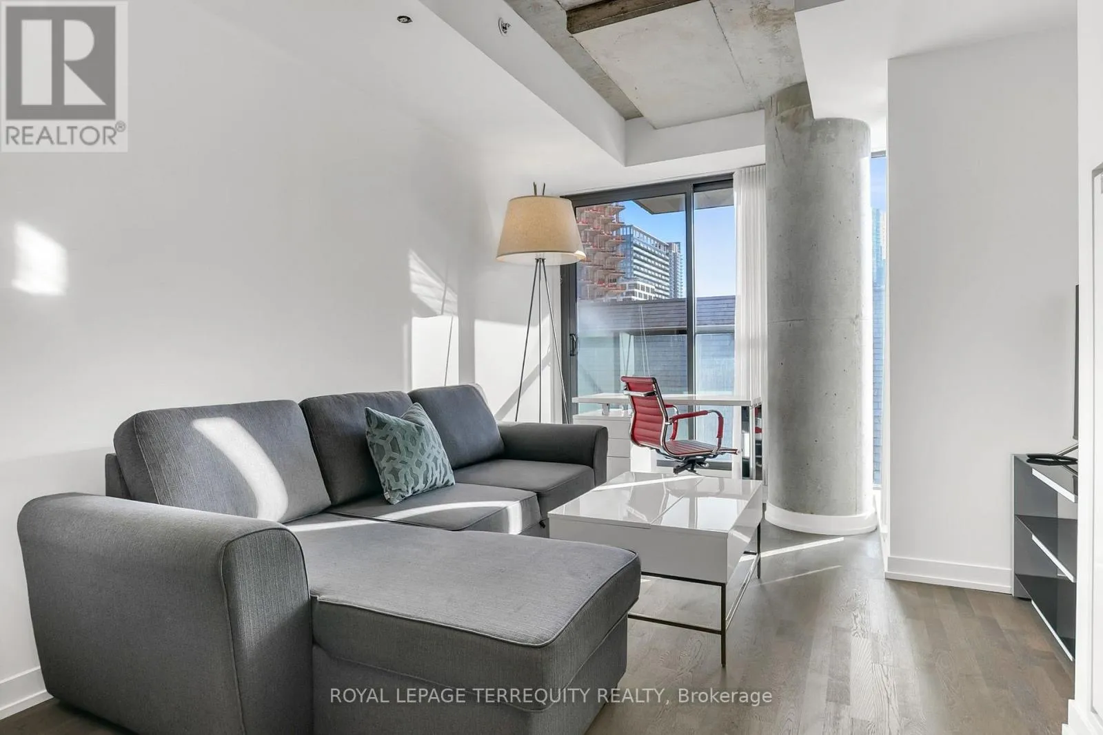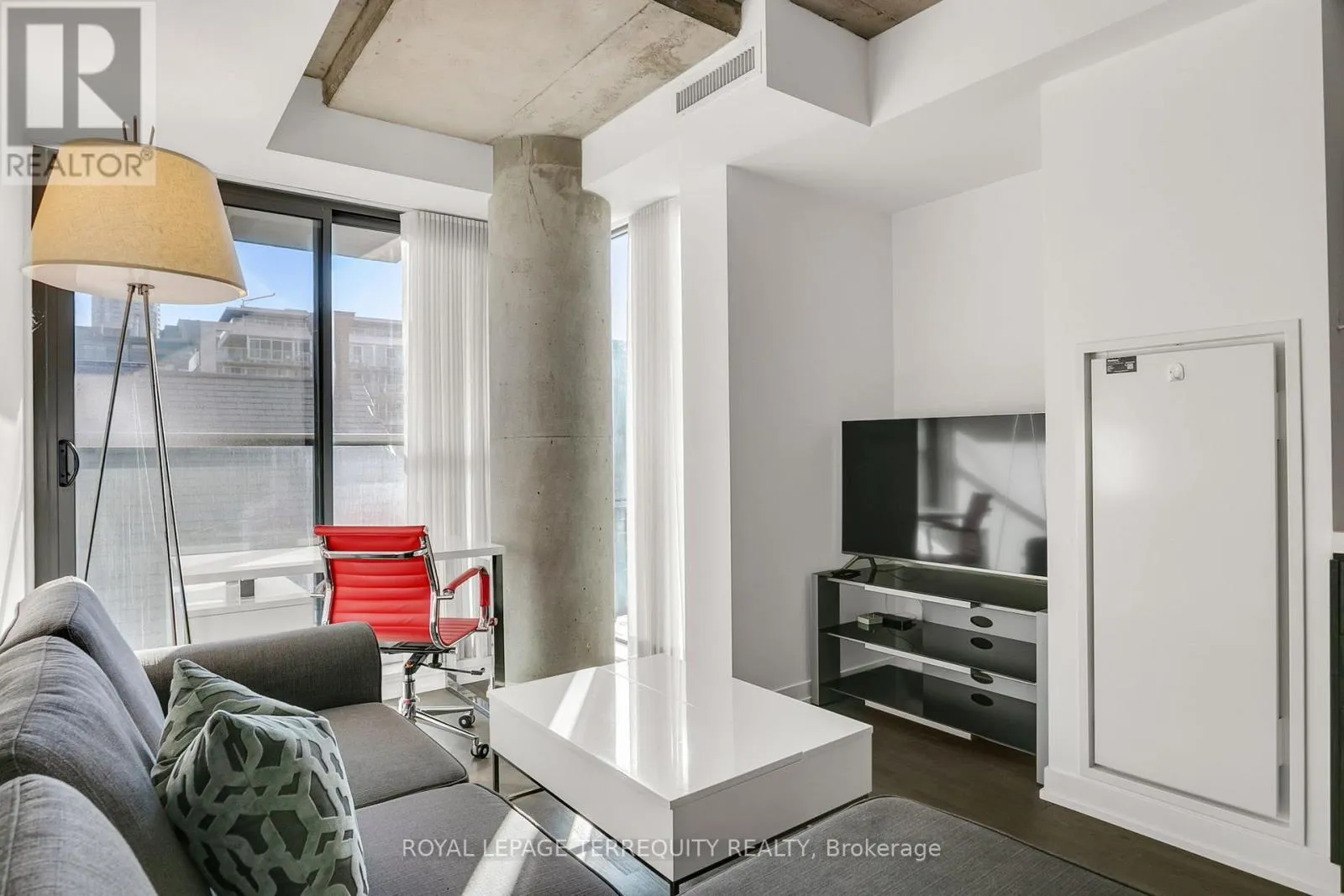 Cross Streets: King & Spadina. ** Directions: King west of Spadina. Welcome to FASHION HOUSE, a much coveted boutique building located in prime King West, just west of Spadina. Fabulous 573 sq ft well designed studio suite with defined bedroom area, with room for entertaining and work-from-home space. This loft style suite has high concrete ceilings, with luxury finishes throughout. Quality engineered hardwood floor run through all principal rooms, the kitchen is open concept with built-in appliances,. The suite is always bright, with floor to ceiling windows with juliette balcony that allows ample natural light and fresh air. The primary bedroom has a large double closet with closet organizers, another closet in the main hallway. This stylish boutique building has superb amenities: 24 hr concierge, well equipped gym, party/meeting room, and a stunning rooftop infinity pool and terrace with incredible views of the downtown skyline! Ideal King West location, just steps to transit, shops, top restaurants, trendy bars, shopping and more. Modest maintenance fees include water, heat, A/C and a storage locker. Don't miss this fabulous opportunity...perfect for a first-time buyer or downtown pied-a-terre for those living out of the city. Welcome home !! (id:27476)