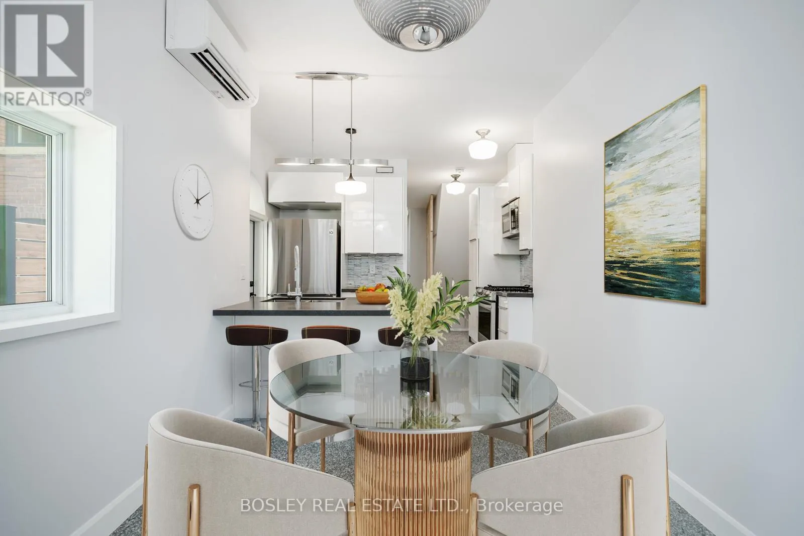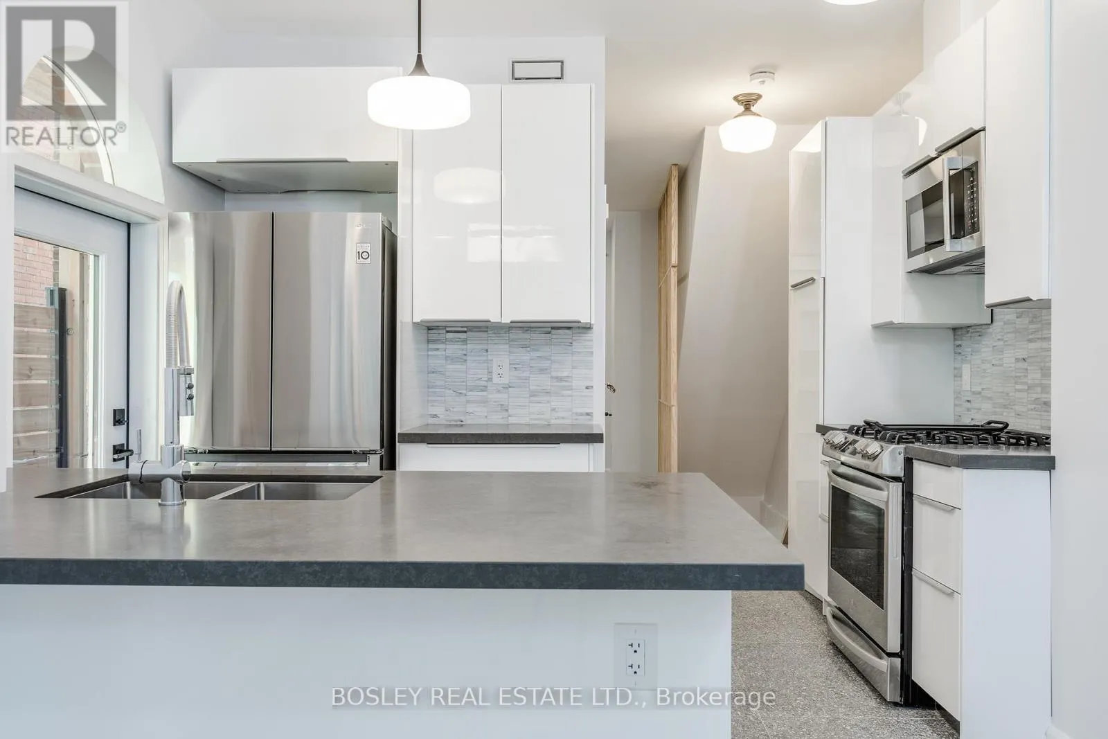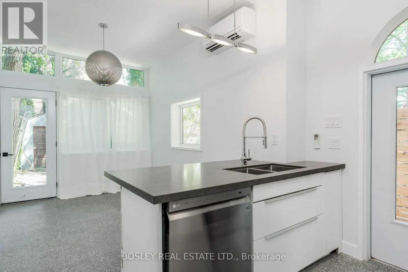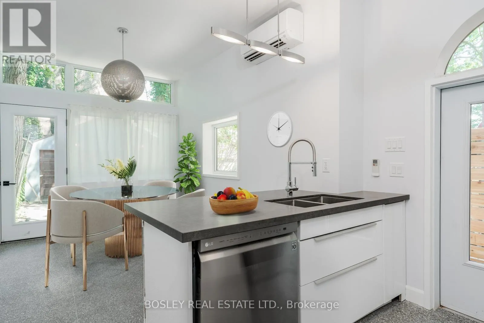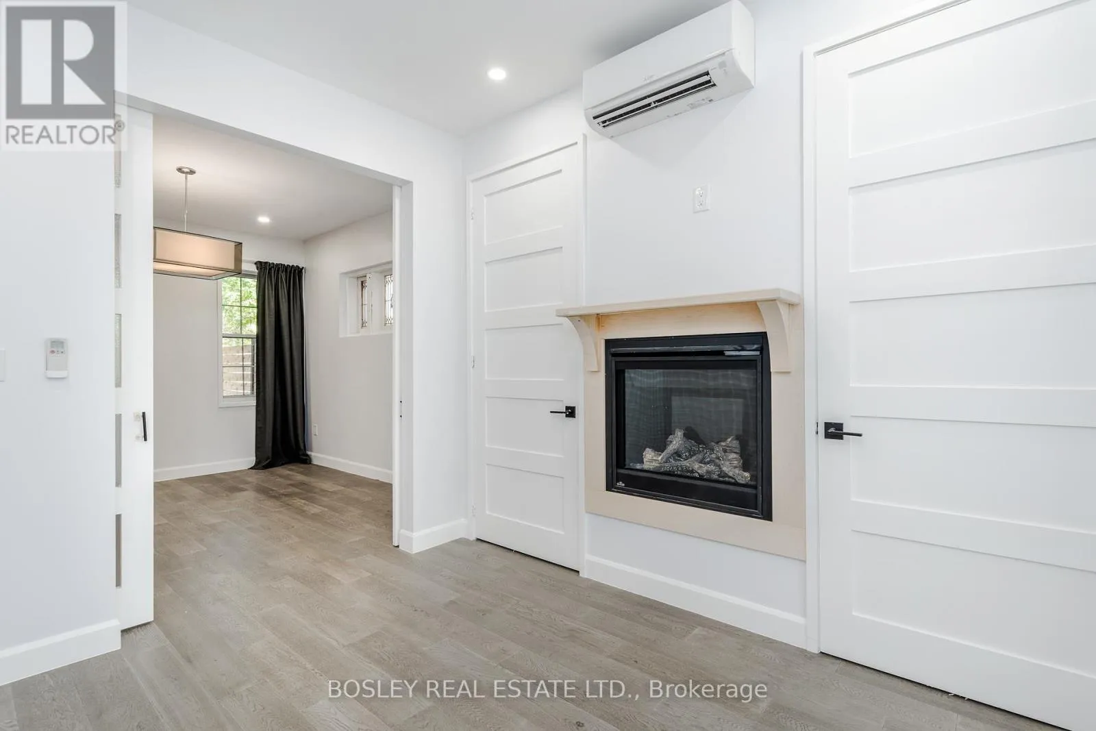 Cross Streets: Near Queen St East & Lee Ave. ** Directions: Drive one way north from Queen St East. Green P lot parking avail. @ Queen & Wineva Ave. Architecturally designed and masterfully renovated in 2022, this 1,260 sq ft, 2-storey home seamlessly blends clean Scandinavian lines with Mid-Century modern luxury. On the Main level, high 9'6" ceilings provide an airiness of space, while radiant heated floors throughout will keep your feet toasty-warm when it's chilly out. You'll stay comfortable with 2 air conditioning & heat pump units (in the Kitchen & Primary Bedroom), and you'll breathe easier with the Heat Recovery Ventilation (HRV) fresh air system. The bright, eat-in Kitchen is designed for both function & connection, with a dedicated dining area, breakfast bar, stainless steel appliances, and a gas stove ideal for home chefs. Southeast-facing corner windows flood this space with natural light. The Living Room offers perfect balance between old-world charm & contemporary style, showcasing original stained-glass windows, modern sliding barn doors to the bedroom, and a vertical wood-slat feature overlooking the open stairwell. The Main Floor Primary Bedroom is a serene retreat, complete with gas fireplace, double closets, and a walk-out to a private, tree-shaded front patio. Downstairs, the fully finished Basement level offers exceptional versatility with 2 spacious bedrooms with large closets, a cozy den/home office, and a 5-piece, family-friendly bathroom with double sinks and separate toilet/bathing area for added privacy. A dedicated laundry hallway includes full-sized side-by-side washer and dryer, double sink, and chic storage cabinetry . Modern, slim-profile wall radiators in every room provide comfortable warmth throughout. Steps away to Kew Gardens, Kew Beach, the Boardwalk, Schools, Recreation Centre, Library, and all of the vibrant shops, cafés & restaurants along Queen Street. This culturally rich, beachside neighbourhood offers a peaceful residential setting, with quick & easy access to the city's busy downtown core. This is it, come live your best life by the beach! (id:27476)