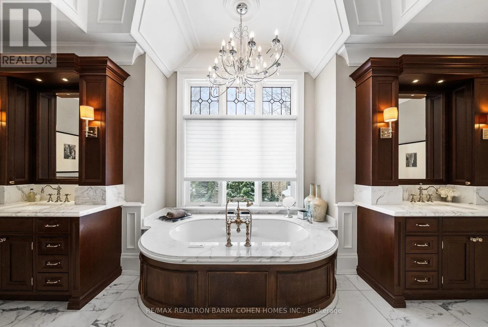 Cross Streets: Bayview Ave/Lawrence Ave E. ** Directions: West of Bayview. A rarely offered Lawrence Park residence of exceptional craftsmanship and architectural pedigree, available for the first time since 2012. Designed by renowned architect Lorne Rose with interiors by Carey Mudford, this distinguished Tudor-style home sits on a prime 50 x 150 ft lot and offers approximately 5,500 sq ft of beautifully finished living space. The striking Indiana limestone and brick façade, cedar shingle roof, leaded glass windows, copper detailing, and hand-crafted stone portico create timeless curb appeal. A heated driveway, steps, porch, and walkways ensure year-round comfort, complemented by mature landscaping, irrigation, exterior lighting, and integrated security. Inside, refined detailing defines every space, including 10ft ceilings on the main level, 9 ft ceilings above and below, heated marble floors, custom millwork, coffered ceilings, rich hardwood flooring, and sound-insulated construction. Principal rooms flow seamlessly for both elegant entertaining and everyday family living. The chef's kitchen features premium appliances, bespoke cabinetry, and opens to an oversized family room with walk-out to a private stone terrace. The upper level offers generously proportioned bedrooms and spa-inspired baths, highlighted by a luxurious primary retreat with vaulted ceilings, marble finishes, steam shower, and private outdoor access. The fully finished lower level with radiant heated floors provides exceptional versatility, including a large recreation room with walk-out, wet bar, wine cellar, guest or nanny suite, and extensive storage. Thoughtfully maintained and continuously upgraded, the home delivers enduring quality and modern reliability. Complete with a rare three-car secure garage, this is an exceptional opportunity just moments to Toronto's top schools, the Granite Club, Bayview Avenue, Highway 401, and surrounding parks, a truly special offering in one of the city's most coveted family neighbourhoods. (id:27476)