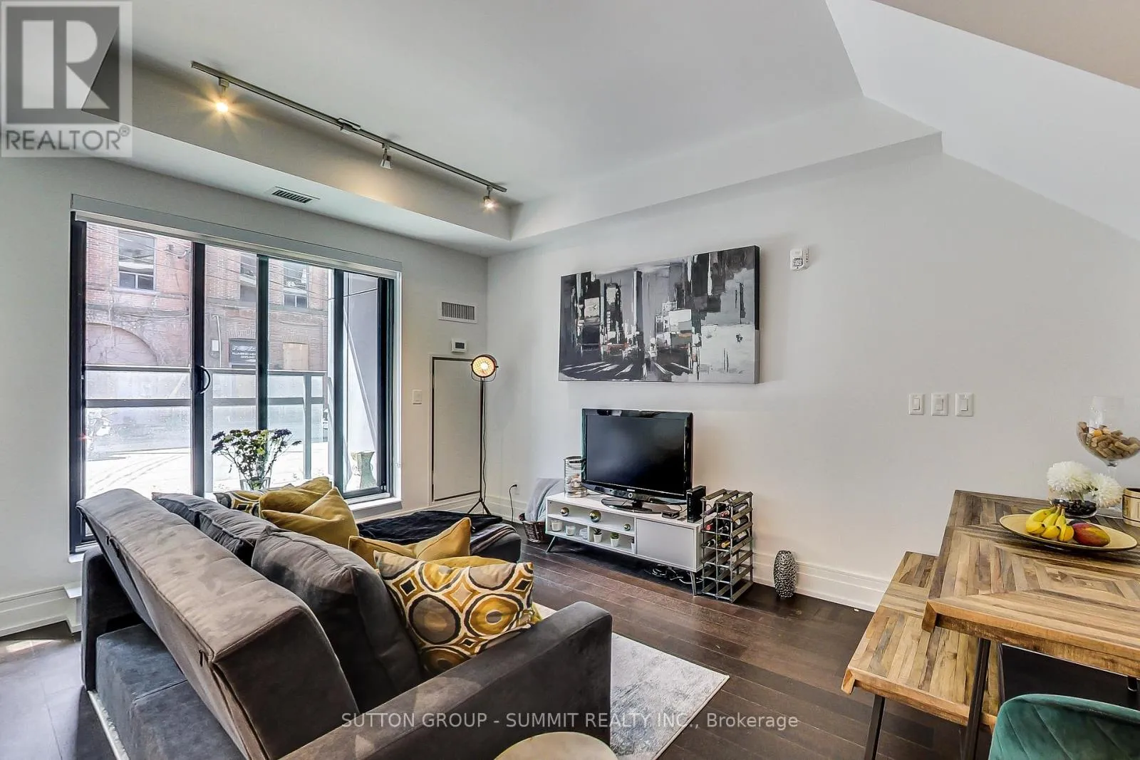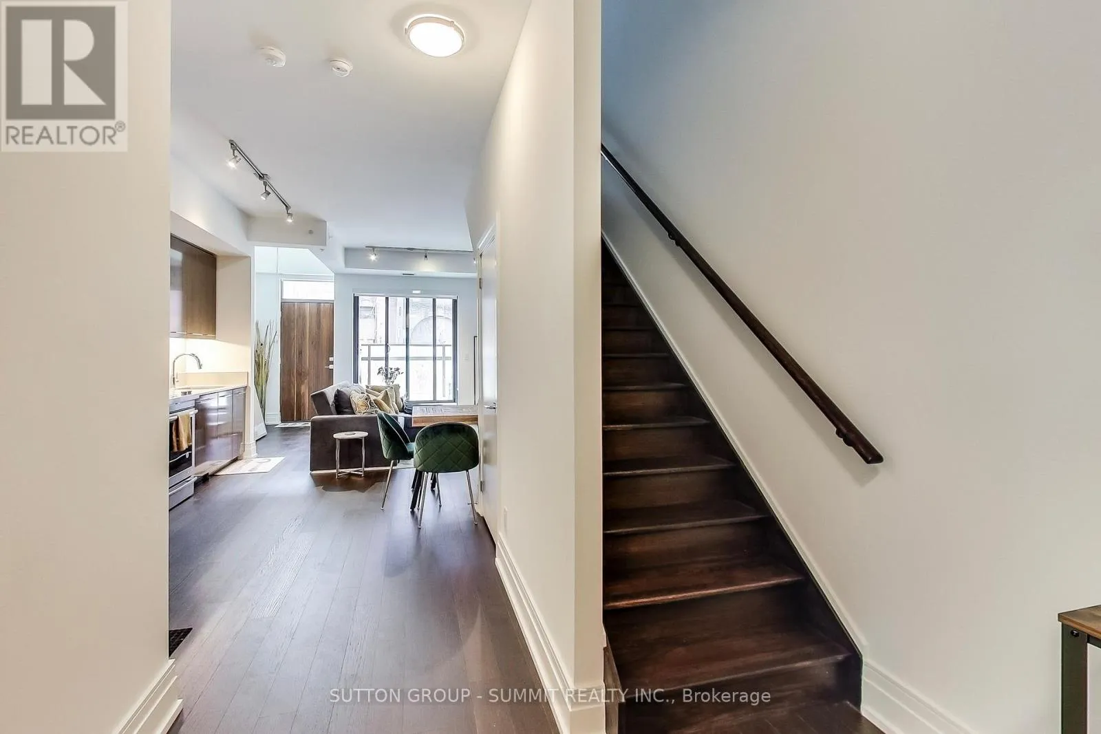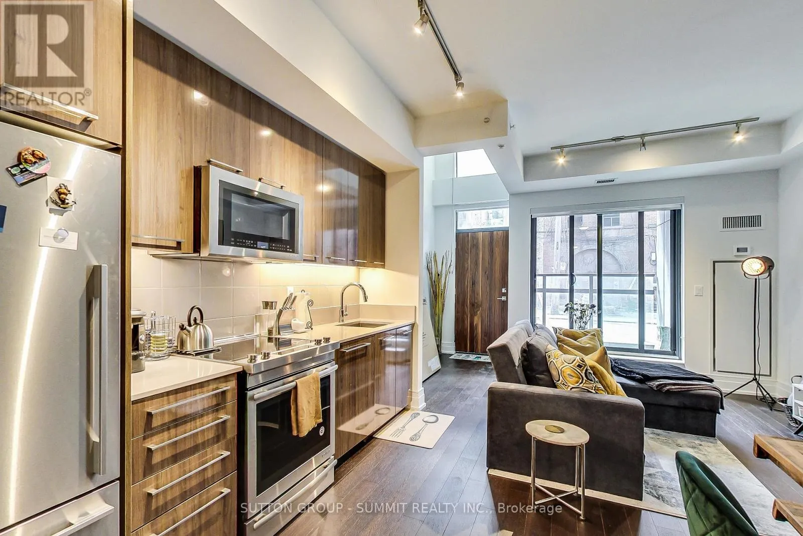 Bathurst St & Wellington St W Boutique townhouse living in the heart of King West. This two-storey boutique residence offers private dual entrances, soaring 9-10 ft ceilings, and two sun-filled balconies that flood the space with natural light. The open-concept living and dining area extends seamlessly outdoors and is anchored by a sleek kitchen with European-style cabinetry, quartz countertops, and premium full-size Bosch appliances. Featuring two bedrooms and two full bathrooms, the spacious primary suite includes a luxurious ensuite and oversized walk-in closet, while the second bedroom enjoys its own private balcony. Parking is included. (id:27476)