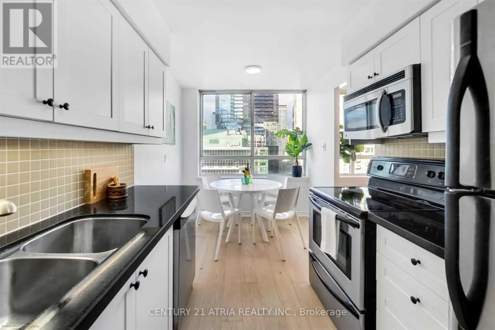 Cross Streets: Bay St./Dundas St. W. ** Directions: NE Corner of Bay/Edward. Bright and spacious freshly painted corner suite featuring 2 br and 2 baths in the heart of Toronto. Functional eat-in kitchen with large windows and stunning panoramic city views. Wide-plank laminate flooring throughout. Includes rare tandem underground parking for 2 cars - a true downtown bonus! Unbeatable location steps to UofT, TMU, Eaton Centre, hospitals, Financial District, subway, restaurants, and everything downtown has to offer. Non-smoking building. Single family household (no unrelated roommates). (id:27476)