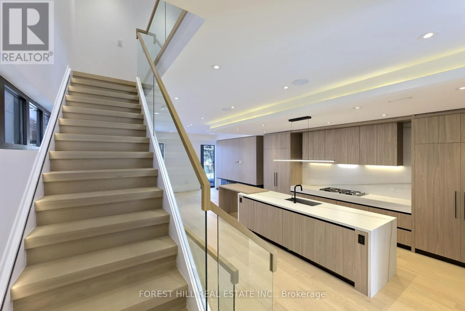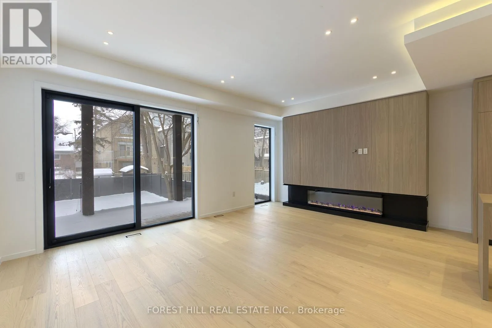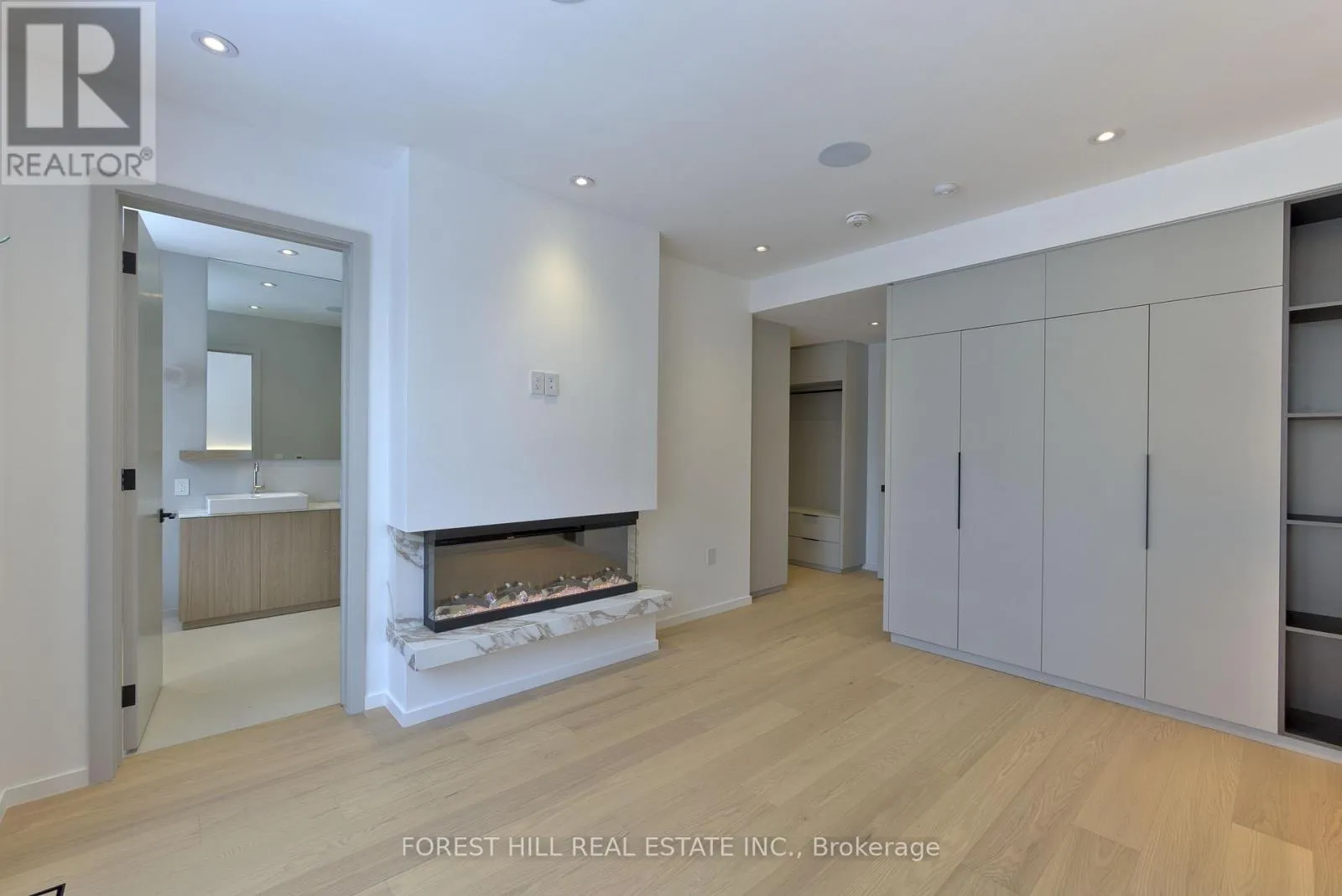 Cross Streets: Yonge/Sheppard. ** Directions: Yonge Sheppard. Experience refined luxury living in this stunning modern home on an exceptionally rare 27.5-foot lot. Boasting four bedrooms-each with a private ensuite-this residence blends modern living with everyday comfort. A heated foyer welcomes you into a living and dining area highlighted by wide-plank hardwood flooring and floor to ceiling windows. The house is operated by Control 4 smart home system and covered by security cameras.The gourmet kitchen showcases Miele built-in appliances including cooktop, oven, microwave, and integrated refrigerator with freezer, all complemented by soft-close cabinetry with Blum hardware and a striking waterfall island with a breakfast nook. The family room offers a 72" electric fireplace, built-in wall unit, surround-sound rough-in, and expansive patio doors opening onto a covered composite deck-perfect for year-round entertaining with BBQ rough-in and integrated speaker system.Retreat to the serene primary bedroom featuring a custom walk-in closet, integrated headboard with niche lighting, modern fireplace with TV rough-in, and a spa-inspired five-piece ensuite complete with heated floors and House of Rohl fixtures. Each additional bedroom includes its own ensuite and built-in closet.The fully finished basement is designed with radiant heating, a full custom kitchen with elegant AGT finishes, quartz surfaces, and a private bedroom suite-ideal for extended family or guests. With parking for up to five vehicles and exceptional craftsmanship throughout, this home defines contemporary elegance in every detail.Conveniently located in family friendly neighborhood, close to transit, grocery stores, variety of restaurants and easy access to the 401. (id:27476)