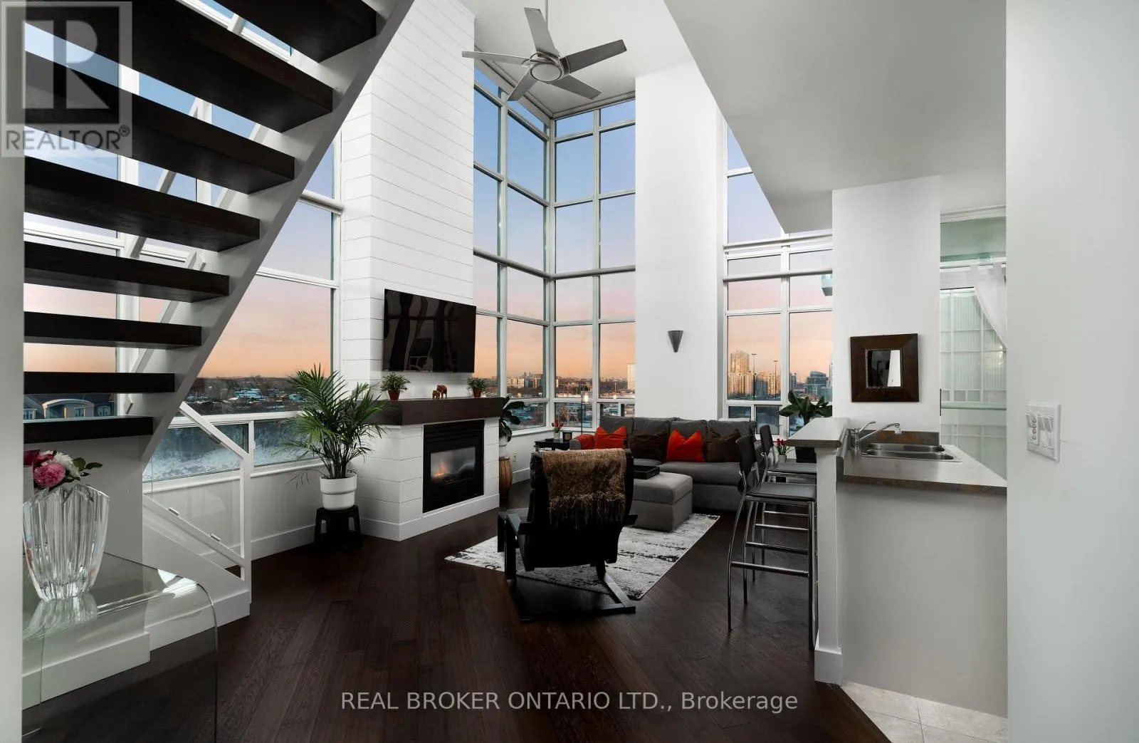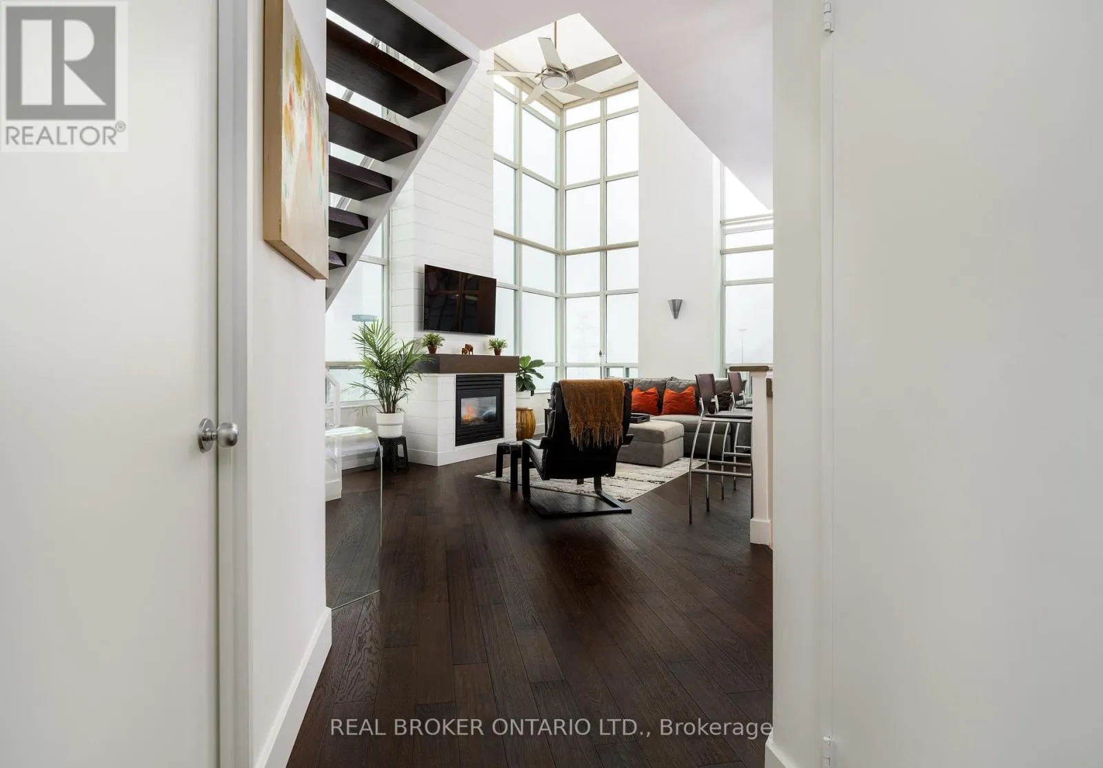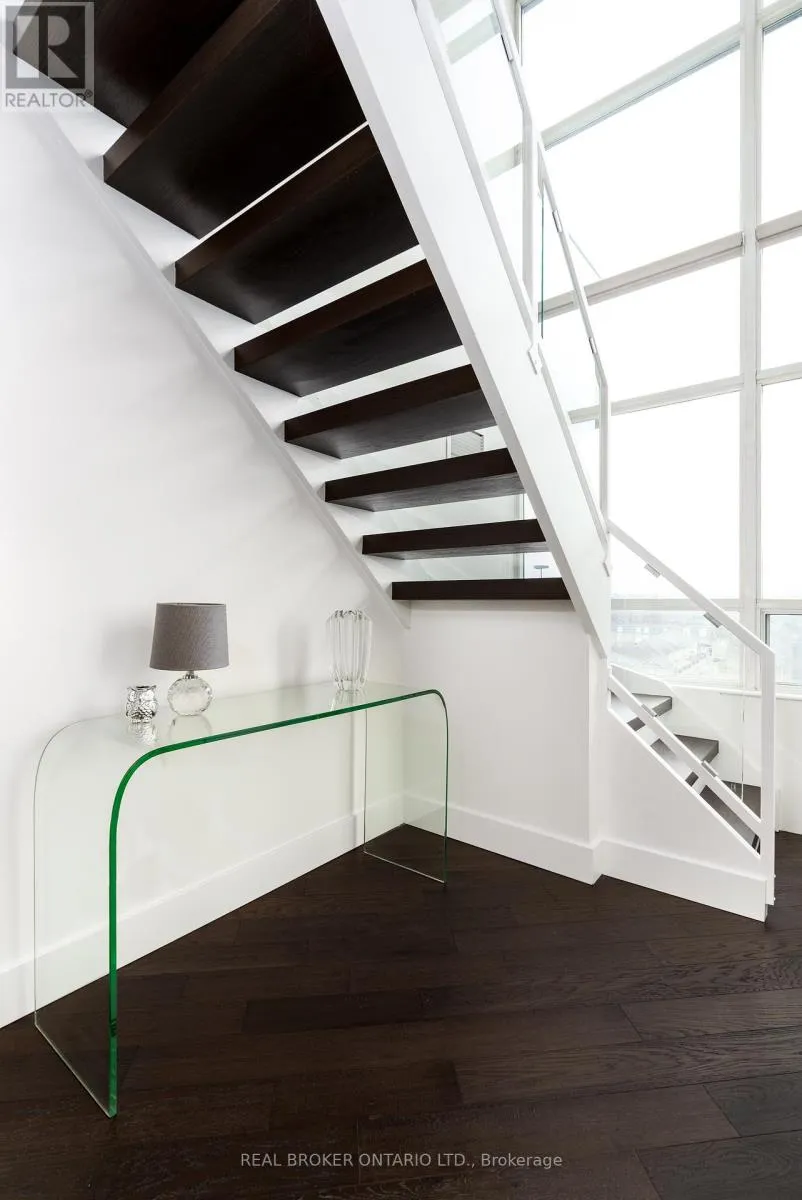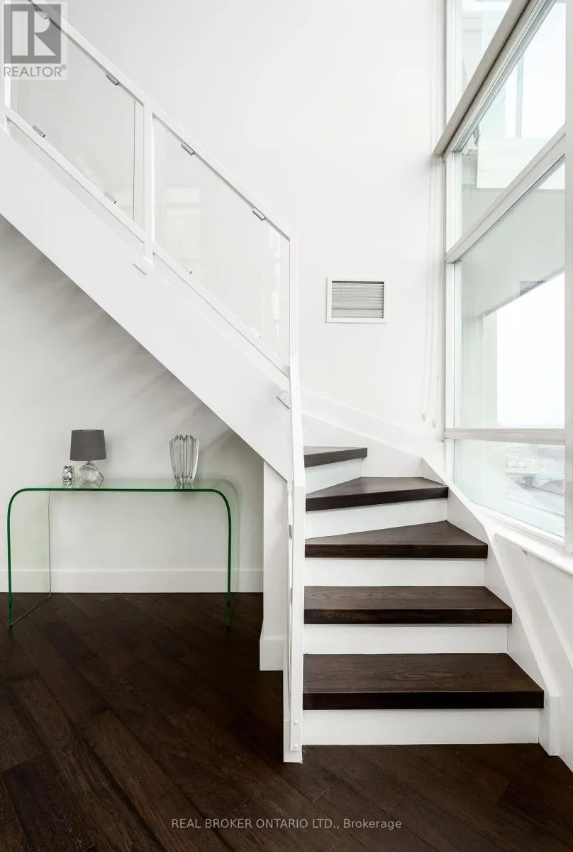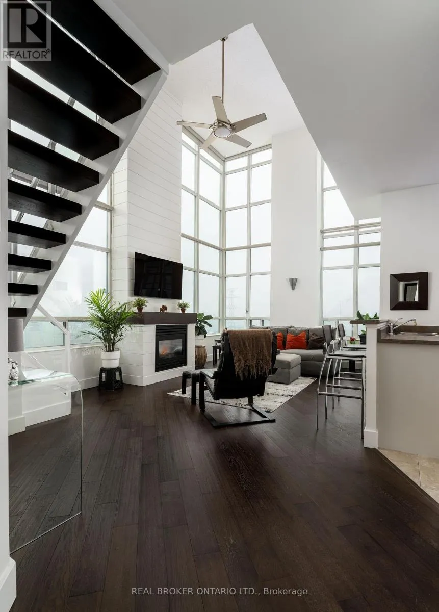 Grand St / Manitoba St Welcome to this stunning loft-style residence offering almost 1,400 sq ft of bright, open living in one of Toronto's most sought-after waterfront communities. This rare 2-bedroom + den, 2 full bath suite combines house-like space with dramatic design, featuring 17-ft floor-to-ceiling windows that flood the home with natural light and showcase unobstructed panoramic views.The open-concept main level is perfect for entertaining, highlighted by walnut hardwood flooring, a custom staircase, and a statement fireplace that anchors the living space. The thoughtfully designed layout includes a versatile den ideal for a home office or guest area. The spacious primary retreat features a custom walk-in closet and private 4-piece ensuite, offering both comfort and functionality. Enjoy seamless indoor-outdoor living with the rare bonus of three private balconies, plus the convenience of one parking space and a large locker on P1. Residents enjoy exceptional amenities including a rooftop garden, BBQ area, party & billiards room, gym, sauna, and squash court. Ideally located steps from waterfront trails, transit, shops, and cafes, with the new 12-acre Grand Avenue Park nearby adding even more green space to this vibrant community. A truly unique loft offering size, style, and lifestyle in one exceptional package. (id:27476)