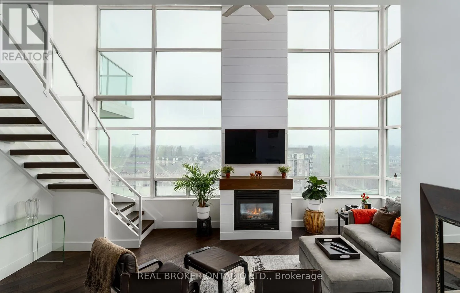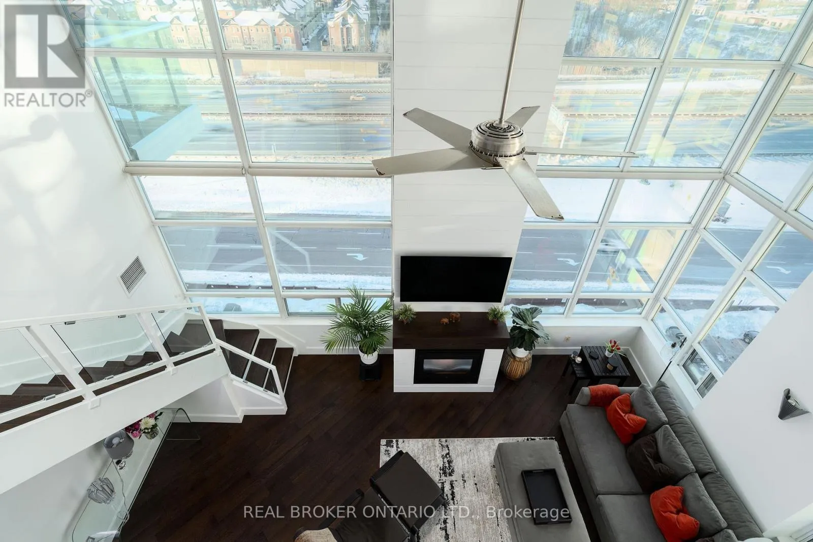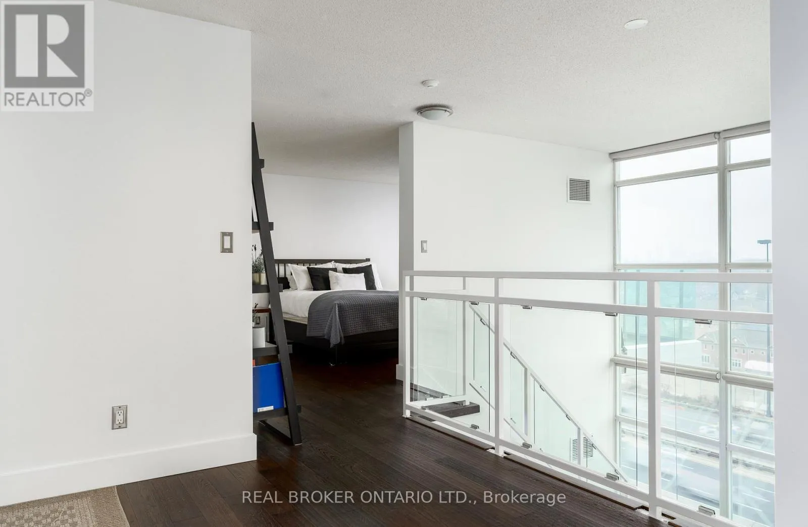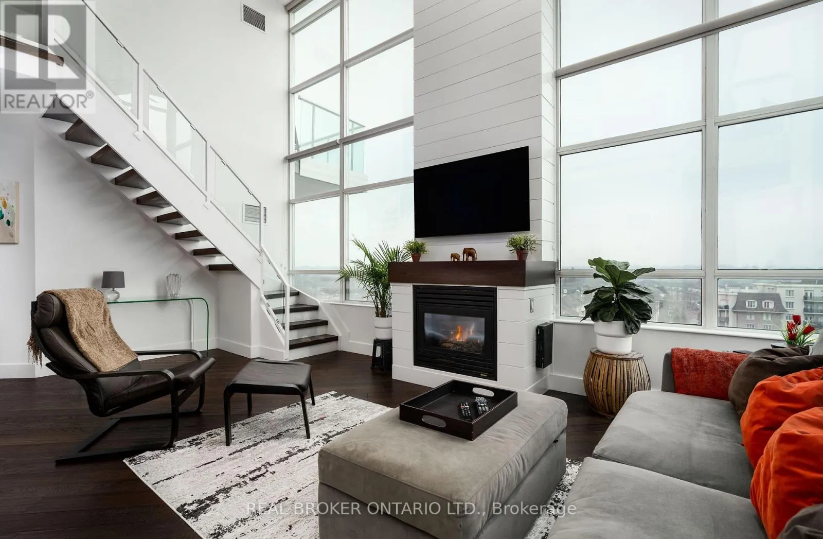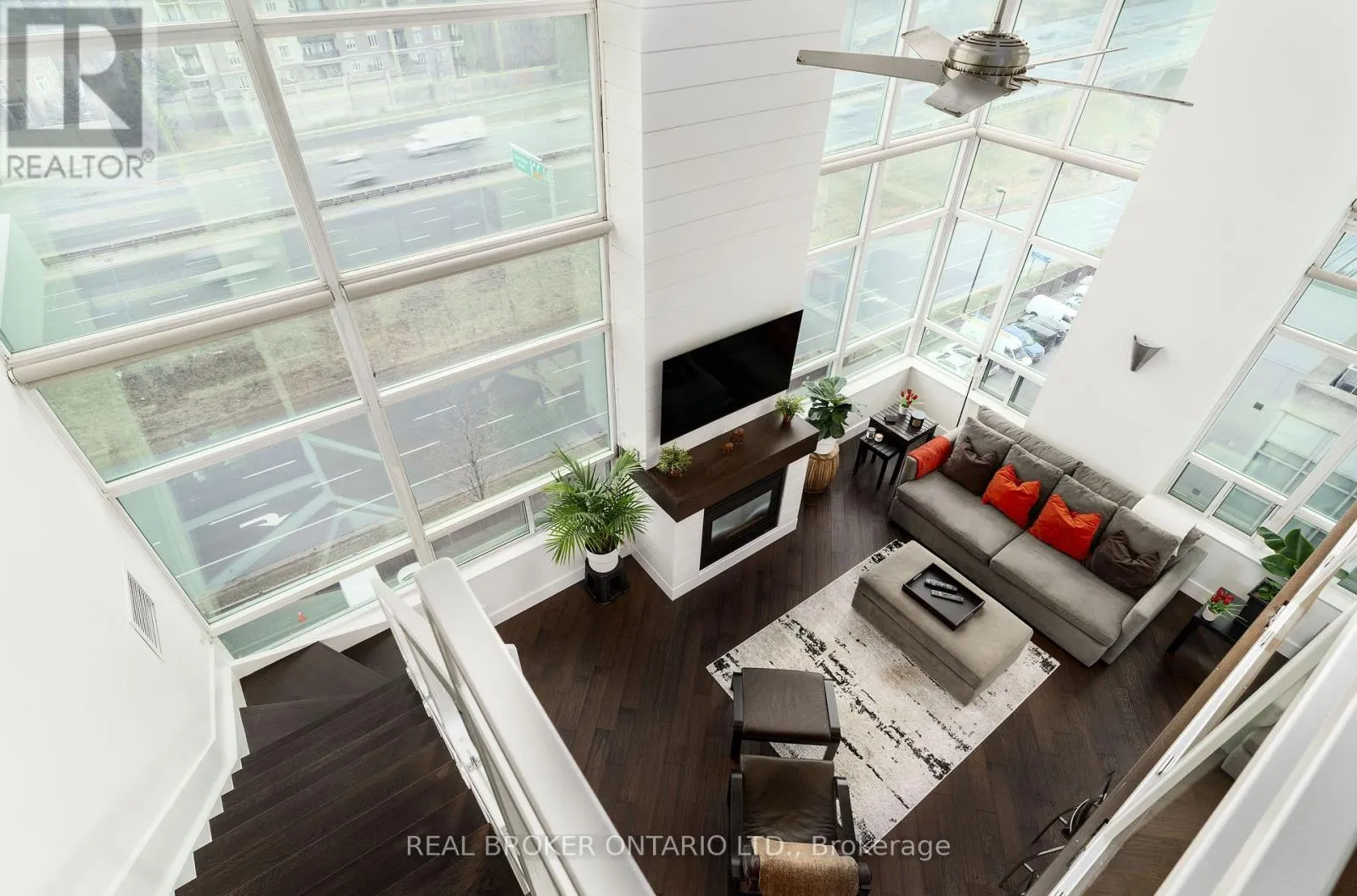 Grand St / Manitoba St Welcome to this stunning loft-style residence offering almost 1,400 sq ft of bright, open living in one of Toronto's most sought-after waterfront communities. This rare 2-bedroom + den, 2 full bath suite combines house-like space with dramatic design, featuring 17-ft floor-to-ceiling windows that flood the home with natural light and showcase unobstructed panoramic views.The open-concept main level is perfect for entertaining, highlighted by walnut hardwood flooring, a custom staircase, and a statement fireplace that anchors the living space. The thoughtfully designed layout includes a versatile den ideal for a home office or guest area. The spacious primary retreat features a custom walk-in closet and private 4-piece ensuite, offering both comfort and functionality. Enjoy seamless indoor-outdoor living with the rare bonus of three private balconies, plus the convenience of one parking space and a large locker on P1. Residents enjoy exceptional amenities including a rooftop garden, BBQ area, party & billiards room, gym, sauna, and squash court. Ideally located steps from waterfront trails, transit, shops, and cafes, with the new 12-acre Grand Avenue Park nearby adding even more green space to this vibrant community. A truly unique loft offering size, style, and lifestyle in one exceptional package. (id:27476)