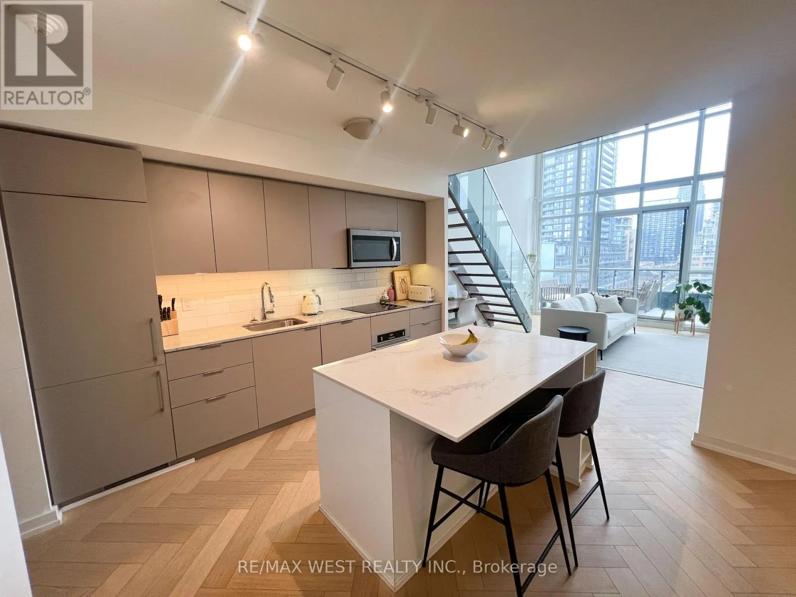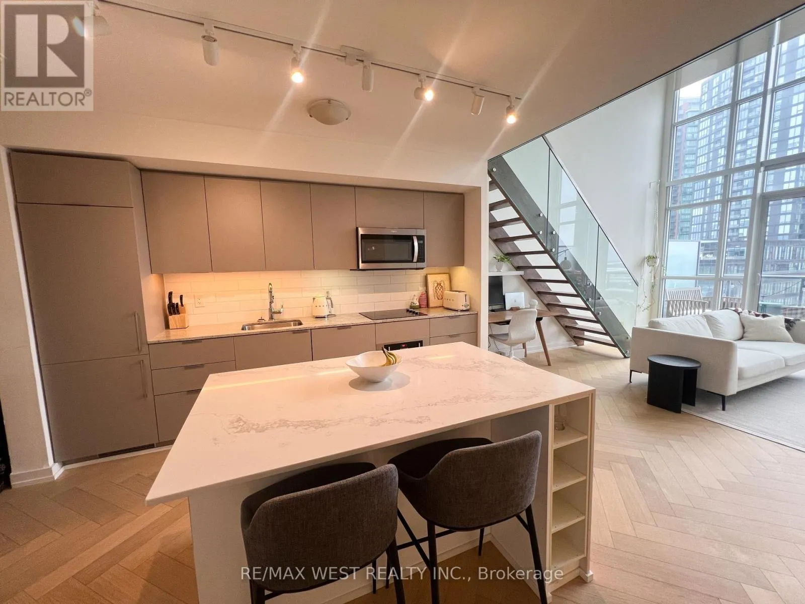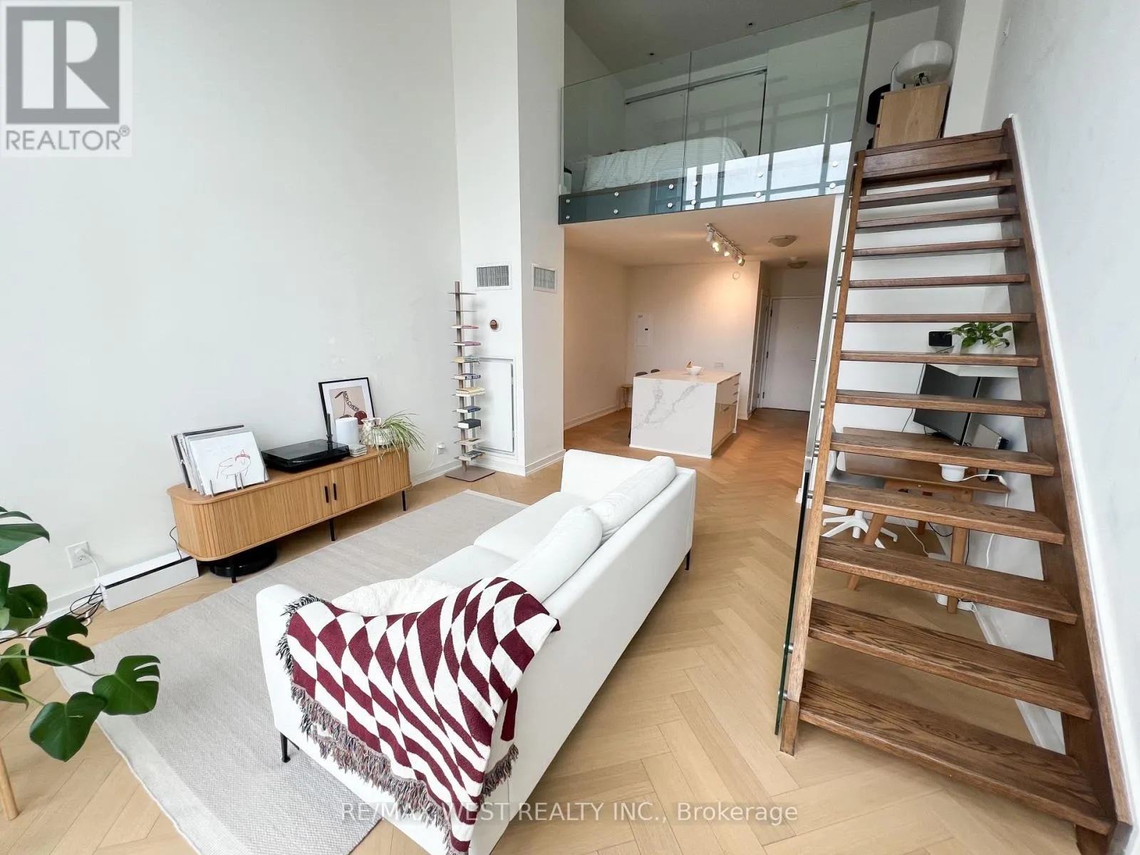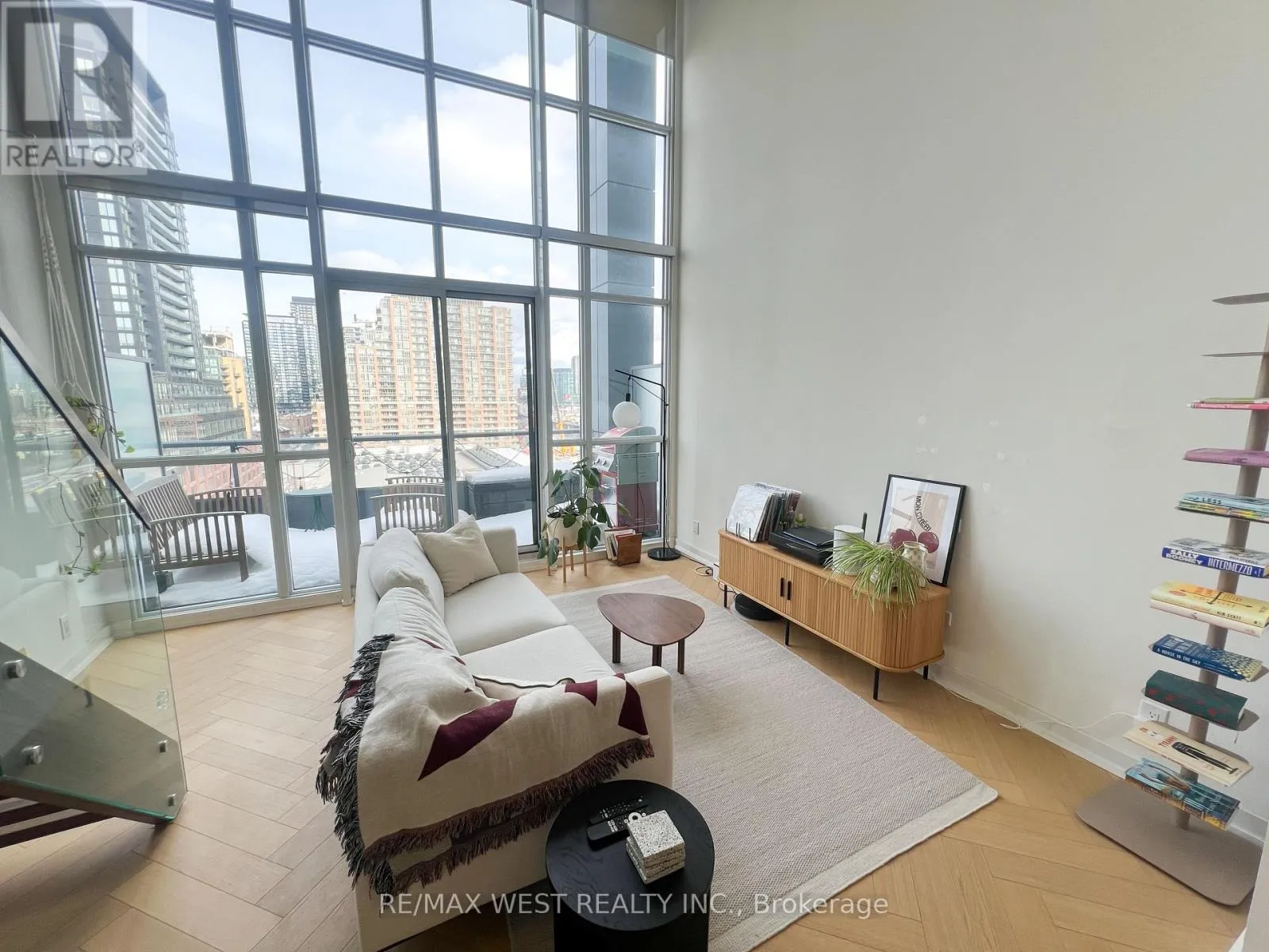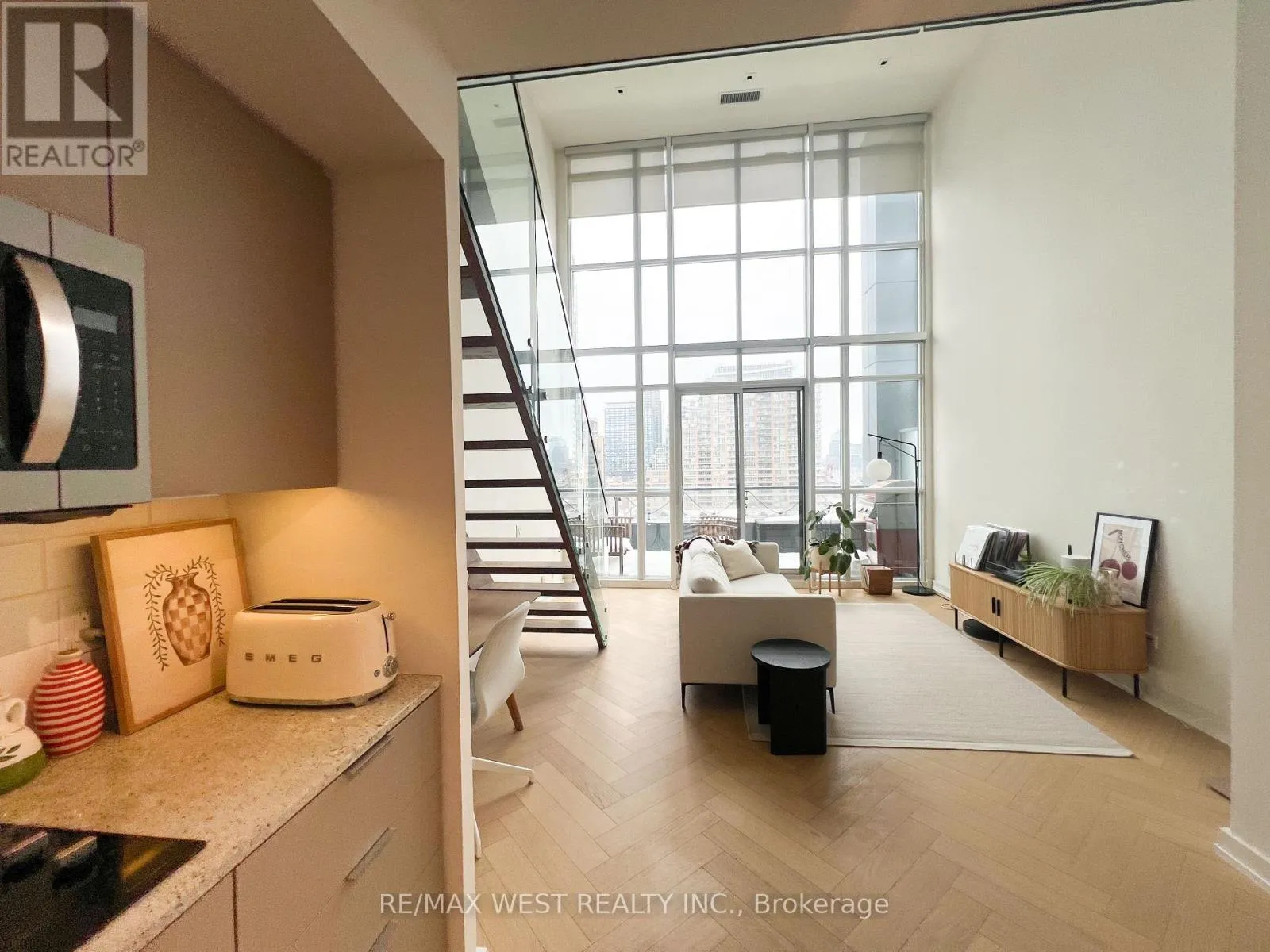 Hanna and East Liberty Welcome to elevated urban living at Liberty Market Lofts. This sub-penthouse level, east-facing suite offers an unobstructed, private view towards the city and of Lake Ontario.Soaring 17 foot ceilings flood the space with natural light all day, offering incredible sunrise and sunset views from both levels and your large, private terrace.The unit is upgraded with oak herringbone floors, pot lights, motorized window covers, and custom California Closets.The large waterfall kitchen island is perfect for entertaining or working from home, with an onsite business centre also available as an option.This unique loft building offers great amenities, including 24/7 concierge, guest suites, basketball court, a fully equipped modern gym, and a barre studio.Located steps from Liberty Market, Ossington, Trinity Bellwoods, and King West, as well as multiple transit options (TTC and GO train), and walkable to lakeshore and downtown.A must see unit in one of Toronto's most sought after lofts. (id:27476)