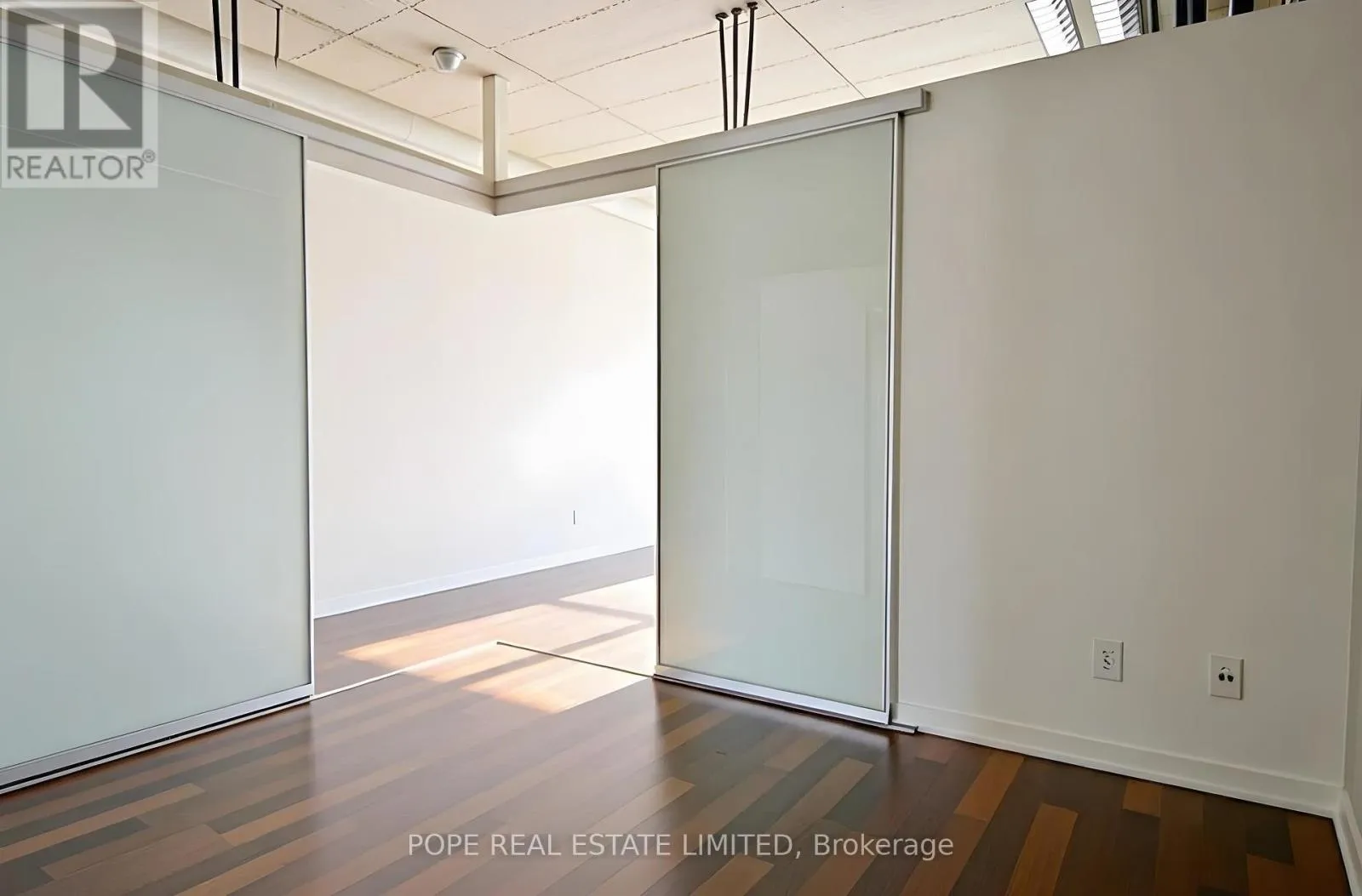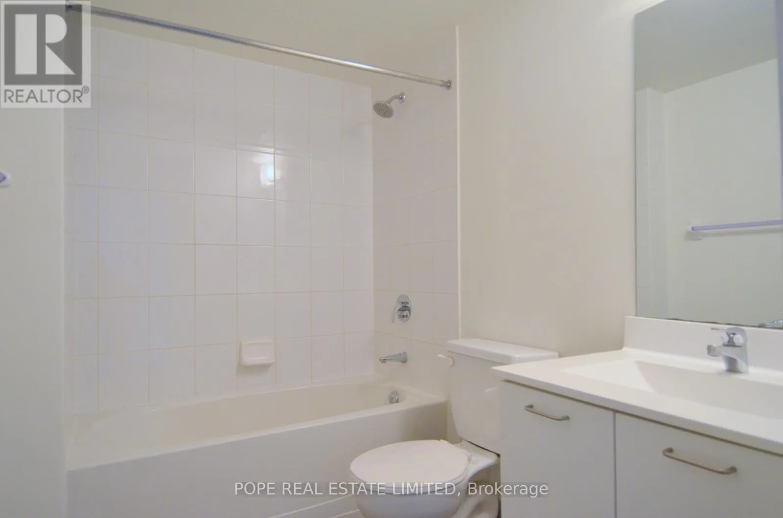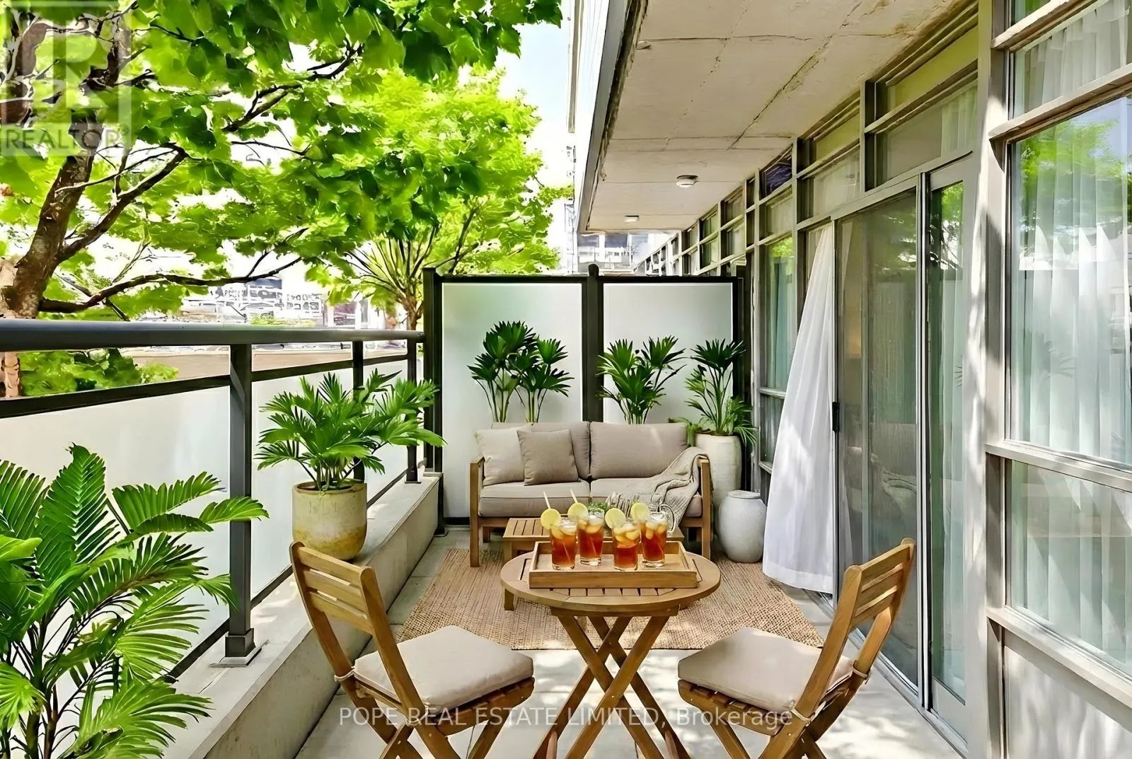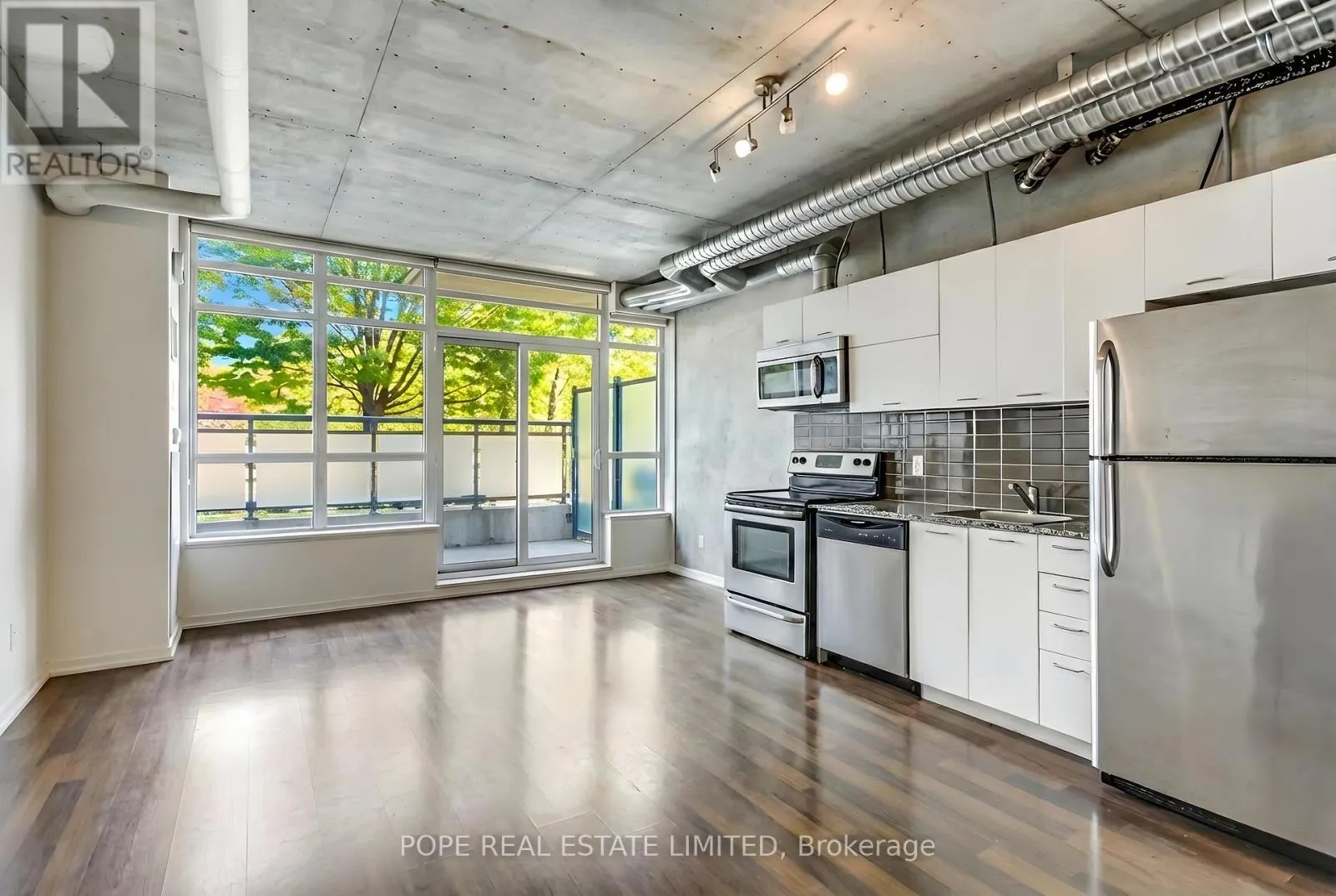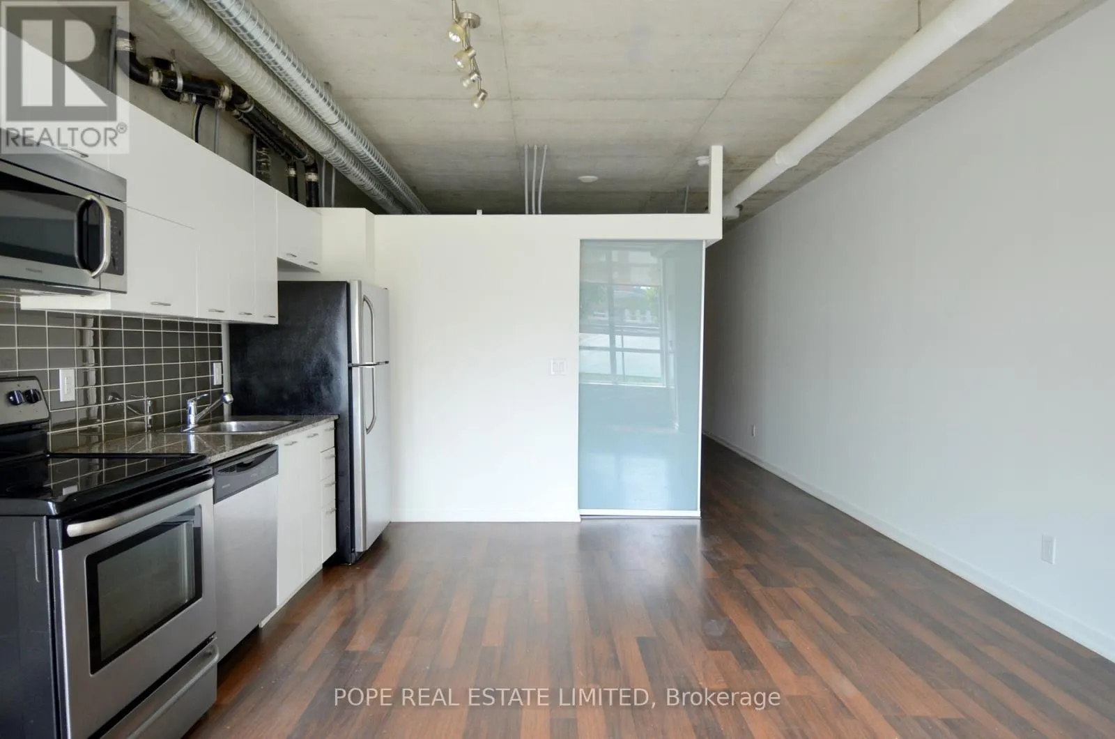Joe Shuster Way & King St West Live at the intersection of energy and ease at Bridge Condominium, perfectly positioned in the heart of Liberty Village. Step outside and immerse yourself in one of Toronto's most dynamic neighbourhoods - morning coffee in Liberty Village, brunch in Parkdale, dinner along King West, and boutique shopping on Queen West - all just a short walk from your front door. This approx. 570 sq. ft. loft-style residence blends authentic industrial character with modern comfort. Soaring 9-foot exposed concrete ceilings, spiral ductwork, and laminate floors create a bold urban aesthetic, while the white kitchen with stone countertops and stainless steel appliances delivers clean, contemporary function. The open-concept layout flows effortlessly into the living space and out to your private terrace - perfect for warm summer evenings or quiet morning moments above the city. The spacious bedroom offers a calm retreat, complemented by a sleek 4-piece bath and ensuite laundry. Residents enjoy an exceptional suite of amenities: 24-hour concierge, fully equipped fitness centre, locker rooms, steam room, whirlpool, indoor pool, party room, media and games room, guest suites, outdoor terrace, and visitor parking. Includes 1 parking space and 1 locker. Urban. Connected. Effortless. Welcome to Liberty Village living at its best. (id:27476)