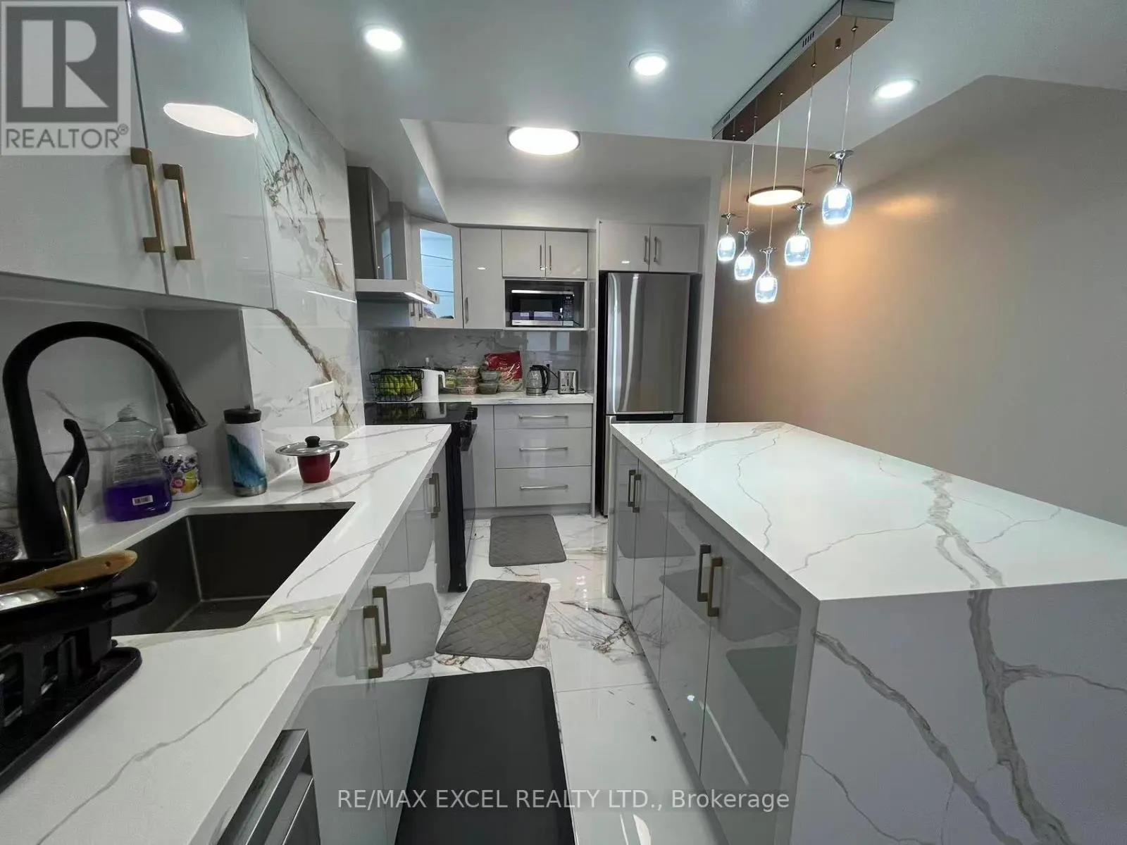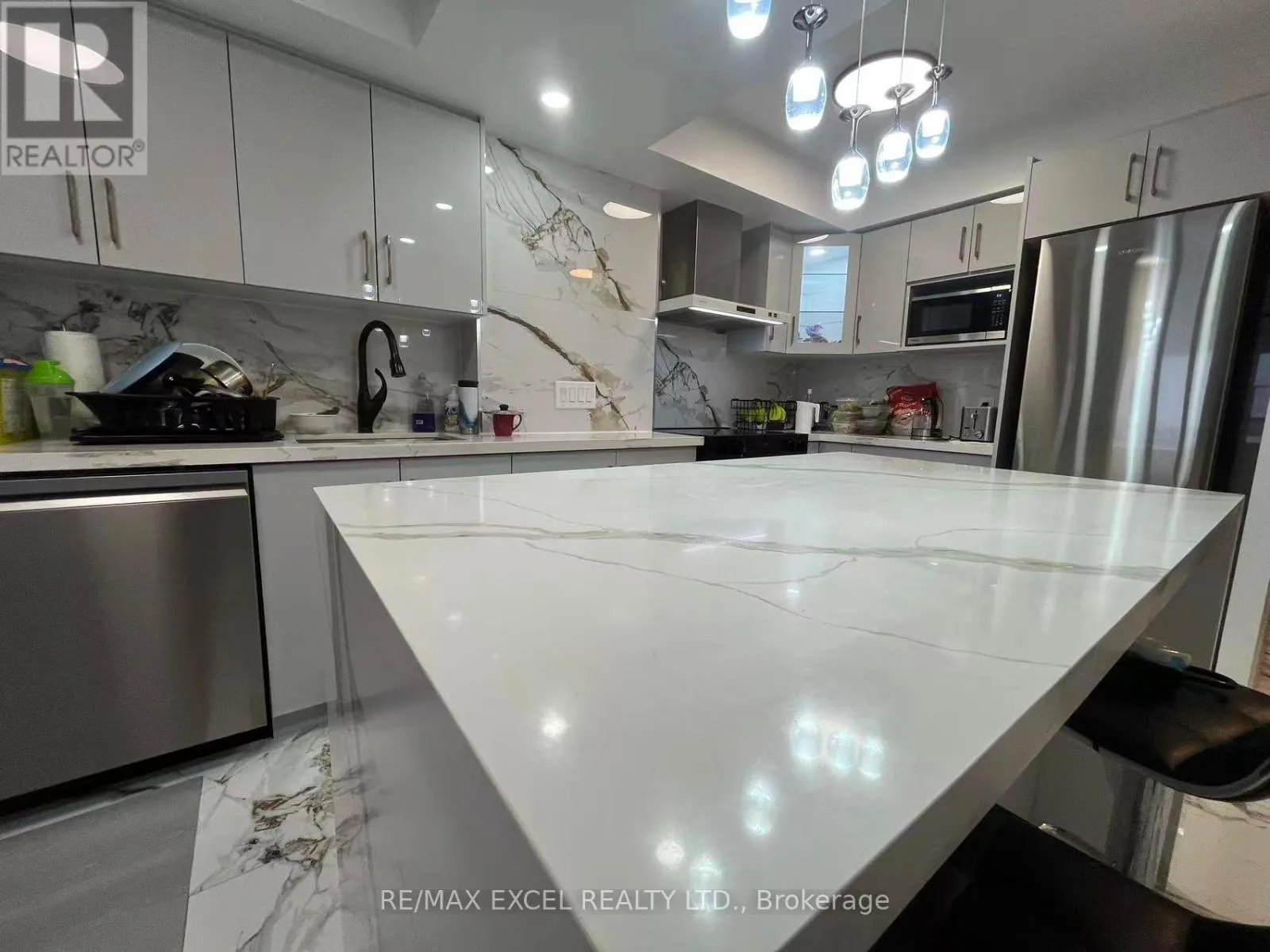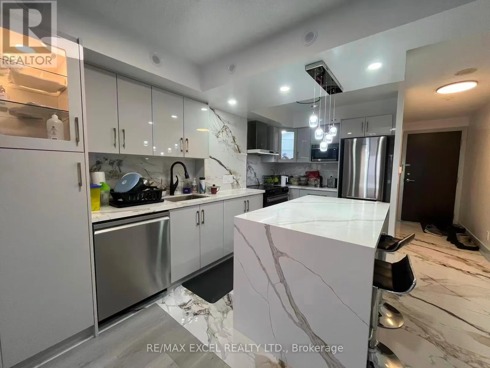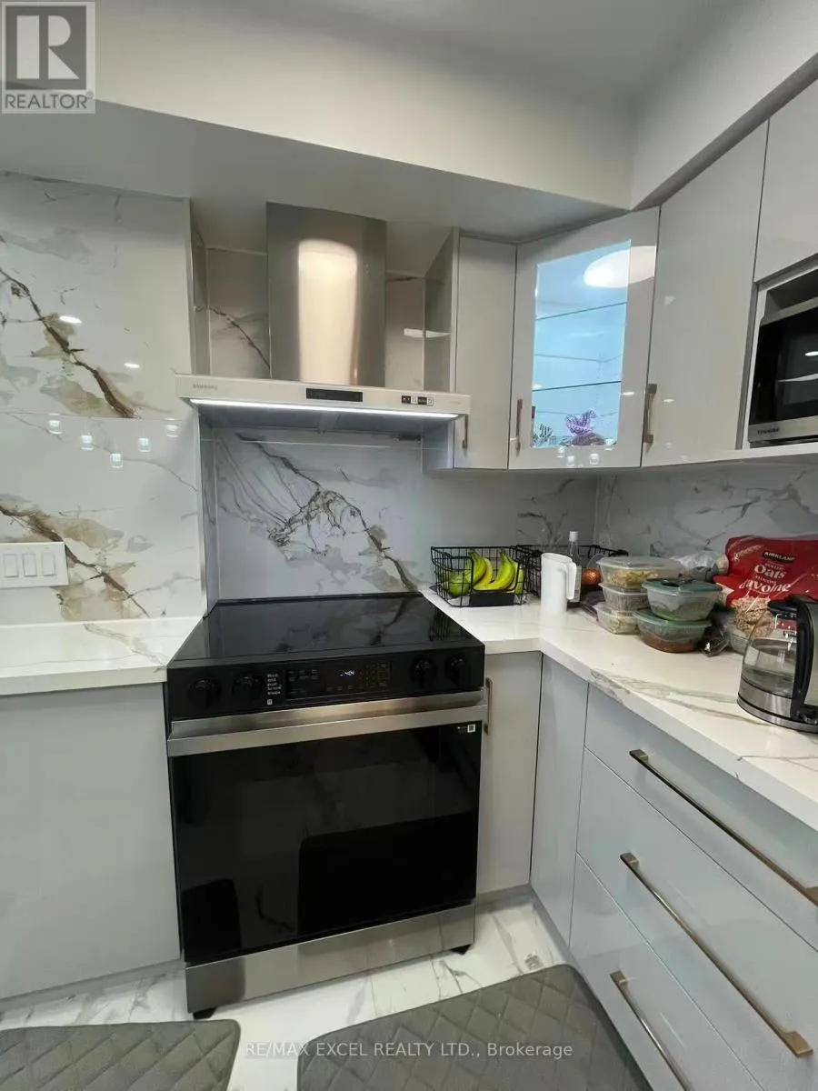 Cross Streets: Kennedy / 401. ** Directions: park at(inside) visitor parking near LB panel. Welcome To Solaris I In The Sought-After Metrogate Community, Developed By Tridel. This Bright High-Floor 2-Bedroom, 2-Bath Unit Features A Sunny South/West View, Complet Renovated Modern Luxury Kitchen, White Quartz Island, Marble Backsplash With Brown-Grey Veining, Handleless Grey Cabinets, Stainless Steel Appliances, Glass Pendant Chandelier, Tiled Marble-Look Floor, Black Bar Stools, Recessed Lighting, Sleek Minimalist Design. Open-Concept Living/Dining With Balcony Walkout, Laminate Floors, And Ensuite Laundry. The Primary Bedroom Includes A Private Ensuite. Enjoy Premium Amenities: Indoor Pool (Exclusive To The Community), Gym, Sauna, Party Room, Billiards, Guest Suites, Daycare, Terrace, And Ample Visitor Parking. Includes 1 Parking And 1 Locker. Steps To TTC, Highway 401, UTSC, STC, Kennedy Station, Agincourt Mall, And Kennedy Commons. Available Immediately (id:27476)