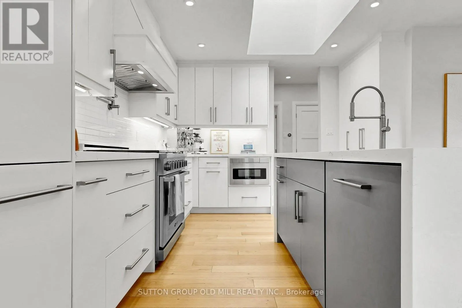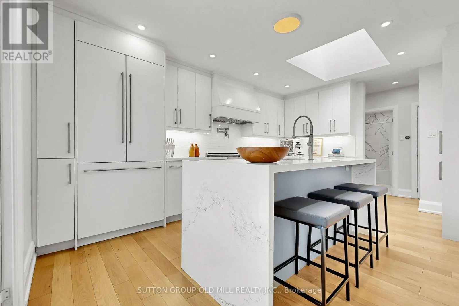 Cross Streets: Princess Margaret Blvd & Asford Dr. ** Directions: West of kipling North of Princess Margaret. Princess-Rosethorn | 1 Farningham Crescent, Etobicoke.One of Etobicoke's most established and architecturally cohesive neighbourhoods, Princess-Rosethorn is defined by its well-preserved, same-vintage bungalows and tree-lined streets. This fully renovated (2019) mid-century bungalow was conceived to complement its original character while bringing every system, surface, and finish fully into the present.The main floor features wide-plank white oak engineered hardwood, a custom open-riser staircase with solid oak treads, edgeless glass panels and hand-forged steel banister, and a foyer skylight that draws natural light deep into the home. The open living and dining area is notably generous for a home of this vintage, anchored by a gas fireplace and connected to the side-yard deck via sliding doors. The kitchen was designed for the serious home chef - custom cabinetry, expanded pantry, waterfall Caesarstone island, Dacor professional appliances including a 36" 6-burner range, commercial-grade hood, and European Franke fixtures including pot filler, oversized sink and designer faucet. Pre-plumbed for an espresso machine. Primary ensuite expanded to include a full double shower in large-format marble-look tile. Bedrooms are generously sized for a bungalow of this era.The fully rebuilt basement is divided into two distinct spaces with laundry and bathroom between them. The first features a complete kitchen with island, stainless hood and waterfall Caesarstone countertops, opening to a dining and seating area - self-contained and well-suited for multigenerational living, a nanny suite, or potential future rental conversion. The second is a bright, space currently used as a living room and workspace, with gas fireplace. (id:27476)