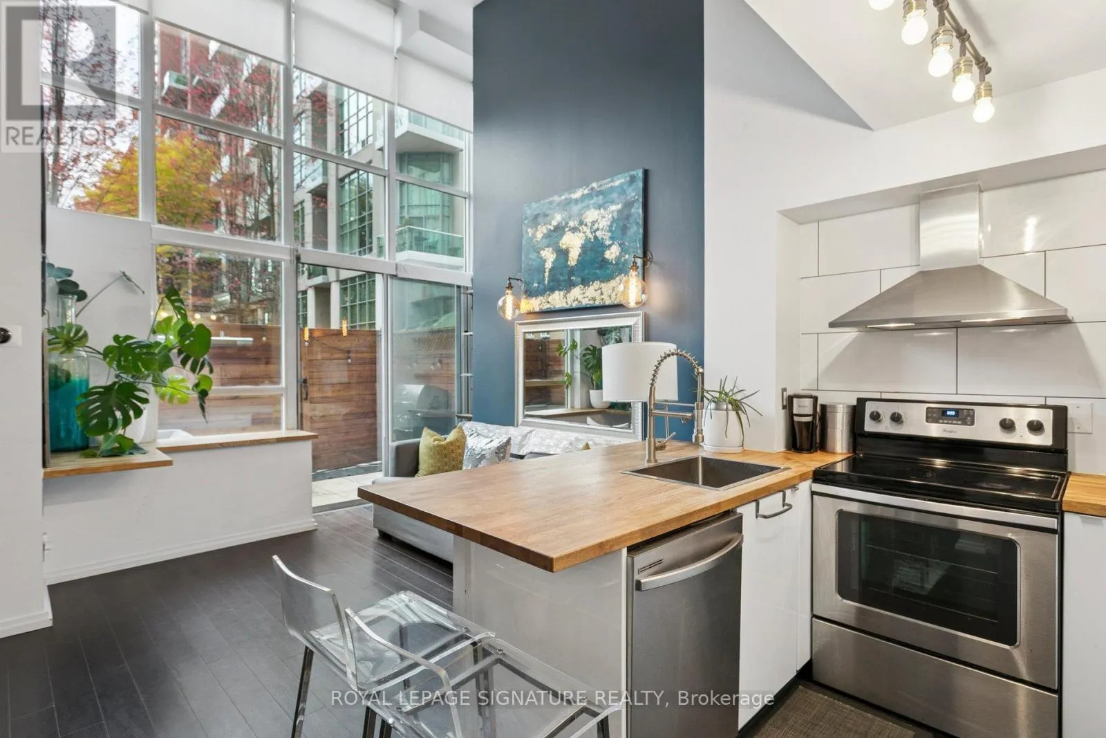 Park Lawn & Lakeshore Experience the perfect blend of style and comfort in this stunning main-floor loft, where modern design meets open-concept living. Soaring double-height ceilings and oversized windows flood the space with natural light, creating an airy, contemporary feel from the moment you walk in. The sleek kitchen features solid wood butcher-block countertops - beautiful, durable, and practical. With generous workspace that flows effortlessly into the open-concept living area, you can prep, cook, and entertain all at once - easily and without missing a beat. Step outside to your private back patio - a rare find in condo living. Enjoy morning coffee, unwind in the evening, or fire up the BBQ (permitted on this level) - perfect for summer nights and gatherings with friends. Upstairs, the lofted bedroom offers just the right amount of space for a roomy, comfortable retreat with thoughtful storage. The modern bath and in-suite laundry add everyday convenience, while the unit's fresh, updated finishes make it truly move-in ready. Located in a boutique building close to cafes, parks, transit, and downtown - this is urban living redefined. Option to keep TV, couch & bed (frame) during lease term. (id:27476)