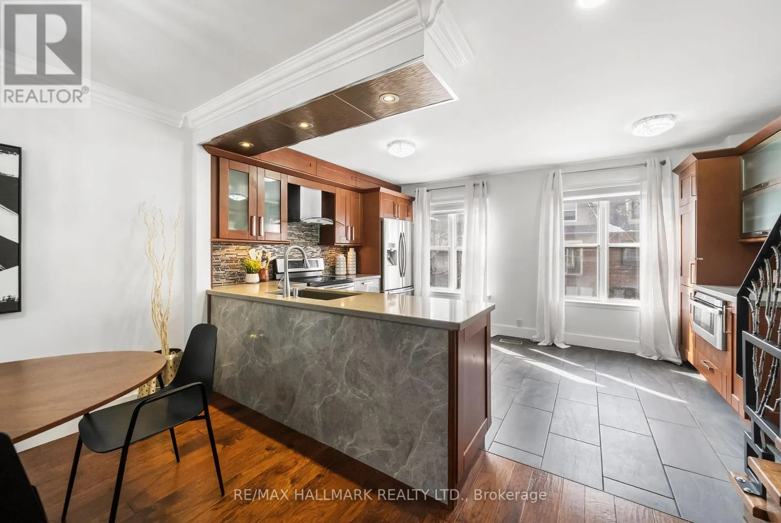 Parliament & Lakeshore Step into opportunity at 9 Douville Crt! Beautifully renovated 3+1 bedroom, 2 bathroom freehold townhome with 3-storeys of above grade living space and garage parking located in trendy Old Toronto! From dinner parties to game nights, entertain with ease with the open concept main floor. The character filled living and dining rooms showcase gleaming hardwood floors, crown moulding, a large bay window and stone feature wall with gas fireplace. The modern gourmet kitchen inspires your inner chef with full sized stainless steel appliances, quartz counters, ample storage, breakfast nook and a convenient appliance bar! Three well-appointed bedrooms including a primary bedroom with built-in closet organizers. Modern and updated 4-piece bathroom with new vanity (2026) and spa-inspired shower and soaker tub! The ground level is the perfect space for a home office, guest bedroom, playroom or family room with gas fireplace, wood floors, pot lights, and a powder room. Walk-out to the fully-fenced backyard oasis with flagstone patio and walkway, deck seating area (2025), and bright garden space. Fresh groceries from your 5 minutes walk to St Lawrence Market, explore neighbourhood coffee shops, embrace the historic Distillery District, stroll to the lake for weeknight gelato or weekend days at Sugar Beach! Quick access to TTC, Gardiner, DVP, and future GO Station stop. (id:27476)