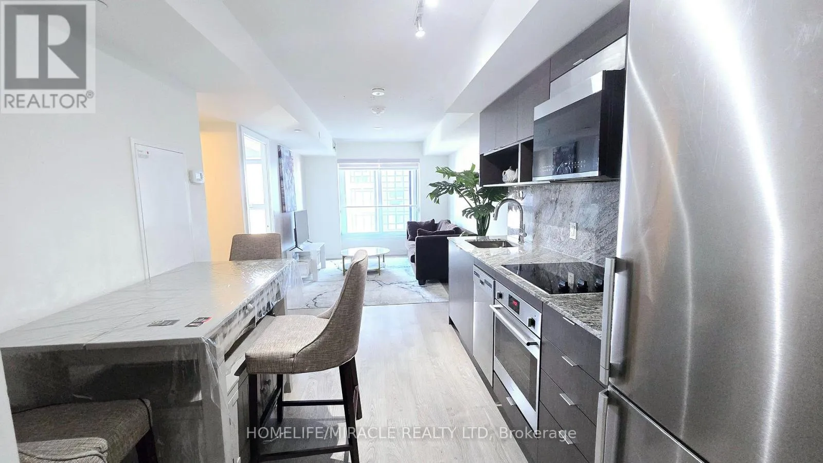 Islington Ave & Bloor St W Welcome to Tridel's latest condo development, ideally located in the heart of Etobicoke, just a short walk from Islington Subway. This fairly new one-bedroom, one-bathroom unit includes a private parking space and features sleek laminate flooring throughout. Enjoy east-facing view, plus the convenience of ensuite laundry. The kitchen boasts premium stainless steel appliances, granite countertops, and a stylish backsplash. Take advantage of outstanding building amenities and a prime location close to numerous conveniences. Underground Parking & W-Fi included in lease price. (id:27476)