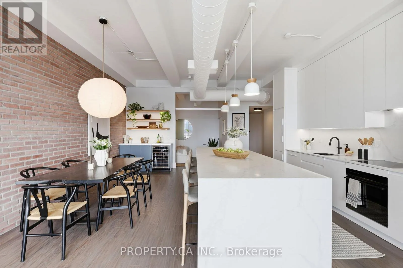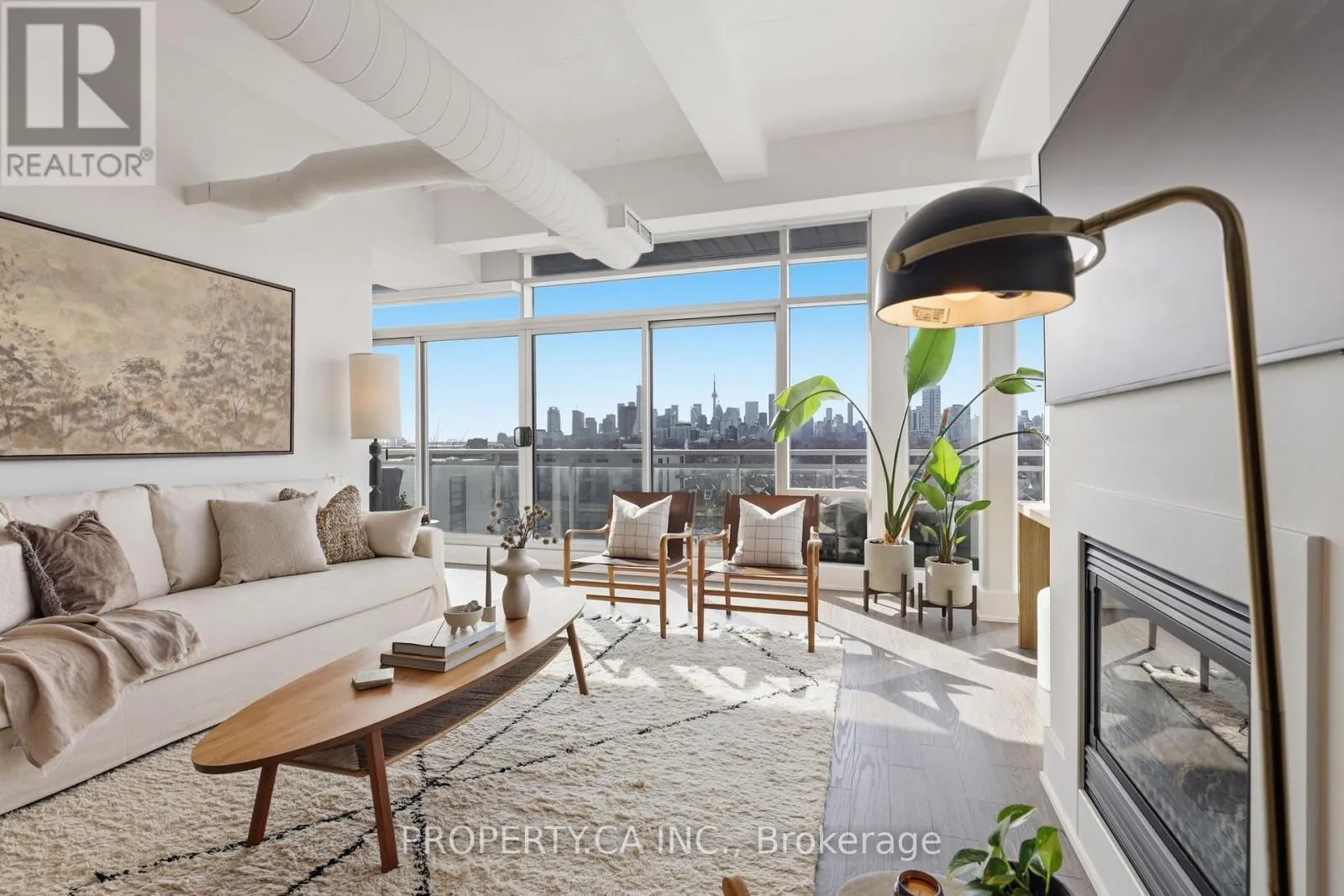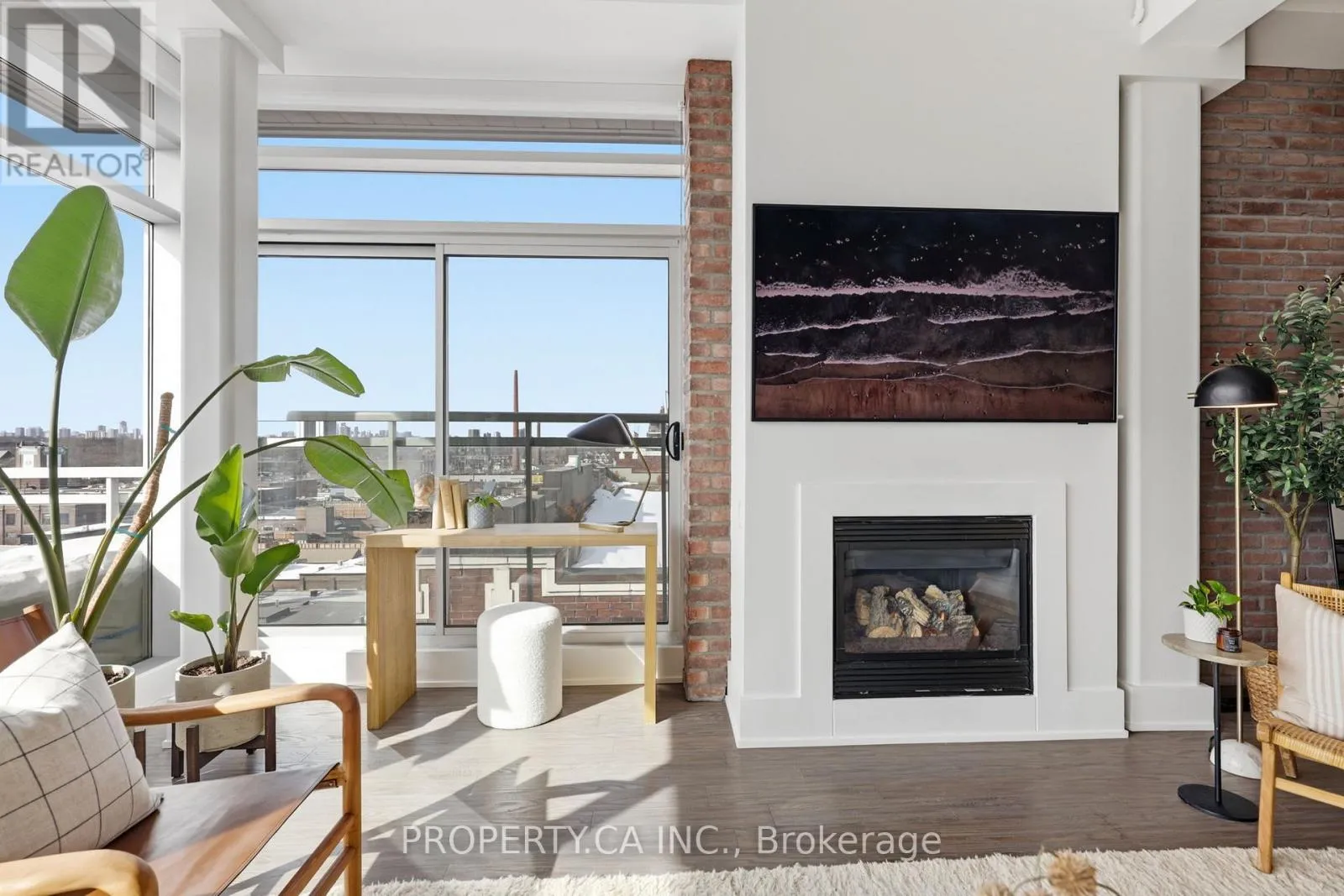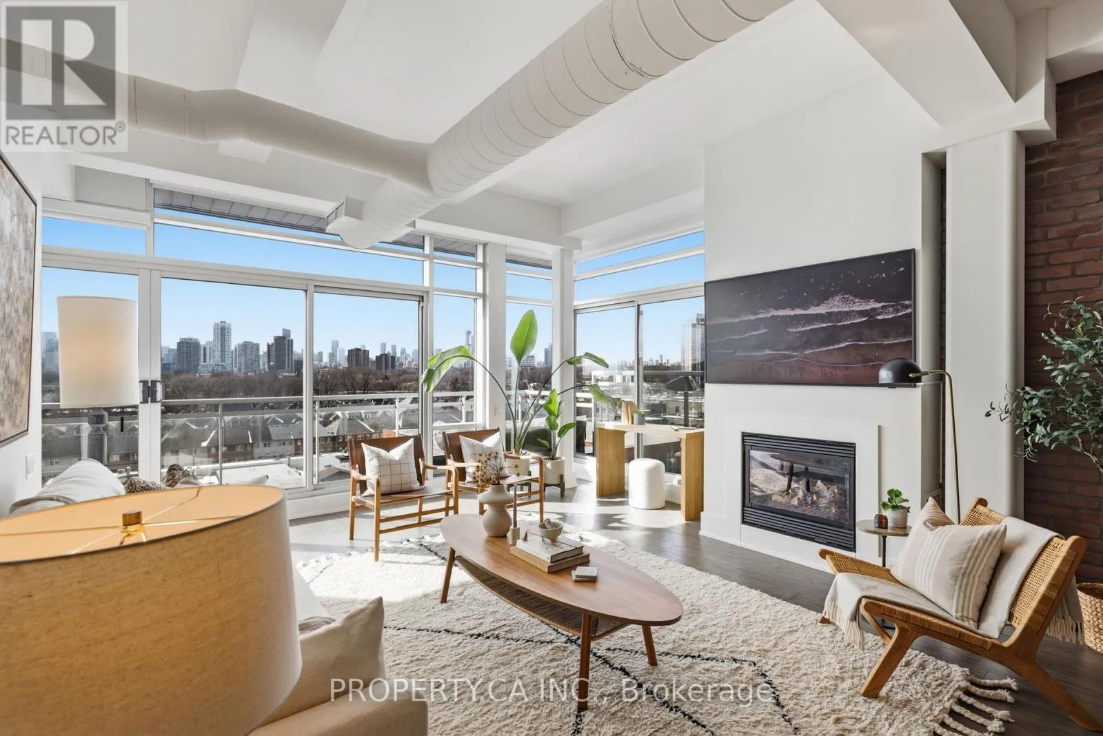 QUEEN ST E & CARLAW AVE Positioned atop the coveted Garment Factory Lofts in Toronto's Leslieville neighbourhood, this stunning penthouse corner loft delivers an exceptional blend of scale, light, and authentic urban character. Spanning 1,286 square feet, the open-concept layout blends classic loft details including an eye catching brick feature wall, exposed ductwork, and soaring 10-foot ceilings with striking contemporary design. Floor-to-ceiling windows with custom roller blinds frame sweeping, unblocked west-facing skyline views opening to a sun-drenched walk-out balcony. The custom-designed and bespoke fabricated kitchen features premium integrated Fisher & Paykel appliances flowing seamlessly into a dining space highlighted by the bespoke dry bar with wine fridge, ideal for entertaining. A gas fireplace anchors the living area, while two generously sized bedrooms and two full 4-piece baths offer comfort and privacy. The primary retreat boasts ample storage with walk-through closets leading to a stylish ensuite. Complete with one titled parking space and steps to the Queen Street streetcar, this is elevated Leslieville living at its finest. (id:27476)