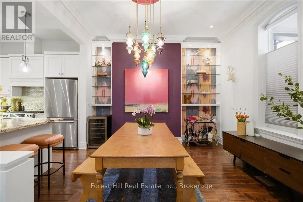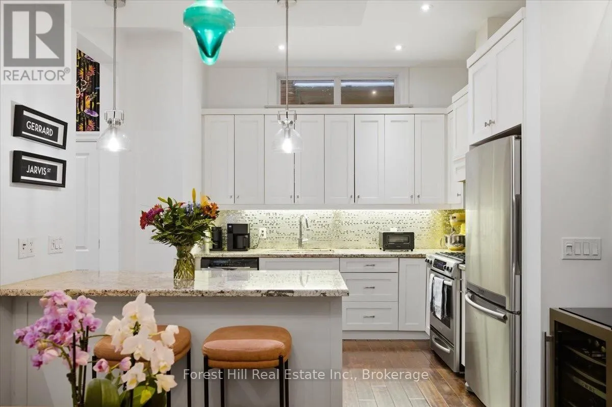 Cross Streets: Gerrard St E & Sherbourne St. ** Directions: South on Pembroke St (1 way street) off Gerrard St E. Nestled within The Four Courts, a distinguished 1878 Victorian mansion thoughtfully converted into just four exclusive residences, this charming 1,458 sq ft condo townhouse offers a rare blend of historic character and modern comfort in the heart of the city. The open-concept main floor is designed for both comfort and connection featuring 10ft ceilings and hardwood floors, and an open kitchen and dining area that flows seamlessly into a bright living space highlighted by a bay window and a fireplace. Thoughtfully laid out for everyday living and entertaining alike, this level is completed by a convenient powder room.The lower level offers two well-proportioned bedrooms, two full bathrooms, and in-suite laundry and the added comfort of radiant heated floors, providing privacy and flexibility for guests, work from home needs, or comfortable daily living. Outdoors, this residence truly stands apart with its own private gazebo, a perfect retreat for morning coffee or evening relaxation. In addition, residents enjoy access to a separate, shared community courtyard, beautifully furnished and complete with a BBQ area, ideal for casual gatherings and socializing. A detached one-car garage adds valuable convenience and storage. Set within a stately historic building with timeless architectural appeal, this unique residence delivers a low-maintenance lifestyle enriched by character, privacy, and community, an exceptional opportunity in a truly special property. Walk Score: 98 | Transit Score: 96 | Bike Score: 100 - a true walker's, rider's, and commuter's paradise. (id:27476)