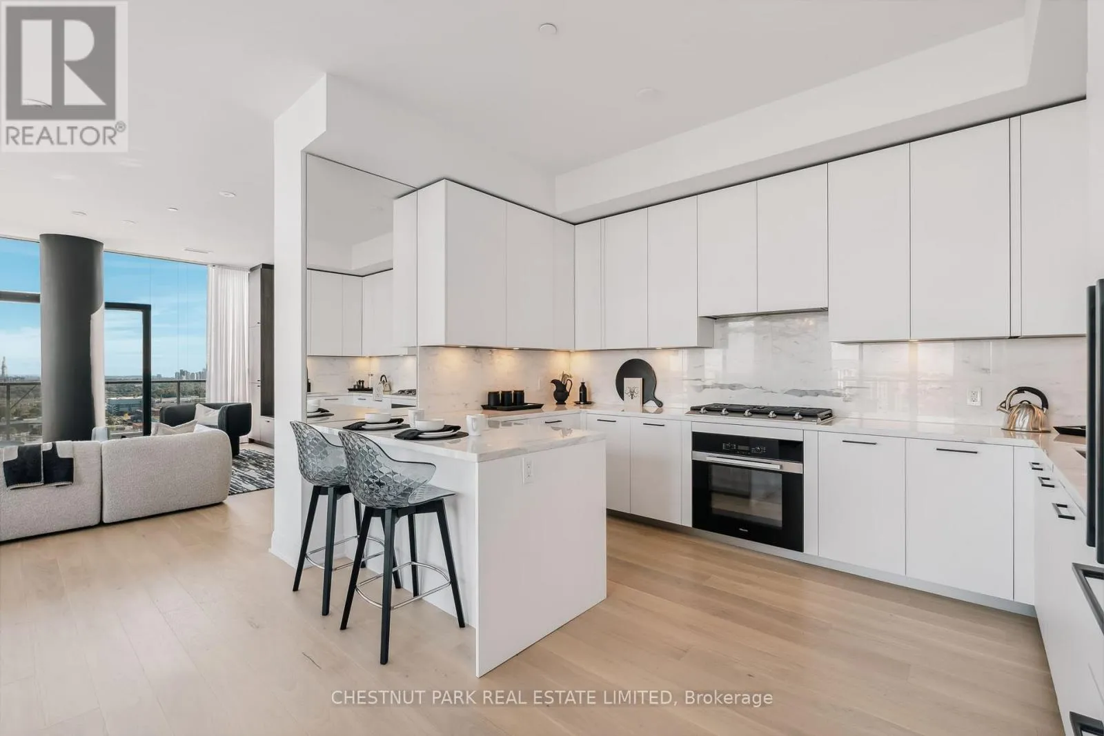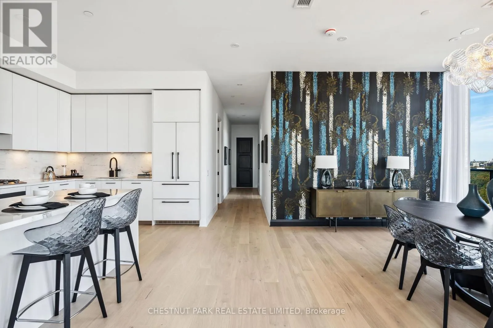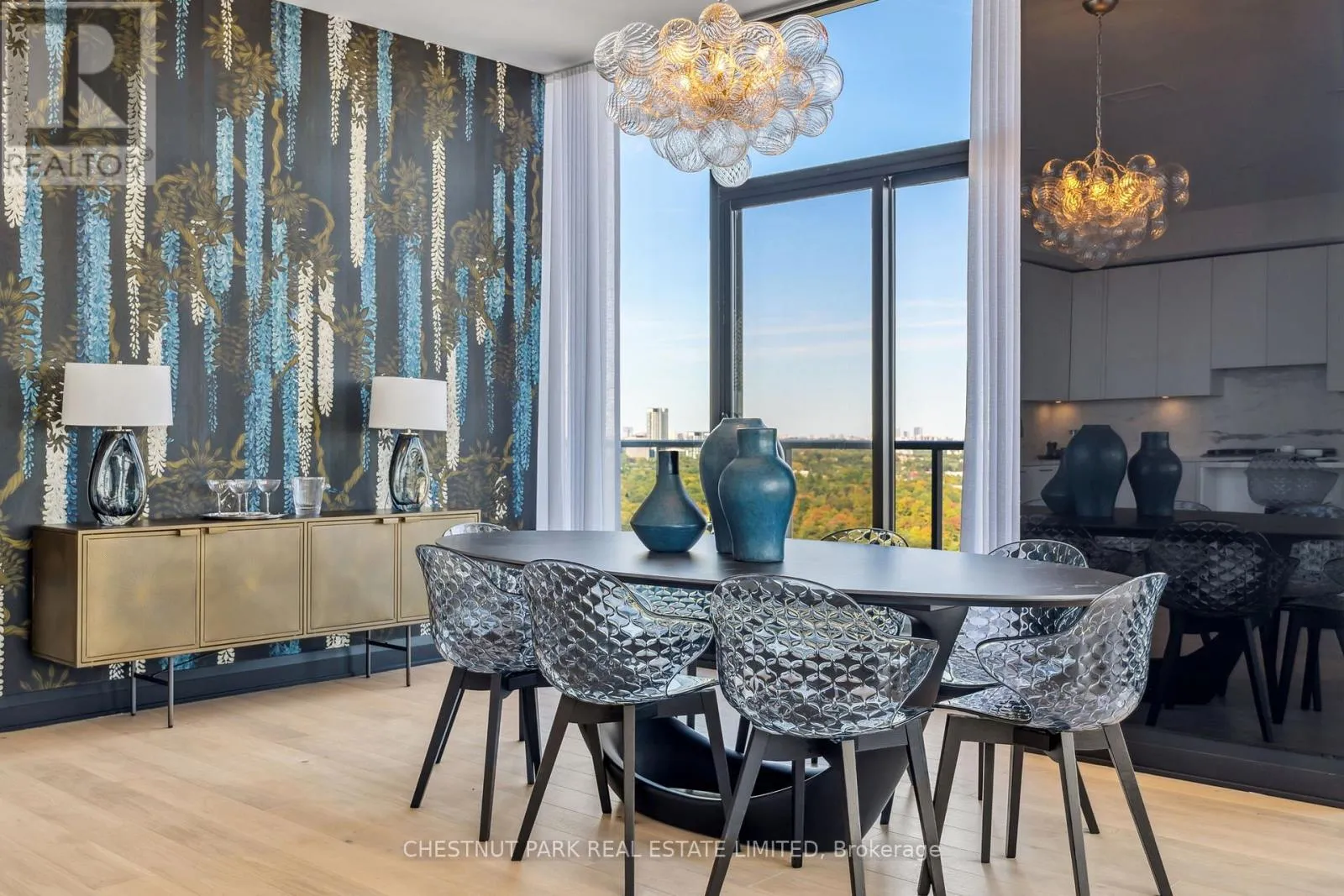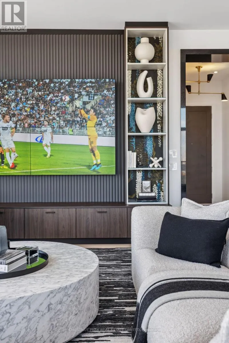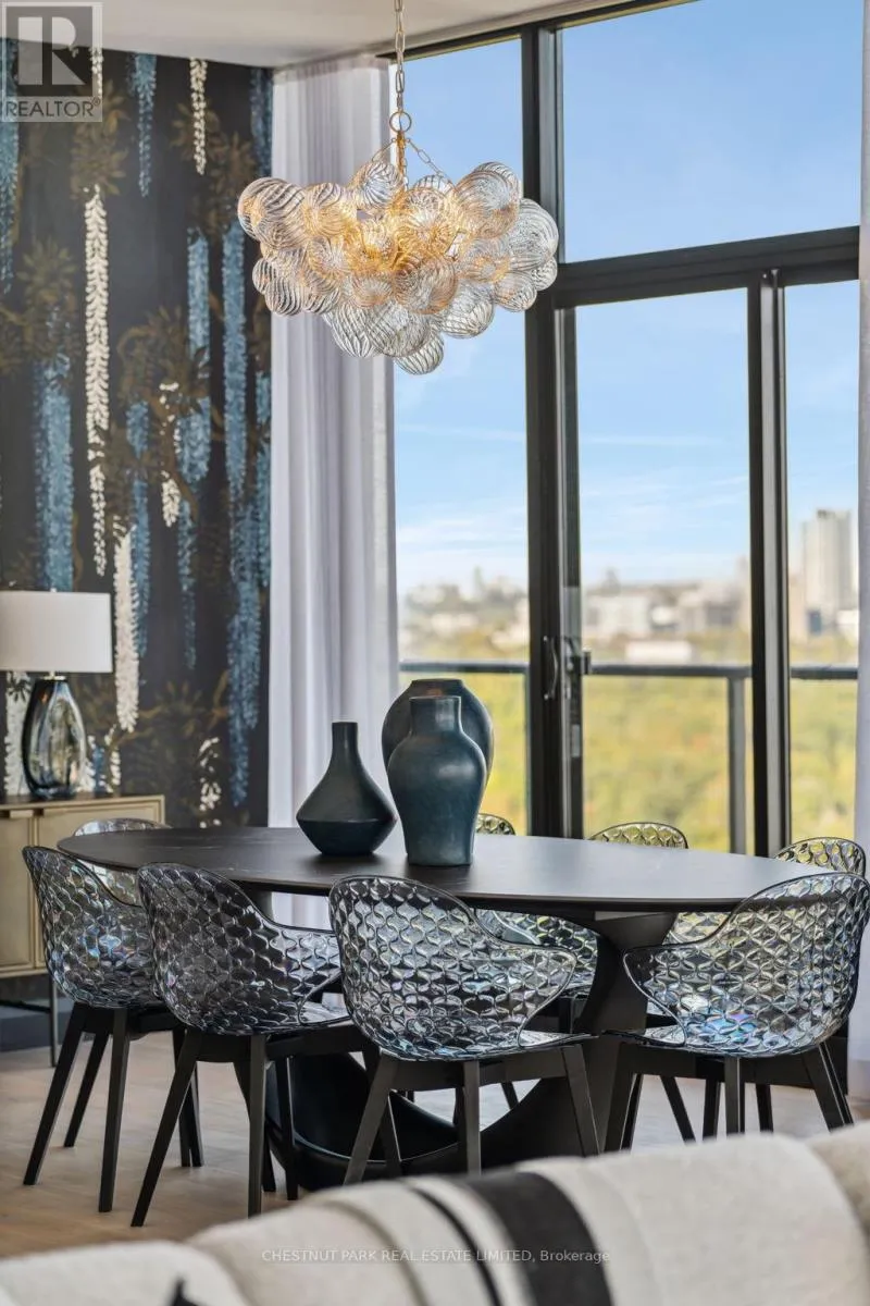 Eglinton & Laird Welcome to this stunning southeast corner upper penthouse in the heart of Leaside, boasting sweeping city views, 10-ft ceilings, and floor-to-ceiling windows. Enter through diamond-patterned tile and a custom granite archway into the expansive great room, featuring custom fluted millwork, open shelving with Christian Lacroix wallpaper, and four seamlessly integrated frameless TVs. The south-facing balcony is perfect for entertaining, while the dining room offers a separate balcony and another Lacroix feature wall. The custom Trevisana kitchen dazzles with Calacatta marble counters, Miele appliances, a 5-burner gas cooktop, and breakfast bar seating. The primary suite includes a private balcony, walk-in closet, and spa-like 6-pc ensuite. A guest bedroom offers its own walk-in closet and 3-pc ensuite. With black granite archways, glass walls, Calacatta finishes, and elegant hardware throughout, this home is a true slice of heaven in the sky. (id:27476)