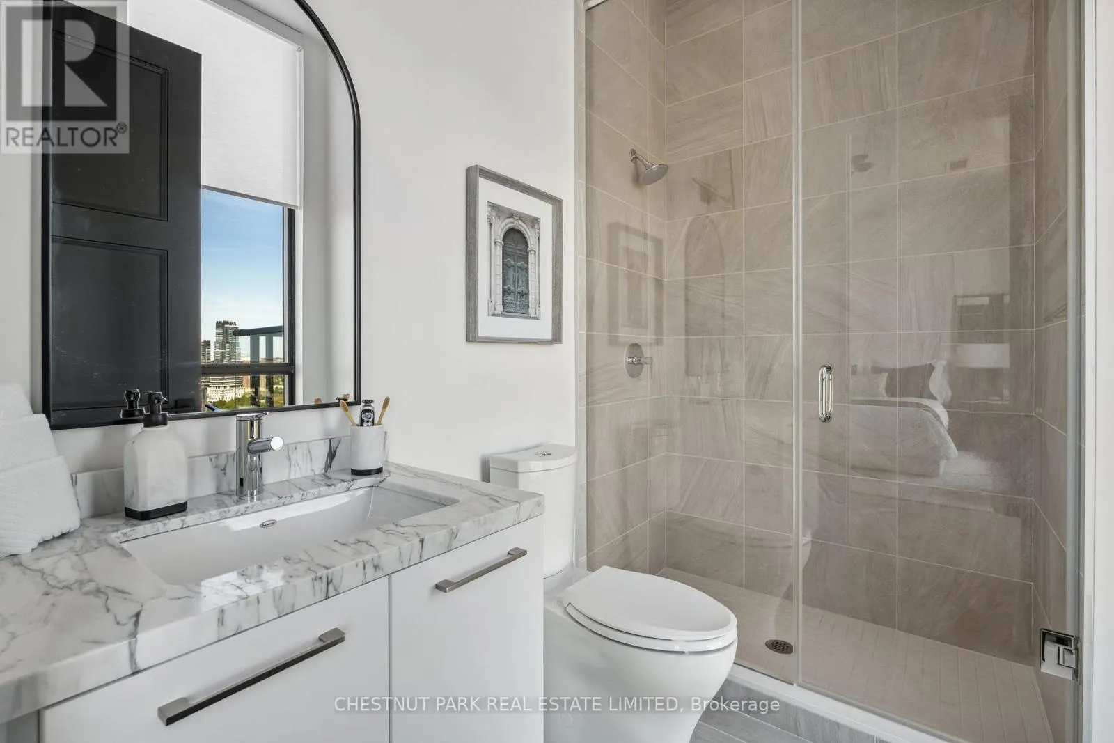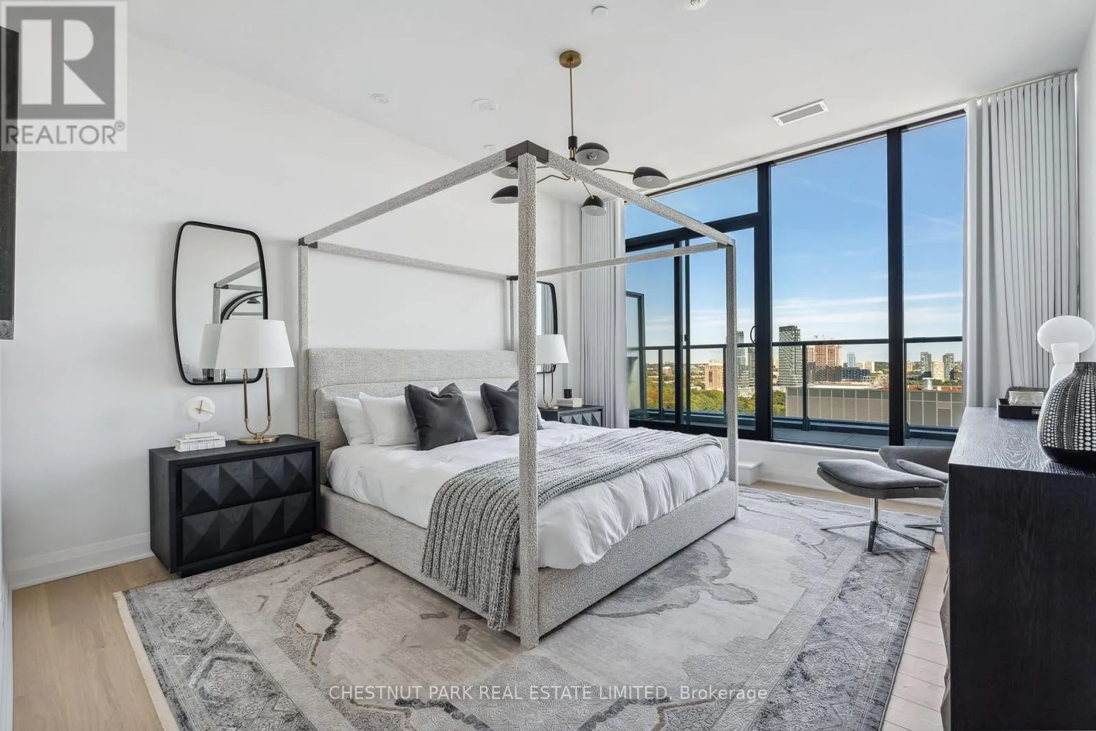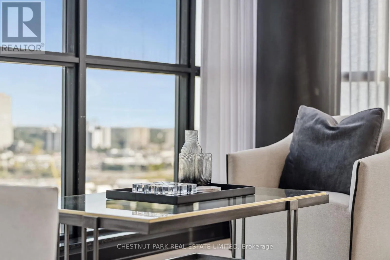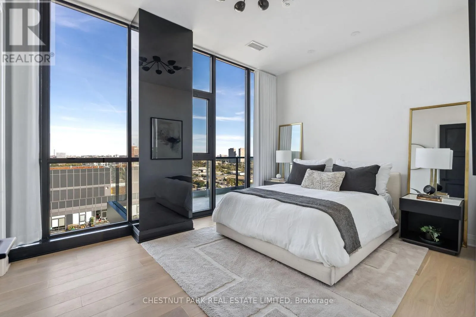 Eglinton & Laird Welcome to this stunning southeast corner upper penthouse in the heart of Leaside, boasting sweeping city views, 10-ft ceilings, and floor-to-ceiling windows. Enter through diamond-patterned tile and a custom granite archway into the expansive great room, featuring custom fluted millwork, open shelving with Christian Lacroix wallpaper, and four seamlessly integrated frameless TVs. The south-facing balcony is perfect for entertaining, while the dining room offers a separate balcony and another Lacroix feature wall. The custom Trevisana kitchen dazzles with Calacatta marble counters, Miele appliances, a 5-burner gas cooktop, and breakfast bar seating. The primary suite includes a private balcony, walk-in closet, and spa-like 6-pc ensuite. A guest bedroom offers its own walk-in closet and 3-pc ensuite. With black granite archways, glass walls, Calacatta finishes, and elegant hardware throughout, this home is a true slice of heaven in the sky. (id:27476)