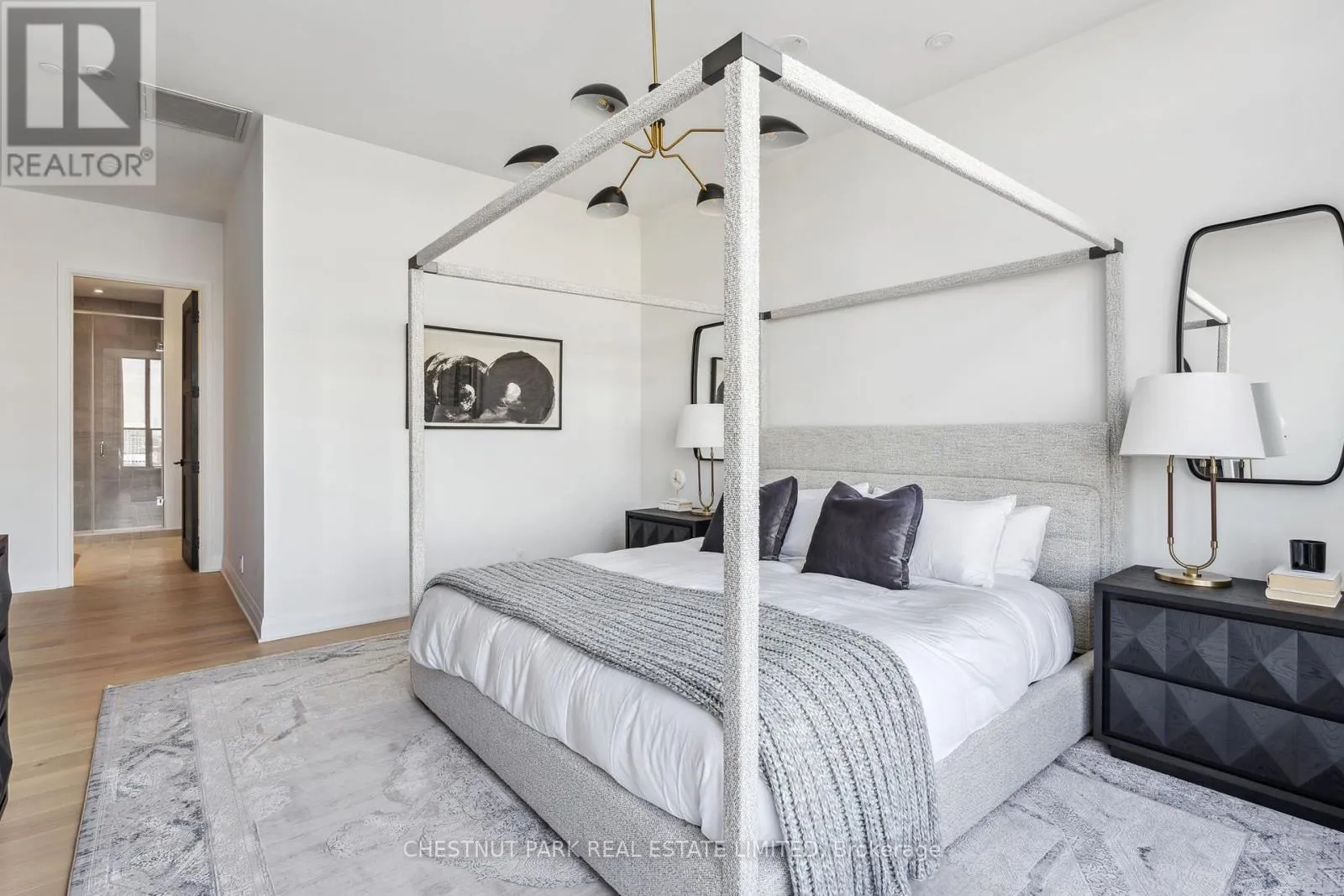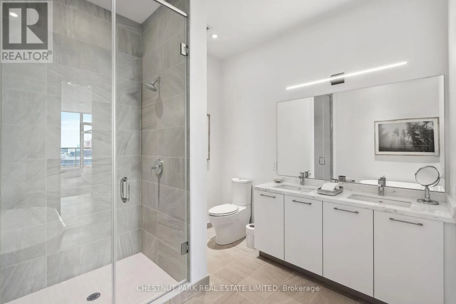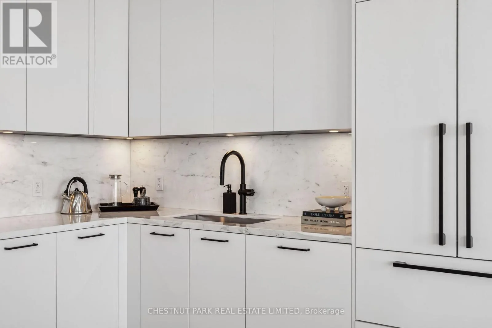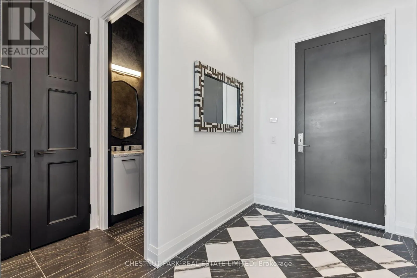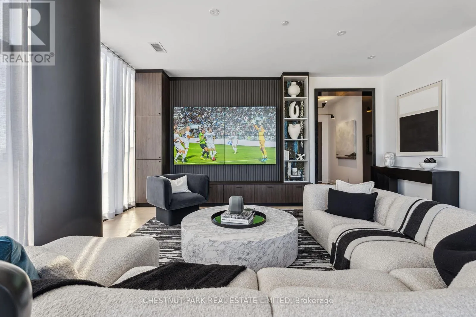 Eglinton & Laird Welcome to this stunning southeast corner upper penthouse in the heart of Leaside, boasting sweeping city views, 10-ft ceilings, and floor-to-ceiling windows. Enter through diamond-patterned tile and a custom granite archway into the expansive great room, featuring custom fluted millwork, open shelving with Christian Lacroix wallpaper, and four seamlessly integrated frameless TVs. The south-facing balcony is perfect for entertaining, while the dining room offers a separate balcony and another Lacroix feature wall. The custom Trevisana kitchen dazzles with Calacatta marble counters, Miele appliances, a 5-burner gas cooktop, and breakfast bar seating. The primary suite includes a private balcony, walk-in closet, and spa-like 6-pc ensuite. A guest bedroom offers its own walk-in closet and 3-pc ensuite. With black granite archways, glass walls, Calacatta finishes, and elegant hardware throughout, this home is a true slice of heaven in the sky. (id:27476)