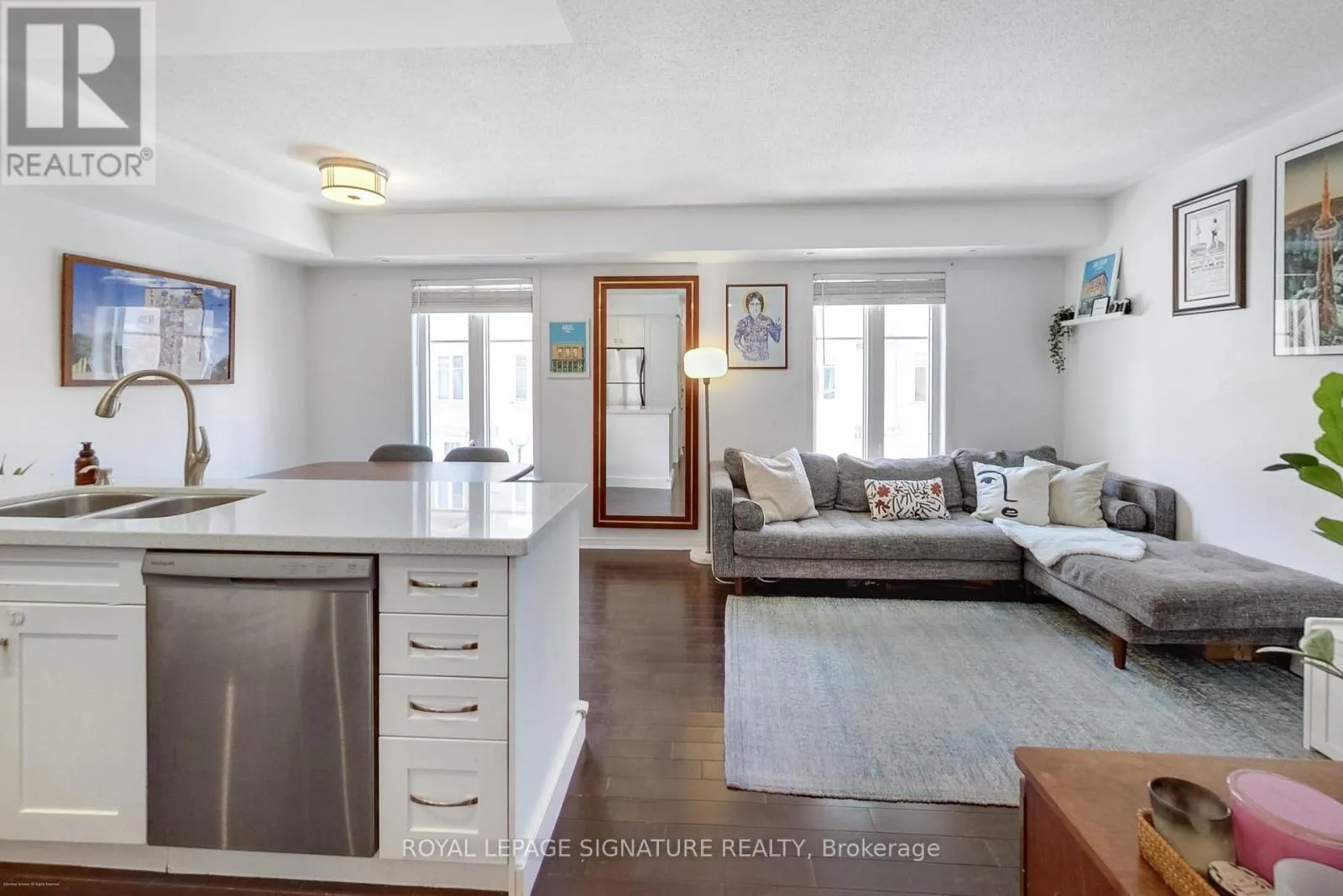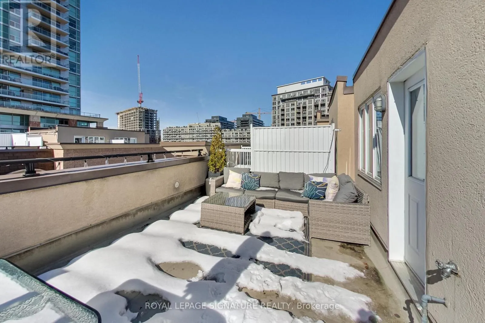 Cross Streets: Pirandello/East Liberty. ** Directions: 2nd block of townhomes east of Pirandello. Discover exceptional value and lifestyle in this beautifully updated 3-storey, 2-bedroom townhouse in the heart of Liberty Village. Offering approximately 970sqft of bright, thoughtfully designed living space, this sun-filled home features a rare private entrance in a tranquil and landscaped setting. A rare balance between the feel of a freehold home and the ease of condo living. Located in a lush, well-managed townhome community.The upgraded kitchen is the heart of the home, complete with quartz countertops, tile backsplash, stainless steel appliances, and ample cabinetry-perfect for everyday living and entertaining. Both bathrooms have been stylishly updated, including a convenient main-floor powder room. Two generous bedrooms feature double closets and windows. Crowning the home is an expansive 240+ sqft private rooftop terrace with gas BBQ hookup, a rare, sun-soaked outdoor retreat ideal for relaxing or entertaining above the city. Added conveniences include ensuite laundry, underground parking, and an owned locker. Steps to parks, cafes, gyms, restaurants, boutique shops, transit, waterfront trails, and easy highway access. Whether you're upgrading from a condo or buying your first home, this turnkey townhouse delivers space, privacy, outdoor living, and an unbeatable Liberty Village location. Move in and enjoy the lifestyle. (id:27476)
