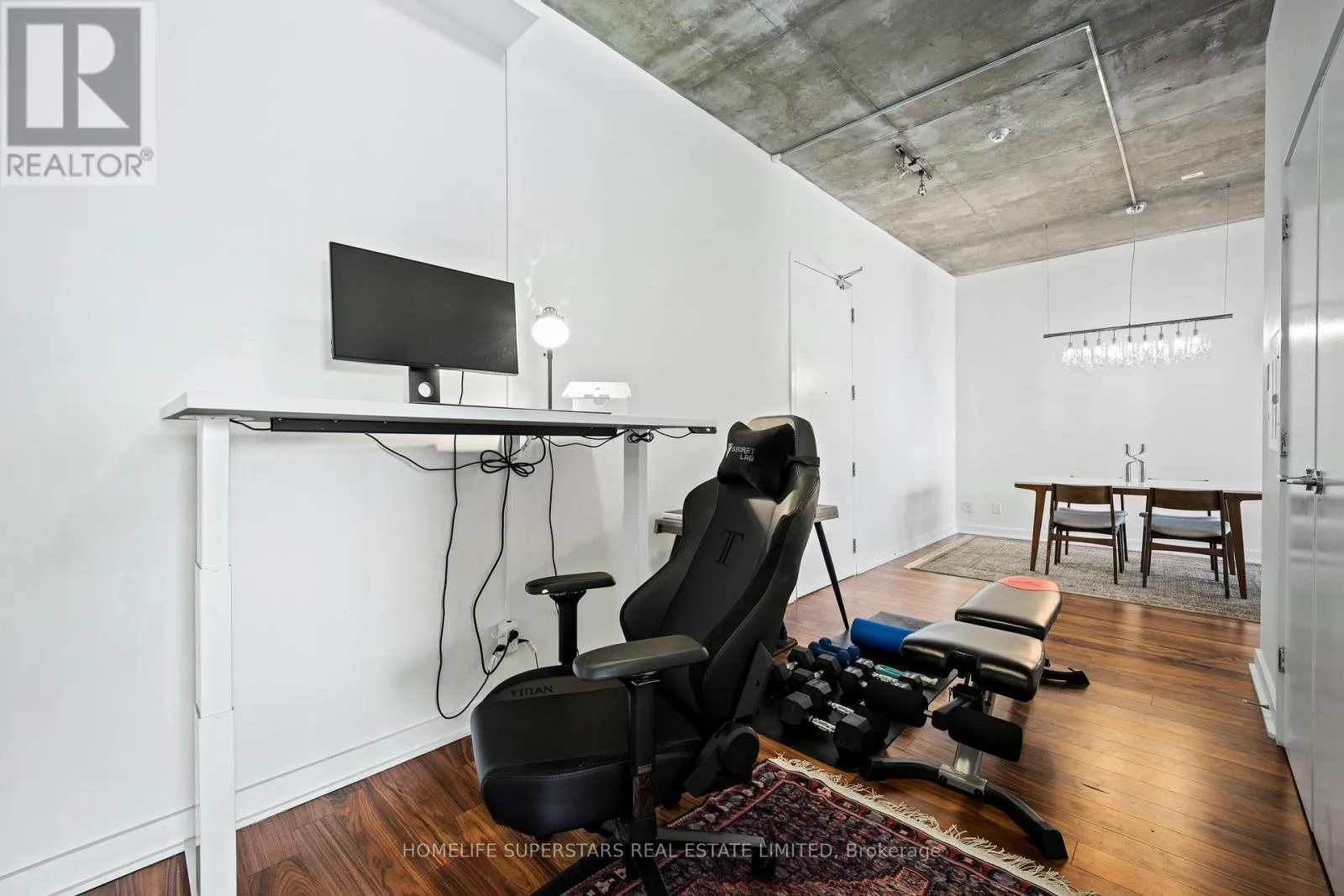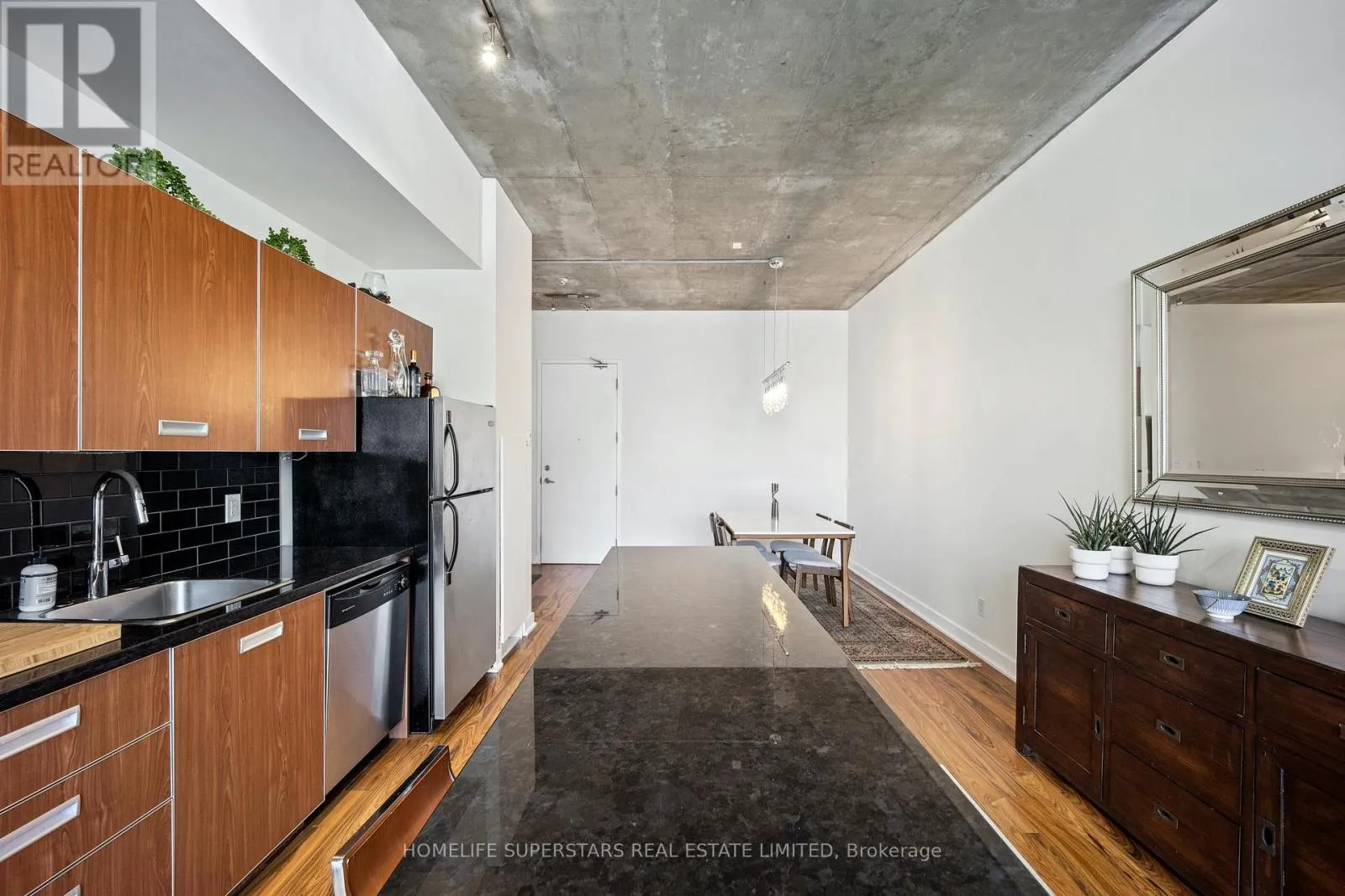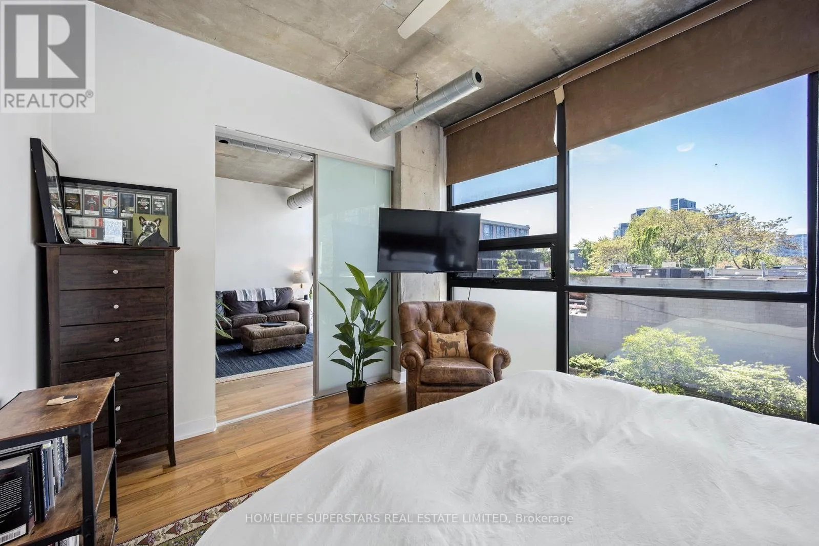Cross Streets: King and Bathurst. ** Directions: Enter off of Wellington, just west of Bathurst. Welcome To Sixty Lofts! Experience the perfect blend of style and convenience in this stunning 933 sq. ft. loft, ideally situated in Toronto's vibrant Niagara District. Showcasing a true industrial aesthetic with exposed ductwork, soaring 10-foot concrete ceilings, and a spacious open-concept layout, this unit offers an exceptional backdrop for entertaining and everyday living alike.A standout feature of this suite is its unmatched closet storage - the largest in the building - complete with custom closet organizers designed to maximize functionality without compromising style. Storage like this is a rare find in loft living.The living room boasts panoramic city views that are sure to impress your guests, whether you're hosting before a night out on King West or enjoying an intimate evening at home. The building also features a rooftop deck and a party/meeting room.The modern sophistication and industrial charm create an atmosphere that elevates every occasion.An additional highlight is the versatile den, ideal for working remotely. Located just steps to TTC, Farm Boy, and an incredible selection of world class restaurants and King West nightlife, this address truly offers the best of city living right at your doorstep. With so much to see and do, you'll never experience a dull moment at Sixty Lofts. (id:27476)