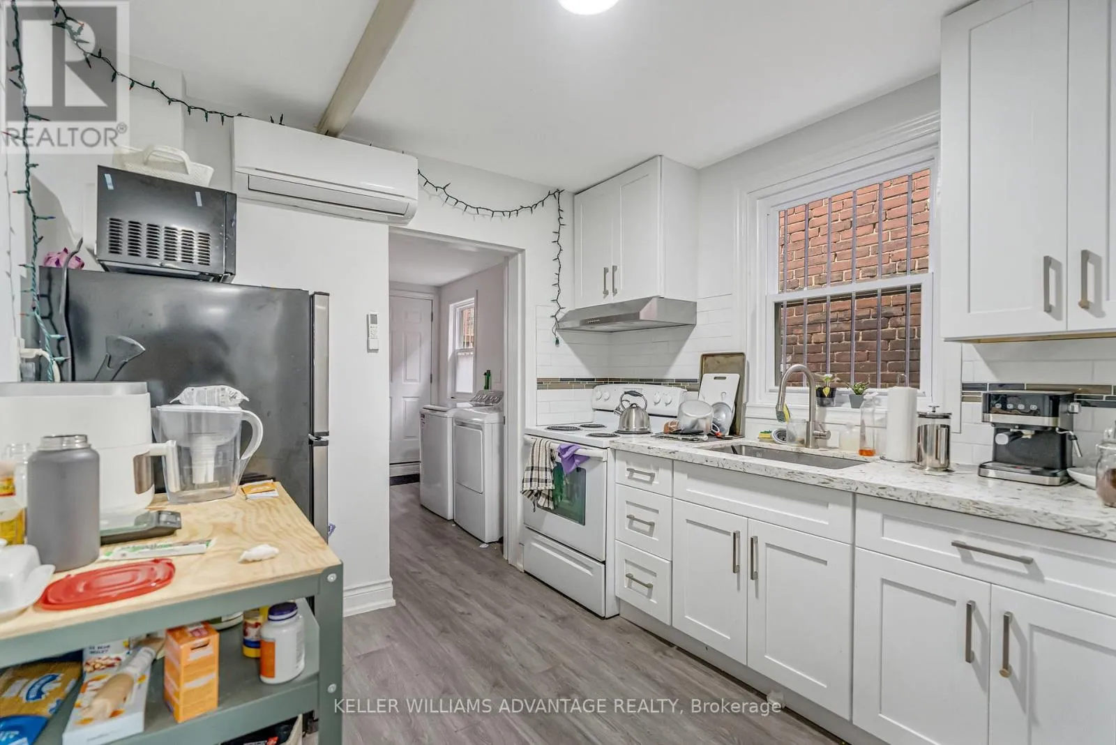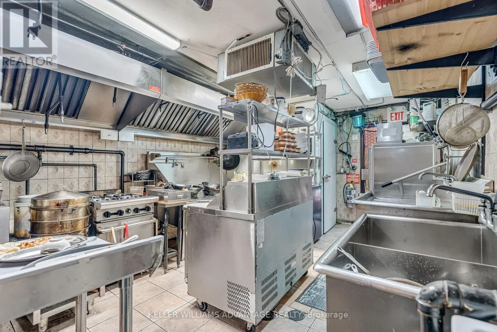 Cross Streets: Danforth and Logan. ** Directions: West of Logan (south side of Danforth). Greektown Gem - DANFORTH & LOGAN!! An exceptional opportunity in the heart of Greektown! This main floor restaurant (approx. 1,150 sq. ft.) currently seats 55 guests inside, plus a small patio, and features a generous approx. 300 sq. ft. kitchen with ample prep and organization space. Fully renovated in 2008, the property includes completely updated plumbing, electrical, and gas systems. The main level was stripped to the foundation, with a brand-new concrete subfloor and tile finish installed, ensuring a modern, turnkey space. Both main and lower levels boast fully updated infrastructure. The basement (approx. 545 sq. ft.) offers high ceilings and five bathrooms, providing flexibility for staff, customers, or future layout possibilities. Above, a spacious approx. 800 sq. ft. two-bedroom apartment (renovated 2023) is currently leased for $2,250/month, delivering stable rental income from day one. Located in a prime, high-exposure corner, opportunities like this in Toronto's most vibrant neighbourhoods are rare. Secure a worry-free investment with strong potential in Greektown! (id:27476)