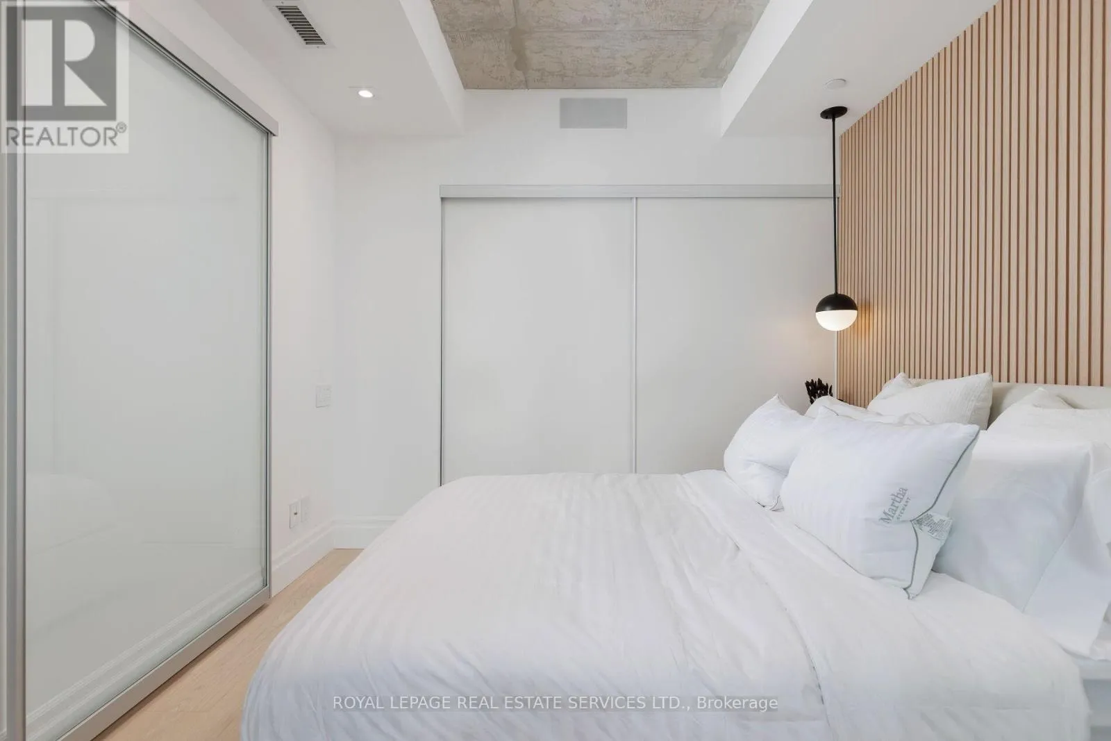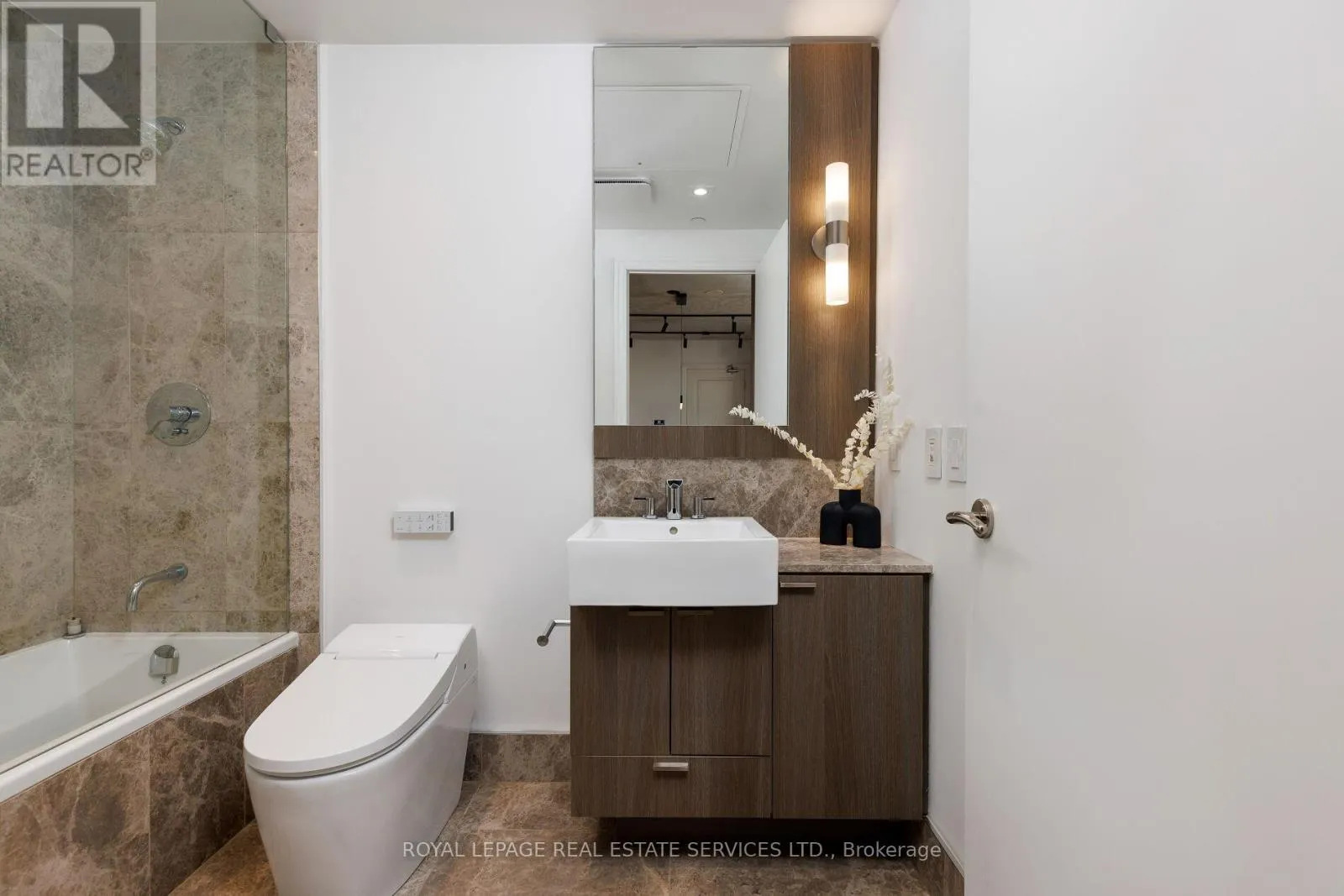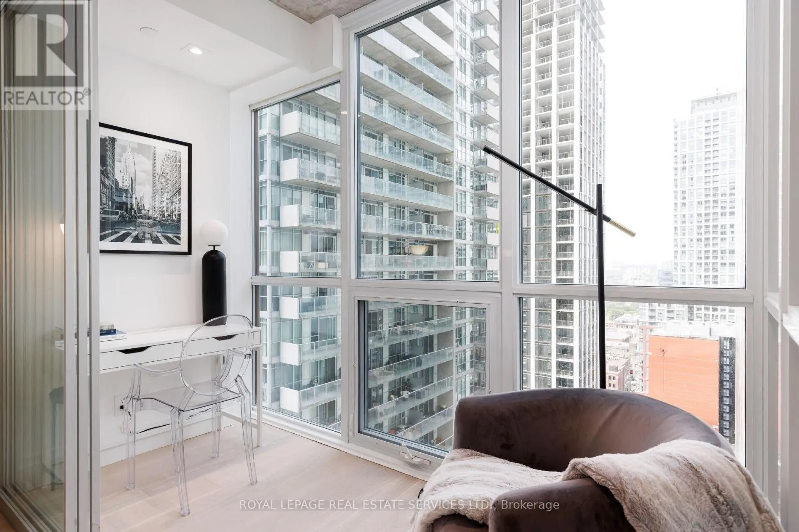 King St W & Blue Jays Way Welcome to Bisha Hotel & Residences ft. Roof Top Infinity pool where world-class design meets sophisticated urban living. This meticulously renovated luxury suite has undergone a top-to-bottom transformation, with no detail overlooked. The suite has smart home fully automated features. Control everything from the main console (iPad) at entrance or through your phone (Lutron Lighting System w/ all lighting dimmable & ambient, SONOS sound system w/ 4 wired speakers throughout condo, Nest WiFi Thermostat, Smart Toilet-Bidet, Smart Sensor Faucet). Step into an airy, open-concept space with 9-foot exposed concrete ceilings, 7.5 European White Ash engineered hardwood floors, & 7.5 designer baseboards throughout. The bright living and dining area is anchored by a custom millwork entertainment unit ft. integrated ambient lighting, a pop-up receptacle, and a Samsung 55 QLED TV. Floor-to-ceiling sliding glass doors open to a private balcony w/ premium composite decking and captivating city views. The chef-inspired kitchen boasts quartz countertops & backsplash, integrated high-end appliances, sleek valance, track lighting, & a functional center island with linear suspension chandelier perfect for entertaining. The primary bedroom offers custom millwork, pendant lighting, & a double sliding-door closet w/ motion sensor lighting & glass panels. A versatile den, w/ floor-to-ceiling windows & pot lighting, making it ideal as a home office or lounge. Indulge in a lavish 4-piece bath w/ a custom floating vanity, oversized mirror, custom glass shower enclosure over the tub, a smart bidet toilet, & a motion-sensor faucet. Enjoy 5-star amenities including: 24-hour concierge, meeting rooms, gym, infinity pool, rooftop deck, rooftop restaurant & bar + more. Steps away from Rogers Centre, Convention Centre, Roy Thomson Hall, Tiff, TTC, GO, fine restaurants, & shopping, Walk Score of 99 and Transit Score of 100! This is more than a home its a statement in modern luxury living. (id:27476)
