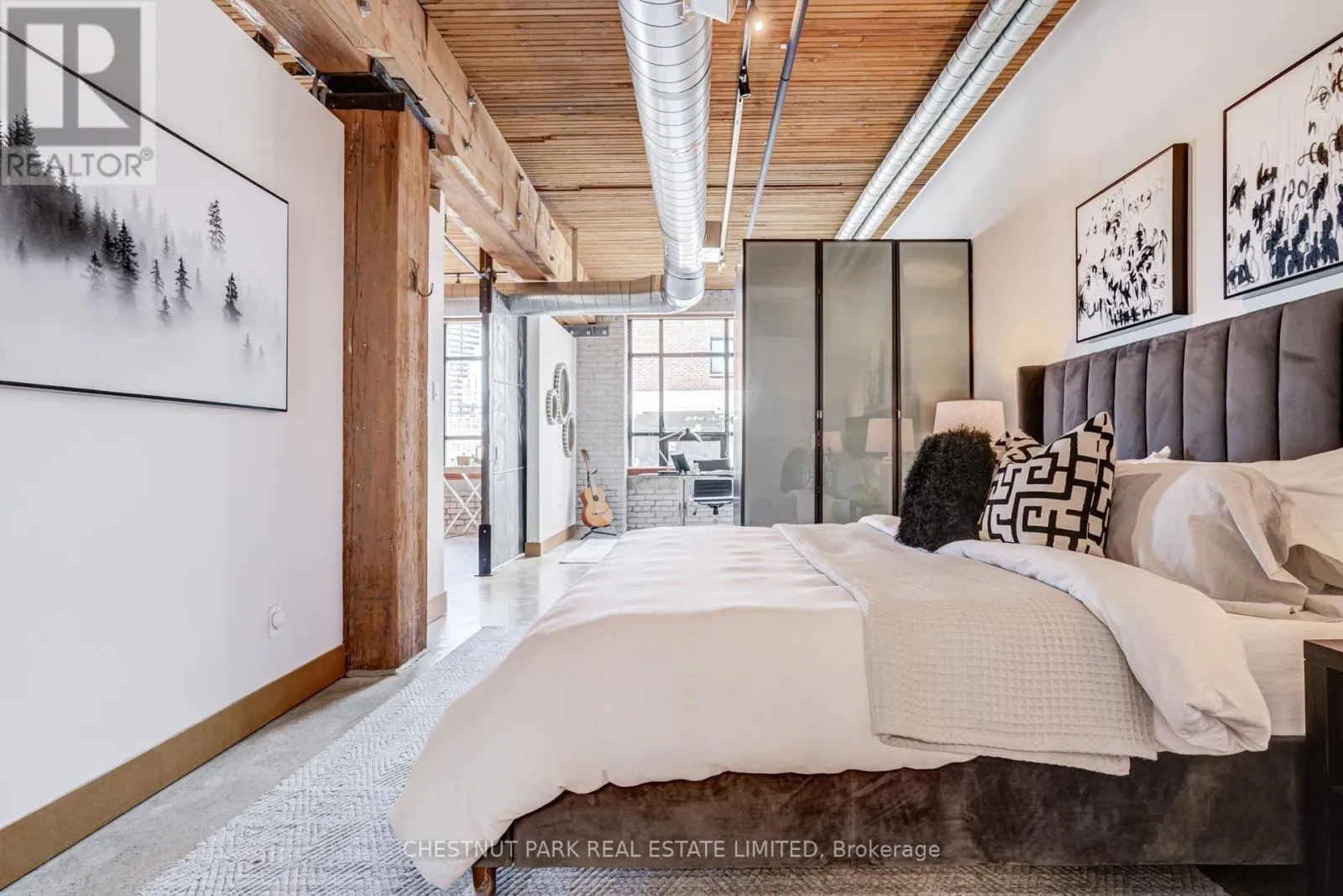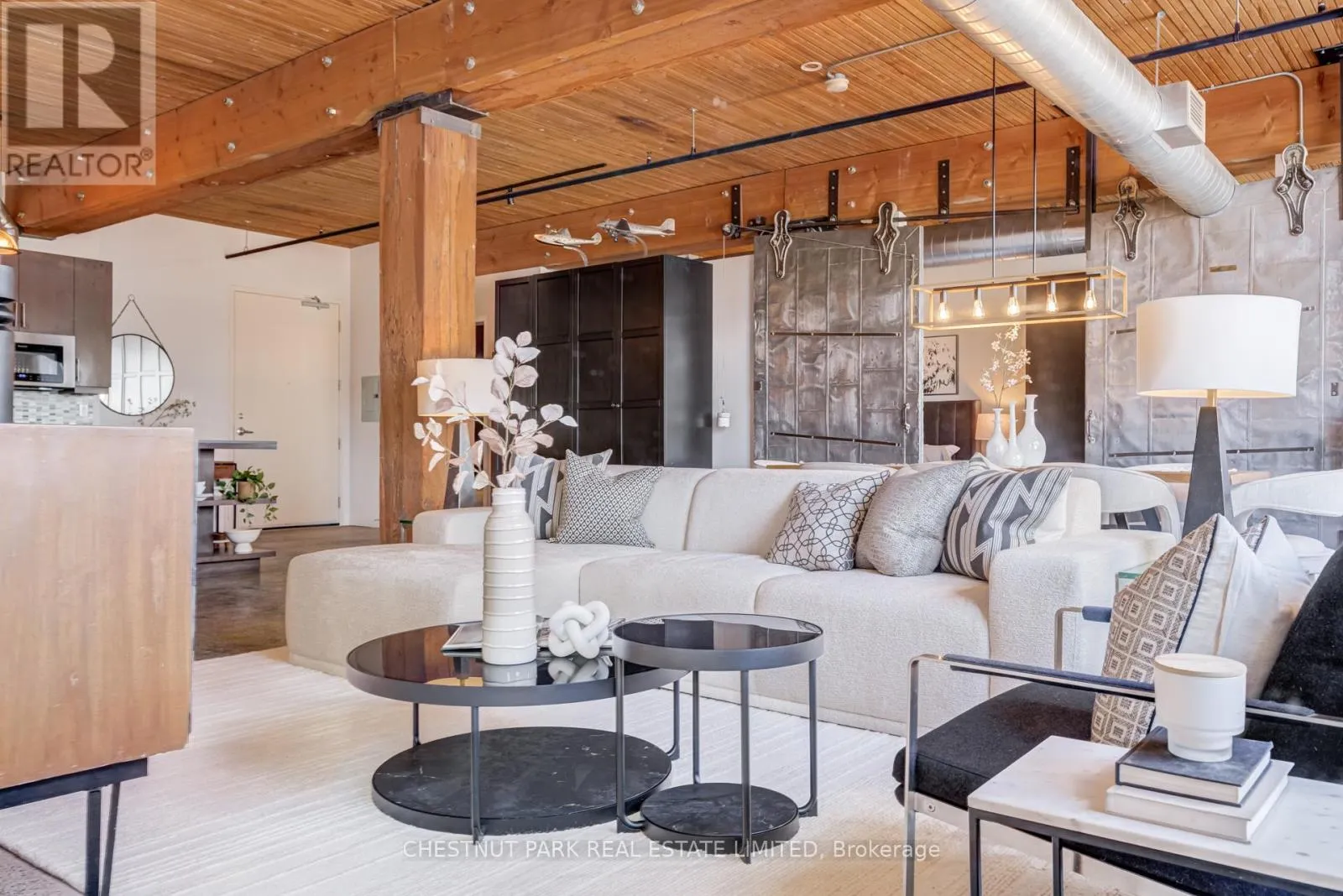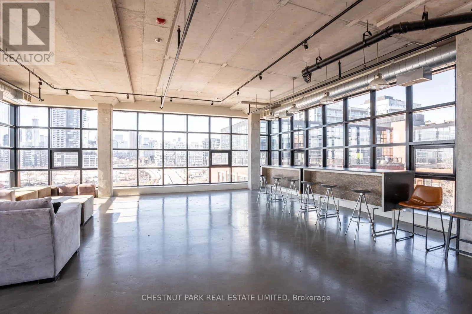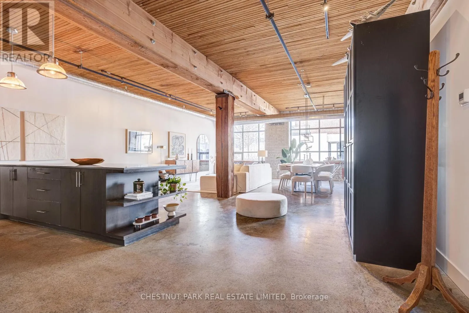 Broadview & Queen St E Spectacular brick-and-beam true hard loft in the Broadview Lofts, one of Toronto's most iconic and in the Broadview sought-after hard loft conversions. Perfectly positioned in the heart of vibrant Riverside, this rare extra-wide 2-bedroom, 2-bathroom residence offers almost 1300 sq. ft. of authentic industrial-chic living designed for those who appreciate character, scale, and style.From the moment you enter, the architectural details make a statement. Soaring 10.5 ft. wood beam ceilings, original Douglas fir posts, exposed brick walls, polished concrete floors, oversized warehouse windows, and original metal doors create a dramatic yet warm aesthetic that simply cannot be replicated in new construction. Every element reflects the building's rich history while offering the comfort and functionality modern urban professionals expect.The expansive open-concept layout provides exceptional flexibility for entertaining, working from home, or creating distinct living and dining zones without sacrificing flow. The extra width of the suite enhances the sense of volume and light, while two full bathrooms offer rare practicality in authentic hard loft living. Whether hosting dinner parties, enjoying quiet evenings in, or designing a space that reflects your personal brand and creativity, this loft adapts effortlessly to your lifestyle.Exclusive underground parking and a large locker add everyday convenience, while the surrounding neighbourhood offers some of the city's best cafés, restaurants, boutiques, fitness of the studios, and transit options just steps from your door.This is more than a condo. It is a statement space in a landmark building, offering scale, statement space authenticity, and an unmatched east-end energy that continues to define Toronto living. (id:27476)