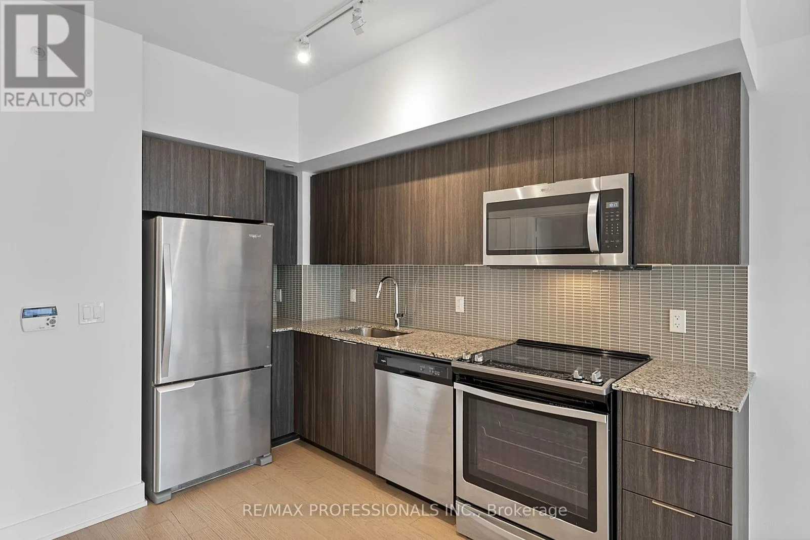 Cross Streets: Marine Parade & Lake Shore. ** Directions: Turn onto Shore Breeze off of Lake Shore Blvd. Welcome to Eau Du Soleil Sky Tower in Humber Bay Shores, in the heart of Etobicoke's vibrant waterfront community. This beautifully maintained 1 Bedroom + Tech suite offers east-facing city and lake views, soaring 9-foot ceilings and floor-to-ceiling windows that fill the space with natural light. Freshly painted and professionally cleaned, this move-in ready unit features a modern open-concept layout with wide-plank engineered hardwood flooring throughout. This superb unit includes a chef-inspired kitchen with stone countertops, stainless steel appliances and a mini glass subway tile backsplash, a spacious living area, ideal for both everyday living and entertaining, with a walk-out to a large 4'7" x 19'10" balcony overlooking the city and lake, a generous bedroom with a double closet and a second walk-out to the balcony, a modern 4-piece bathroom and convenient ensuite laundry. One underground parking space is included! Residents enjoy exceptional resort-style amenities including a 24-hour concierge, indoor saltwater pool, fully equipped fitness centre, yoga and pilates studio, sauna, theatre room, games and party rooms, guest suites, rooftop deck and outdoor lounge with BBQs and cabanas and more! Located in the highly sought-after Humber Bay Shores neighbourhood, steps to boutique shopping, cafes and popular restaurants including La Vecchia, Firkin on Bay, Eden Trattoria, Huevos Gourmet and Birds & Beans Cafe. Enjoy nearby Jean Augustine Park, the scenic Martin Goodman Trail along the waterfront and the popular HBSCA seasonal Farmers' Market held on Saturdays. Westlake Village is directly across the street with Metro, LCBO, Starbucks and everyday conveniences. TTC at your doorstep, easy access to Mimico GO Station and the Gardiner Expressway for commuting downtown. Experience the best of lakeside city living in one of Etobicoke's most dynamic waterfront communities! (id:27476)