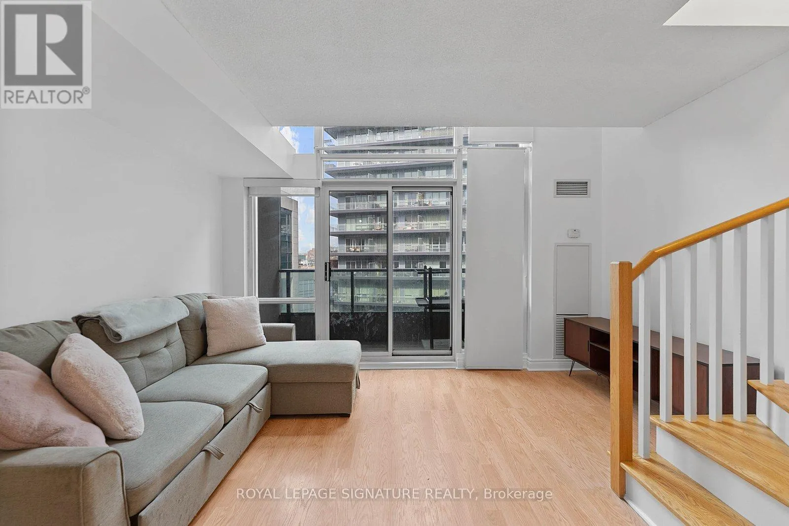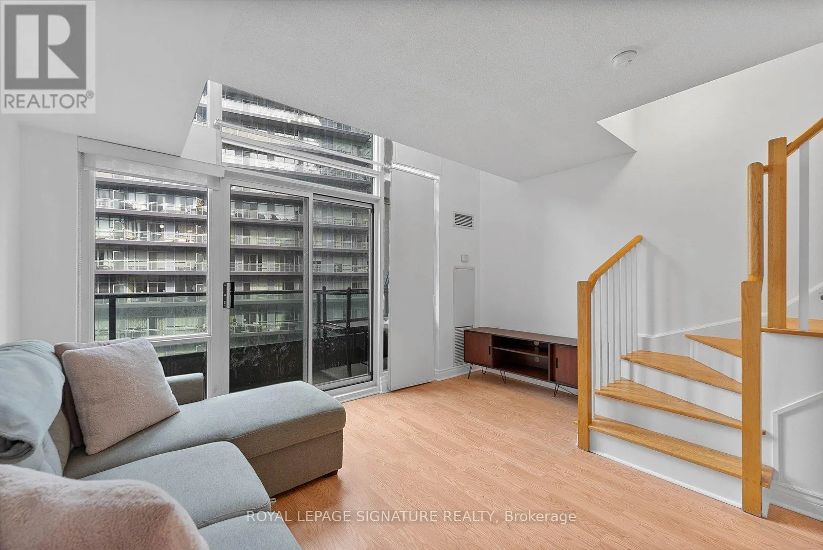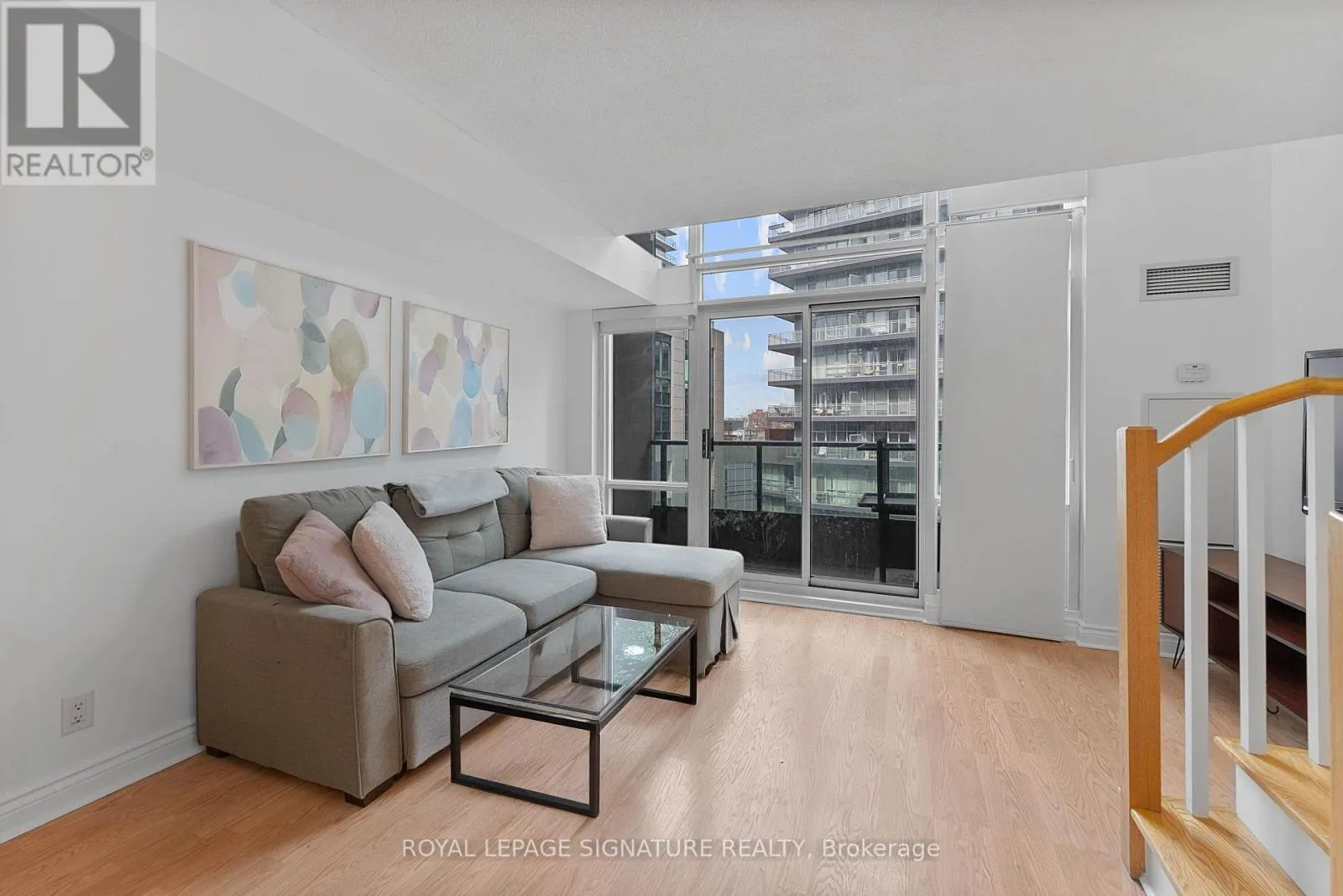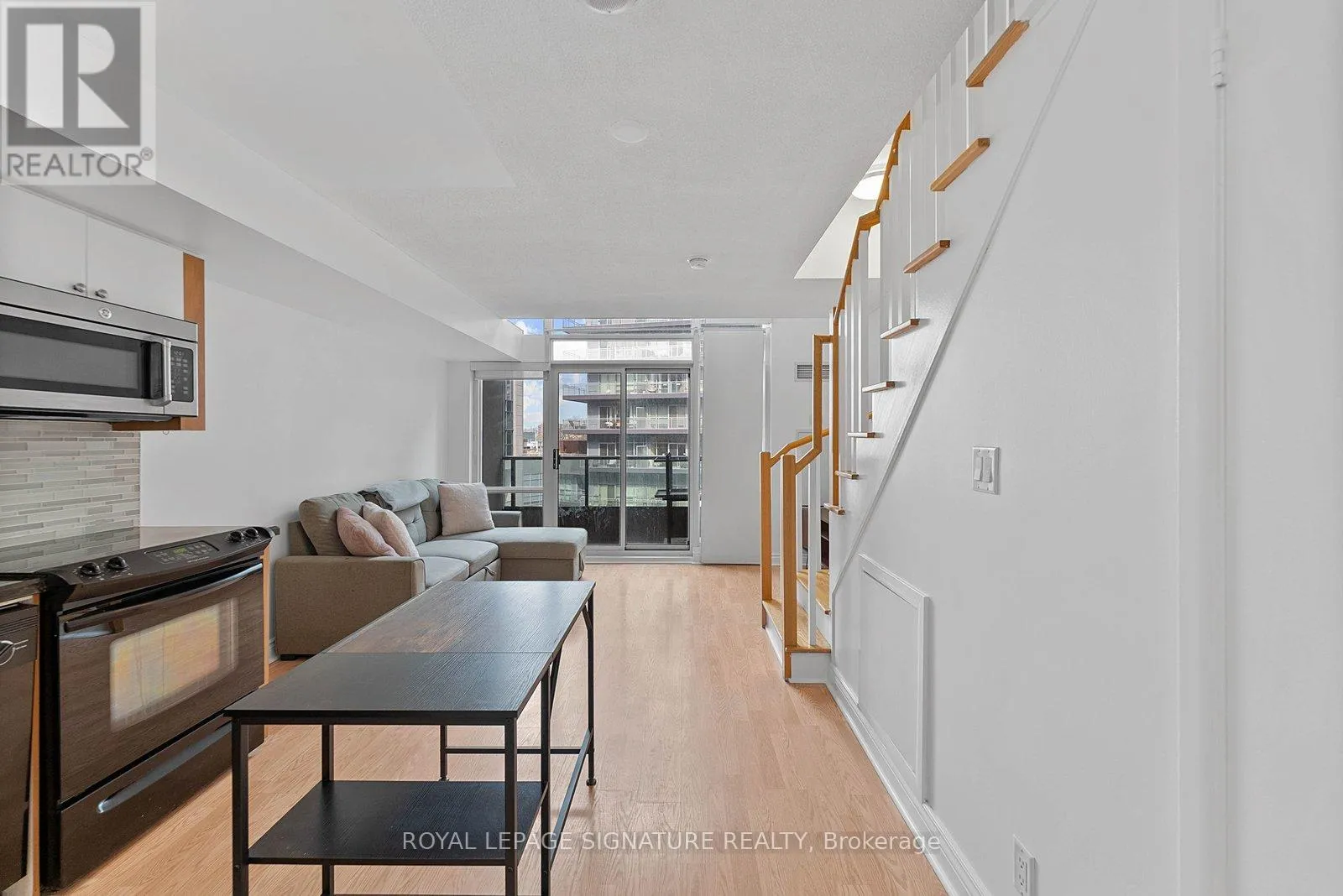 Bathurst And Lake Shore Turn-key and freshly painted, this bright two-storey suite offers a functional layout and exceptional natural light. The kitchen is generously sized and overlooking the living room, creating an open and connected main living space . The living room features a walk-out to the balcony and dramatic two-storey, floor-to-ceiling windows that fill the suite with natural light. A convenient 2-piece powder room completes the main level. Upstairs, the spacious bedroom includes in-suite laundry and a private ensuite bath, offering a comfortable and practical retreat. Ideally located close to everyday amenities, with Loblaws across the street and the Fleet streetcar at your doorstep. Enjoy being minutes from the waterfront and green space at Coronation Park. Parking and locker included. (id:27476)