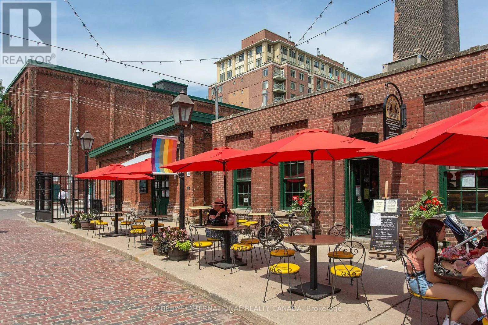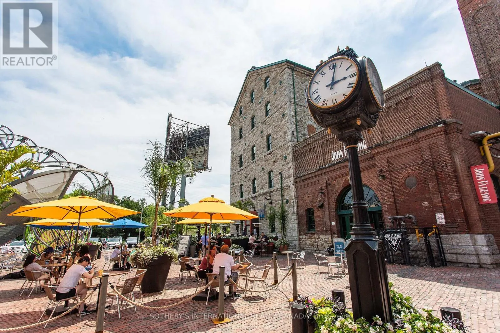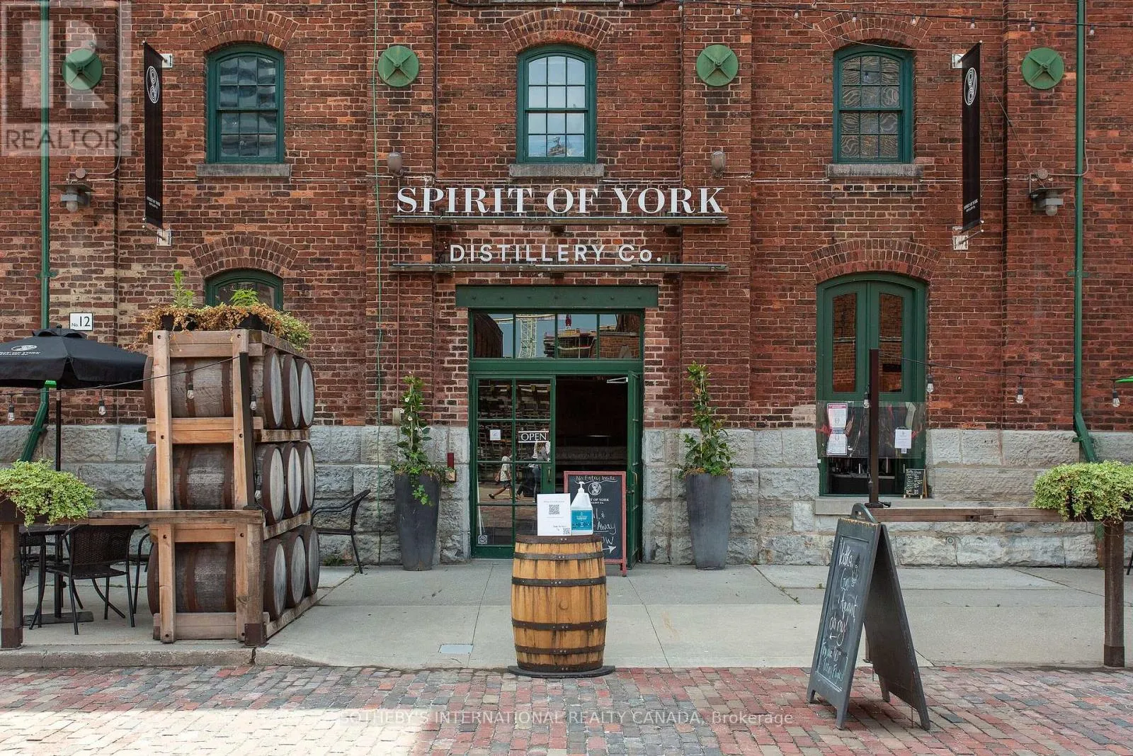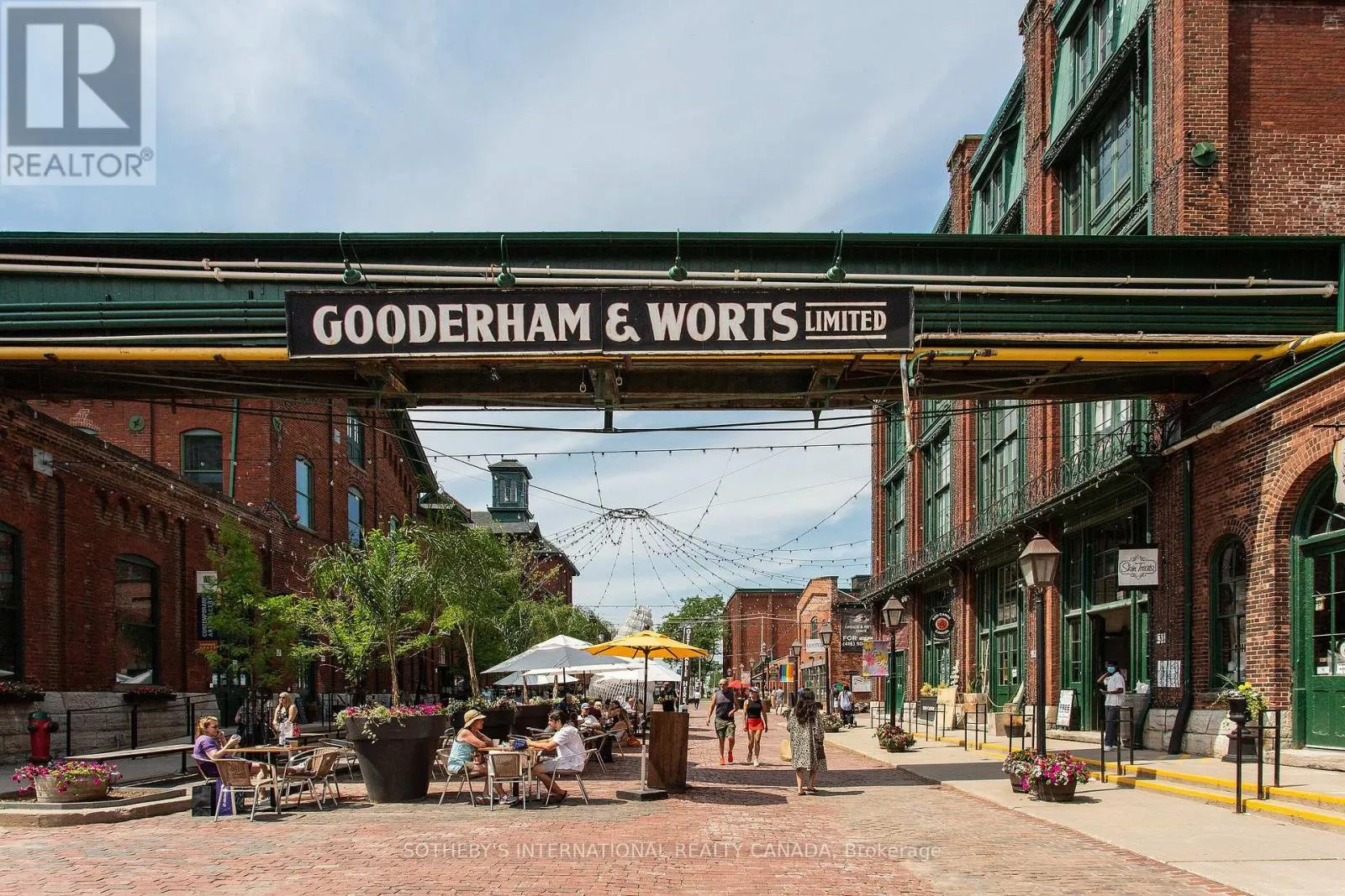 Mill + Cherry Offering a composed expression of city living with the historic Distillery District, this fully furnished two bedroom, two bathroom suite is thoughtfully arranged as a turnkey short term residence, designed for ease, comfort and flexibility. Hardwood floors and integrated millwork create a cohesive interior, while the updated kitchen anchors the living space with a centre island, bamboo cabinetry, stainless steel appliances, and generous preparation space. Natural light moves easily through the combined living and dining areas, framed by floor to ceiling south facing windows and a walkout to a large private balcony. The suite's split bedroom plan provides both privacy and adaptability. The primary bedroom features a walk in closet, a well proportioned ensuite bathroom, and a quiet south facing outlook. The second bedroom offers versatility as a guest room, office, or extended living space, also benefiting from southern exposure. Warm materials, refined finishes, and an intuitive layout establish a calm contemporary atmosphere. Offered fully furnished and configured for short term occupancy, the suite is ideally suited for executives, relocations, and professionals seeking a refined, turnkey residence in the city. Positioned within one of Toronto's most distinctive neighbourhoods, the Distillery District's cobblestone streets, galleries, cafés, and restaurants unfold just outside the door. Convenient access to the Financial District, St Lawrence Market, King East, transit, and major routes further enhances its ease of living. Parking and a bicycle are included. (id:27476)