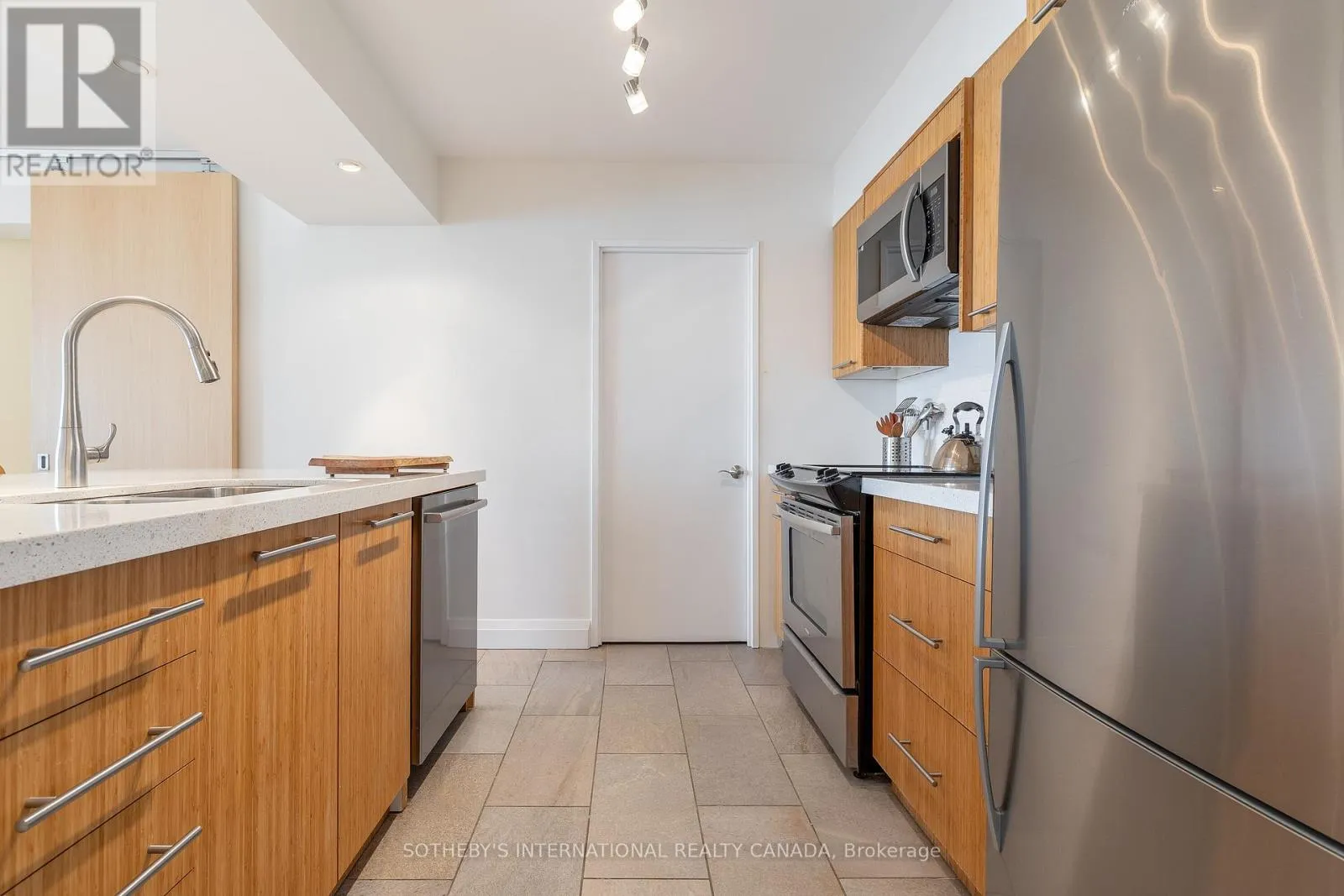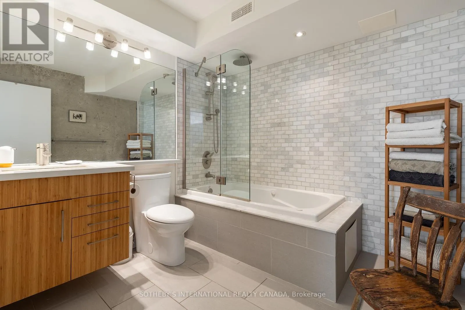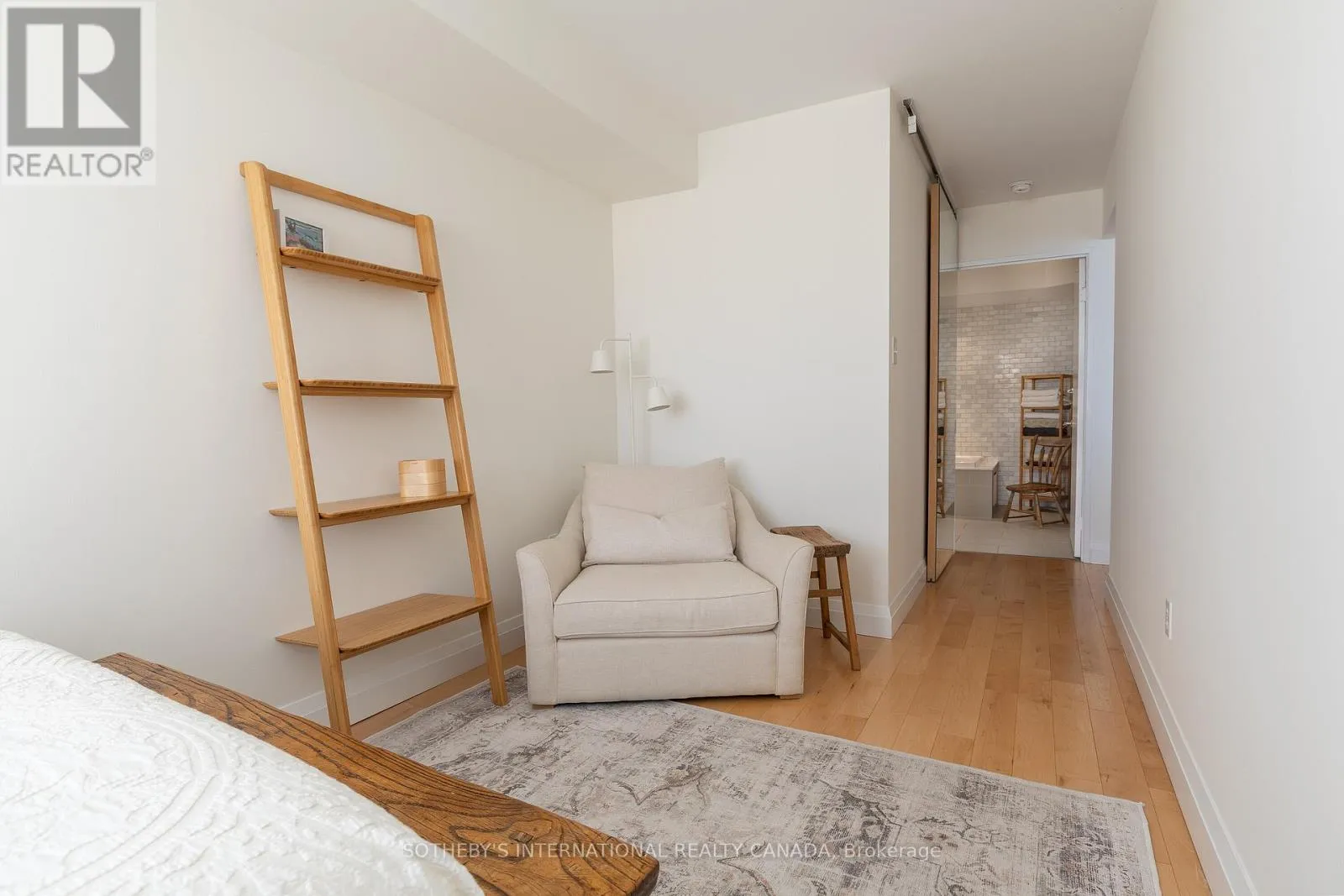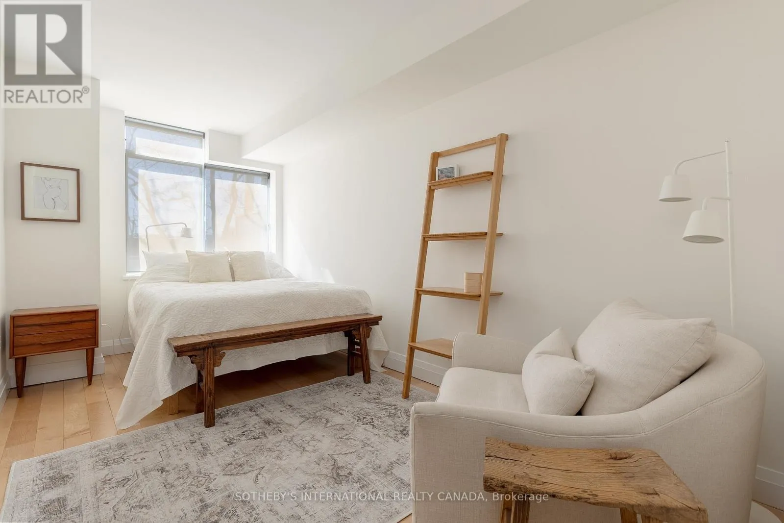 Mill + Cherry Offering a composed expression of city living with the historic Distillery District, this fully furnished two bedroom, two bathroom suite is thoughtfully arranged as a turnkey short term residence, designed for ease, comfort and flexibility. Hardwood floors and integrated millwork create a cohesive interior, while the updated kitchen anchors the living space with a centre island, bamboo cabinetry, stainless steel appliances, and generous preparation space. Natural light moves easily through the combined living and dining areas, framed by floor to ceiling south facing windows and a walkout to a large private balcony. The suite's split bedroom plan provides both privacy and adaptability. The primary bedroom features a walk in closet, a well proportioned ensuite bathroom, and a quiet south facing outlook. The second bedroom offers versatility as a guest room, office, or extended living space, also benefiting from southern exposure. Warm materials, refined finishes, and an intuitive layout establish a calm contemporary atmosphere. Offered fully furnished and configured for short term occupancy, the suite is ideally suited for executives, relocations, and professionals seeking a refined, turnkey residence in the city. Positioned within one of Toronto's most distinctive neighbourhoods, the Distillery District's cobblestone streets, galleries, cafés, and restaurants unfold just outside the door. Convenient access to the Financial District, St Lawrence Market, King East, transit, and major routes further enhances its ease of living. Parking and a bicycle are included. (id:27476)