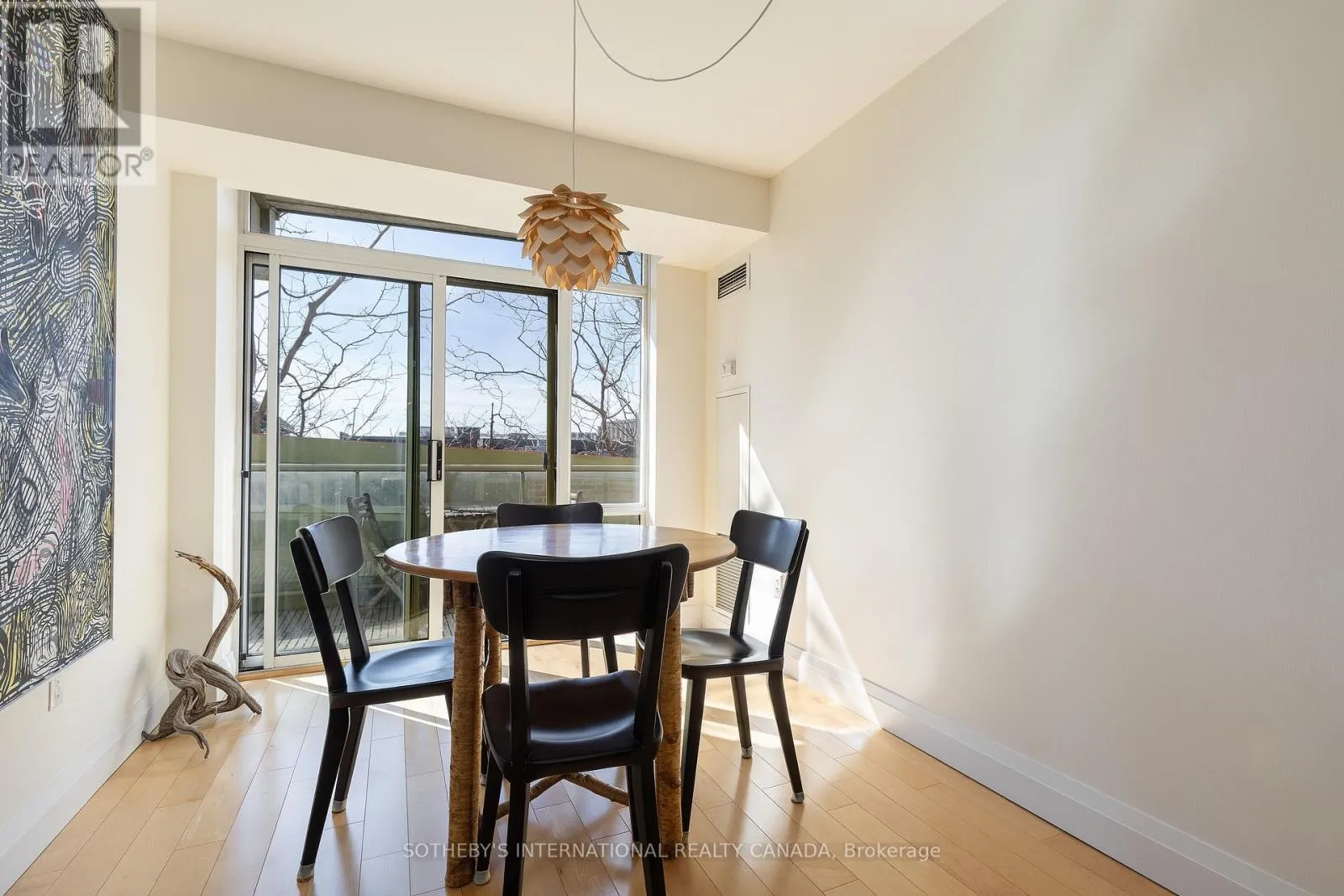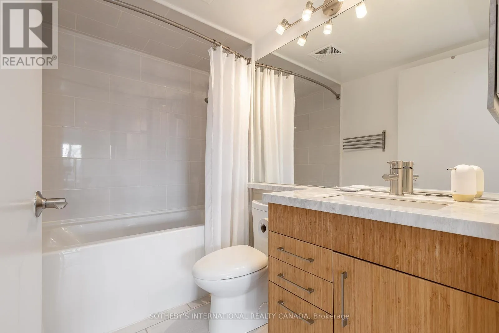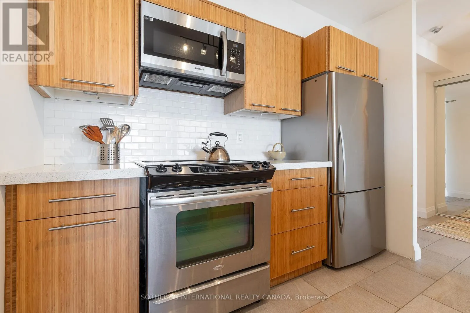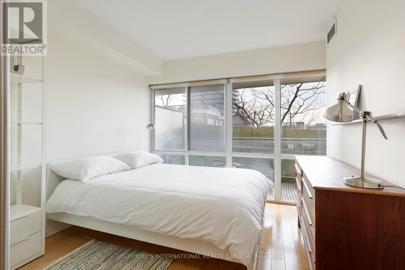 Mill + Cherry Offering a composed expression of city living with the historic Distillery District, this fully furnished two bedroom, two bathroom suite is thoughtfully arranged as a turnkey short term residence, designed for ease, comfort and flexibility. Hardwood floors and integrated millwork create a cohesive interior, while the updated kitchen anchors the living space with a centre island, bamboo cabinetry, stainless steel appliances, and generous preparation space. Natural light moves easily through the combined living and dining areas, framed by floor to ceiling south facing windows and a walkout to a large private balcony. The suite's split bedroom plan provides both privacy and adaptability. The primary bedroom features a walk in closet, a well proportioned ensuite bathroom, and a quiet south facing outlook. The second bedroom offers versatility as a guest room, office, or extended living space, also benefiting from southern exposure. Warm materials, refined finishes, and an intuitive layout establish a calm contemporary atmosphere. Offered fully furnished and configured for short term occupancy, the suite is ideally suited for executives, relocations, and professionals seeking a refined, turnkey residence in the city. Positioned within one of Toronto's most distinctive neighbourhoods, the Distillery District's cobblestone streets, galleries, cafés, and restaurants unfold just outside the door. Convenient access to the Financial District, St Lawrence Market, King East, transit, and major routes further enhances its ease of living. Parking and a bicycle are included. (id:27476)