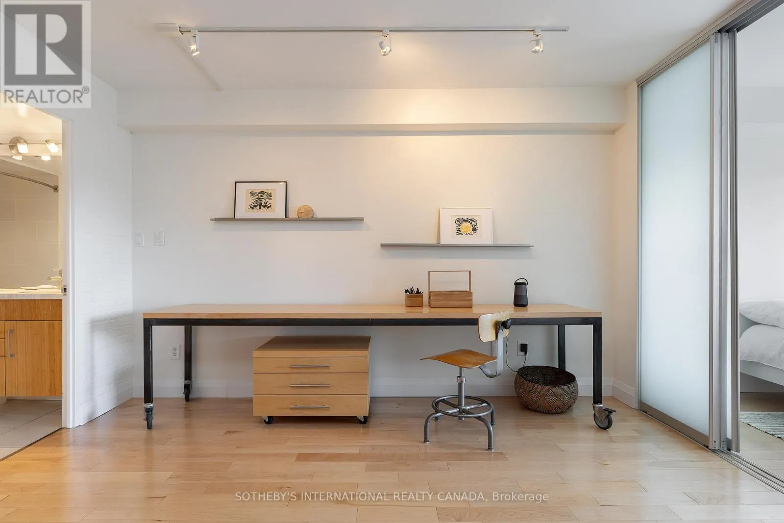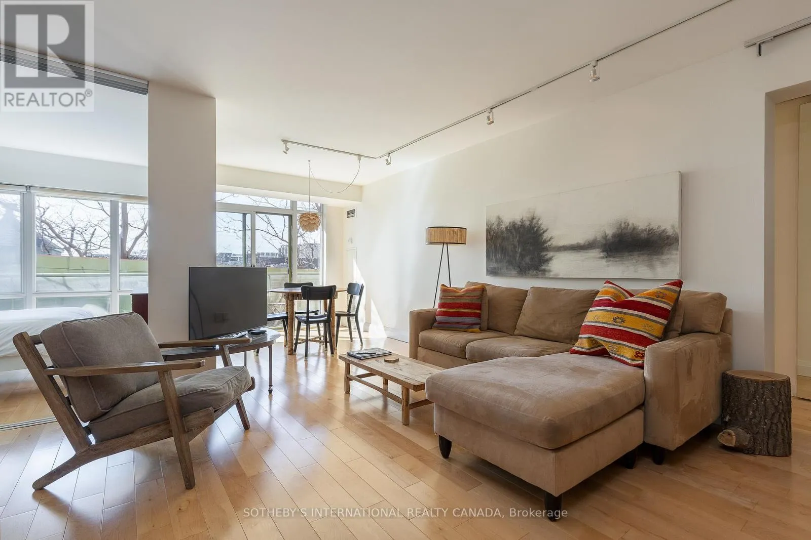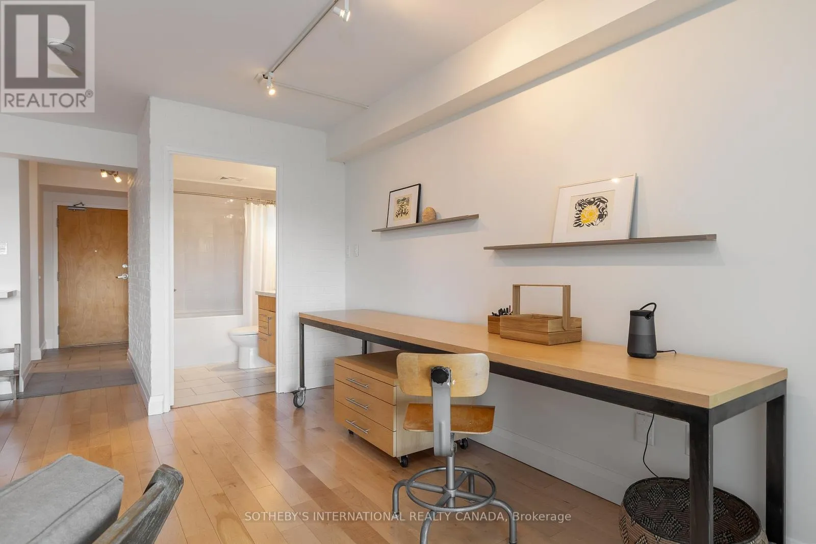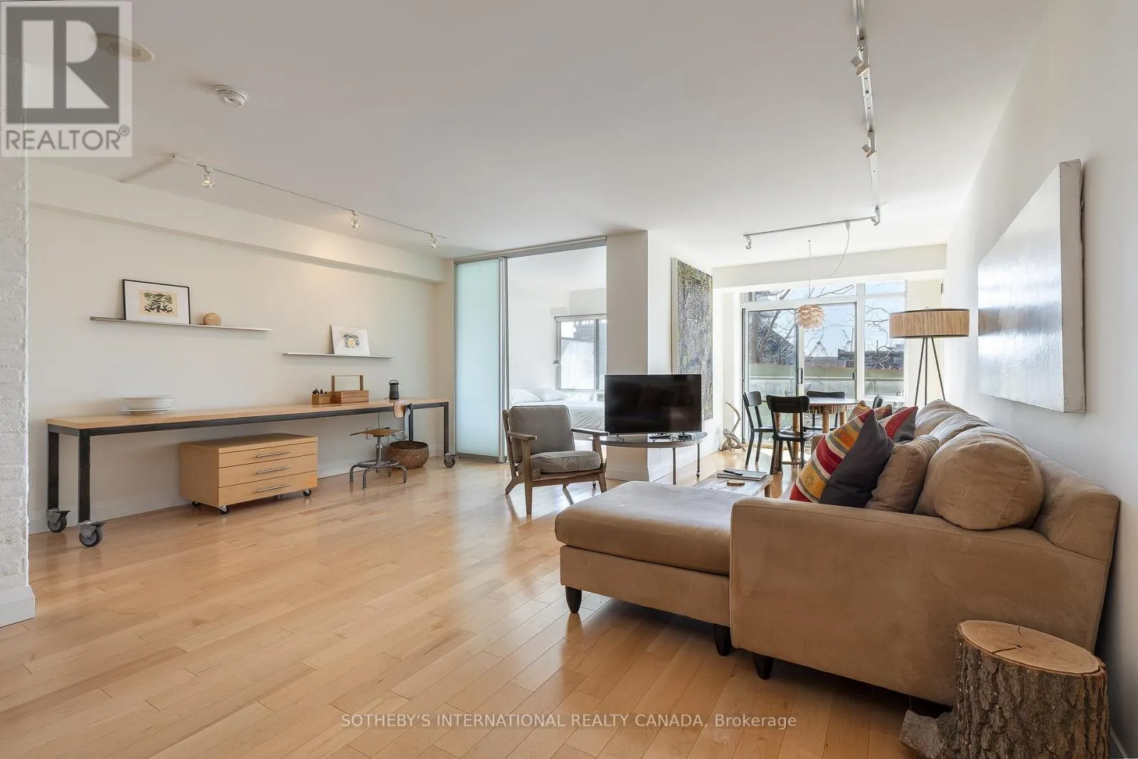 Mill + Cherry Offering a composed expression of city living with the historic Distillery District, this fully furnished two bedroom, two bathroom suite is thoughtfully arranged as a turnkey short term residence, designed for ease, comfort and flexibility. Hardwood floors and integrated millwork create a cohesive interior, while the updated kitchen anchors the living space with a centre island, bamboo cabinetry, stainless steel appliances, and generous preparation space. Natural light moves easily through the combined living and dining areas, framed by floor to ceiling south facing windows and a walkout to a large private balcony. The suite's split bedroom plan provides both privacy and adaptability. The primary bedroom features a walk in closet, a well proportioned ensuite bathroom, and a quiet south facing outlook. The second bedroom offers versatility as a guest room, office, or extended living space, also benefiting from southern exposure. Warm materials, refined finishes, and an intuitive layout establish a calm contemporary atmosphere. Offered fully furnished and configured for short term occupancy, the suite is ideally suited for executives, relocations, and professionals seeking a refined, turnkey residence in the city. Positioned within one of Toronto's most distinctive neighbourhoods, the Distillery District's cobblestone streets, galleries, cafés, and restaurants unfold just outside the door. Convenient access to the Financial District, St Lawrence Market, King East, transit, and major routes further enhances its ease of living. Parking and a bicycle are included. (id:27476)