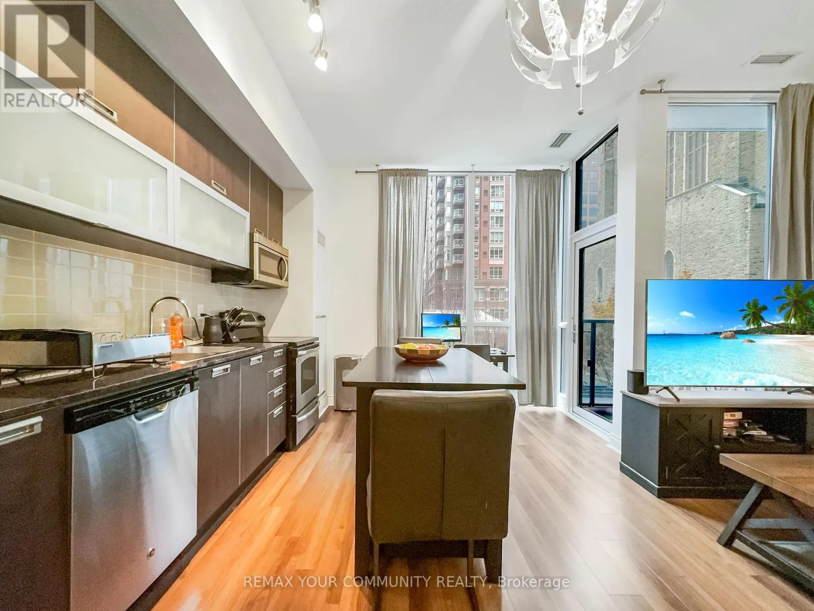 JARVIS ST/BLOOR ST. E. Incredible second floor, open concept unit with unobstructed west facing views! This well maintained unit includes laminate flooring throughout, a spacious primary bedroom with a walk-in closet, open concept kitchen/living room with full size stainless steel appliances, kitchen island and floor-ceiling windows. Perfect for working from home, or those craving extra space, the den offers much desired secondary living space for whatever your needs! You'll enjoy all the conveniences of a well-located building just minutes from Line 1 and 2 subways, DVP, grocery stores and the Yorkville neighbourhood. The building boasts amenities such as an indoor pool, gym, hot-tub, guest suites, concierge and more. ***No parking included with unit, but building does offer underground guest parking (with conditions* check with concierge or building management for further details). (id:27476)