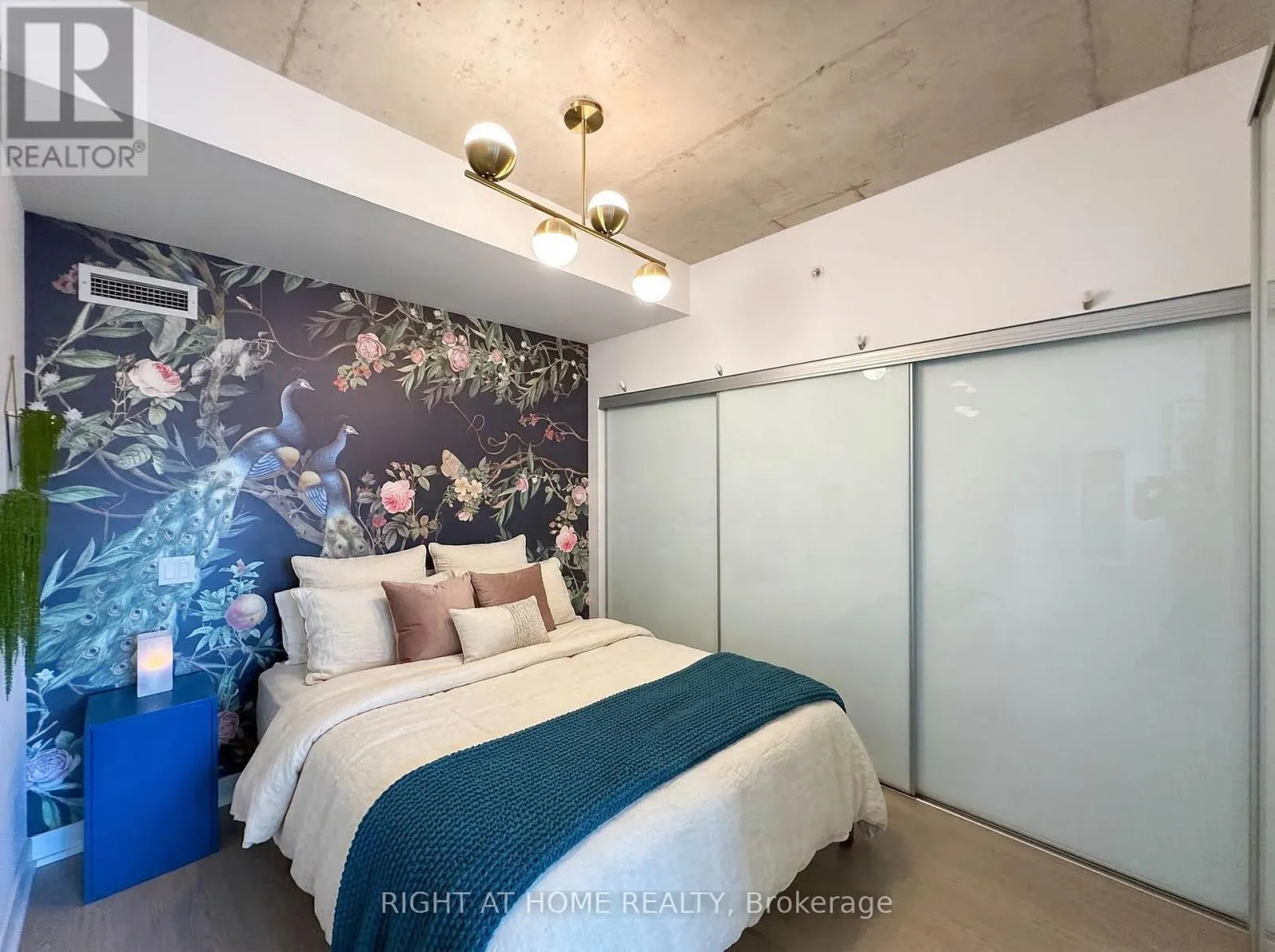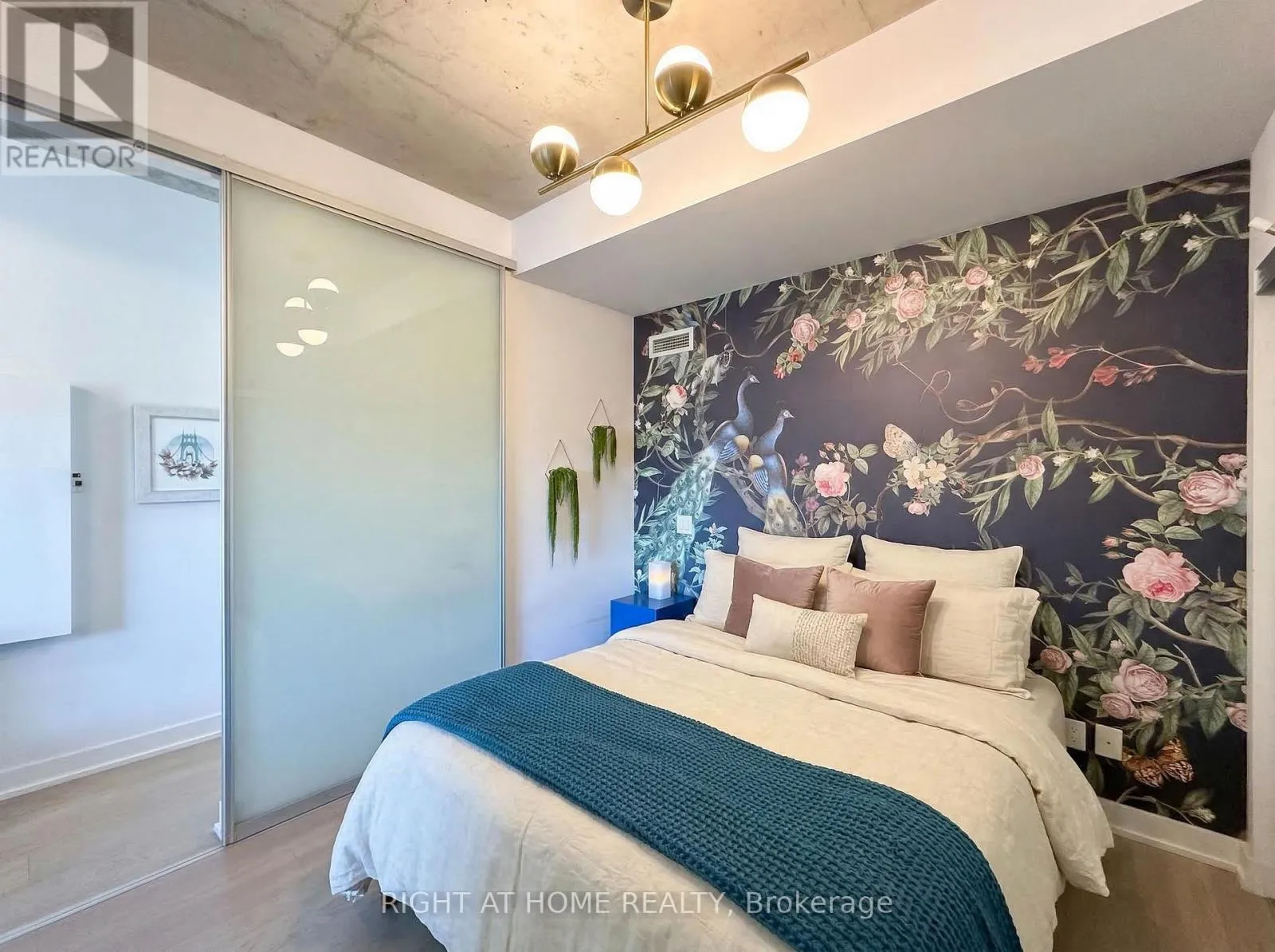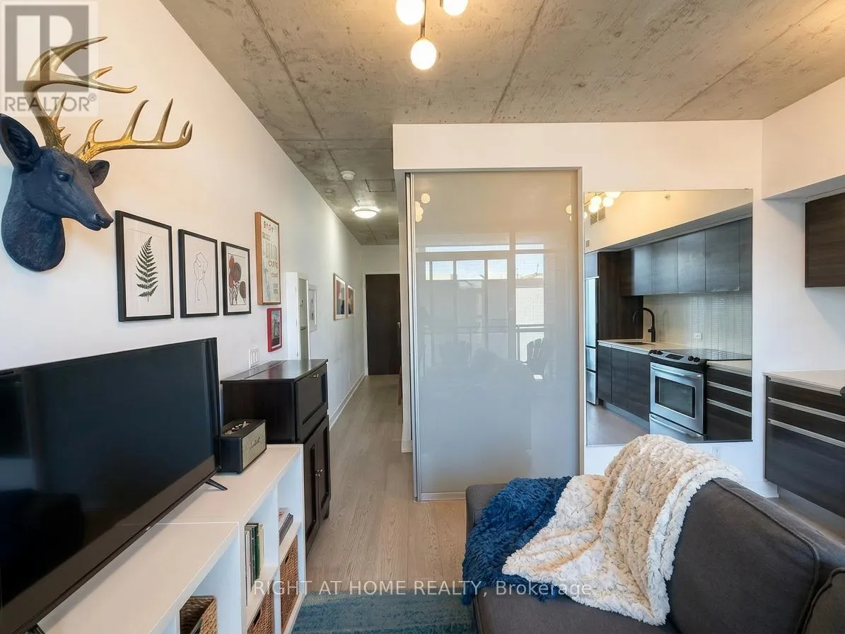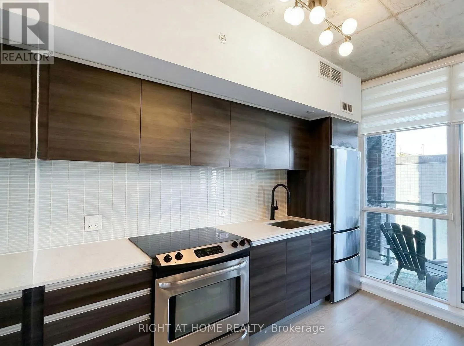 Cross Streets: Dundas/Carlaw. ** Directions: Intersection of Dundas and Carlaw. Functional and stylish 1-bedroom condo in the heart of Leslieville at Dundas & Carlaw. This bright suite features a well-designed open-concept living, dining, and kitchen layout with a walk-out balcony from the living room-perfect for morning coffee or evening relaxation. Thoughtful upgrades throughout include zebra roller blinds for graded light and privacy, modern light fixtures with dimmers, and custom built-in storage solutions. The bedroom features a full-wall (10+ ft) custom closet with shelving and drawers, while the hallway offers a custom shoe and coat closet with both long and short hanging space. Additional updates include a new fridge (2025), spray kitchen faucet, and freshly re-caulked kitchen backsplash and bathroom (2026). Gas BBQ hookup on the balcony. Located in vibrant Leslieville with excellent transit access and a large selection of local eateries, cafes, shops, and fitness studios just steps away. Large storage locker (5'-11" width x 5' depth x 6-8" height) on the same level as the unit available for an additional $100/month. Underground parking available for rent through Impark. (id:27476)