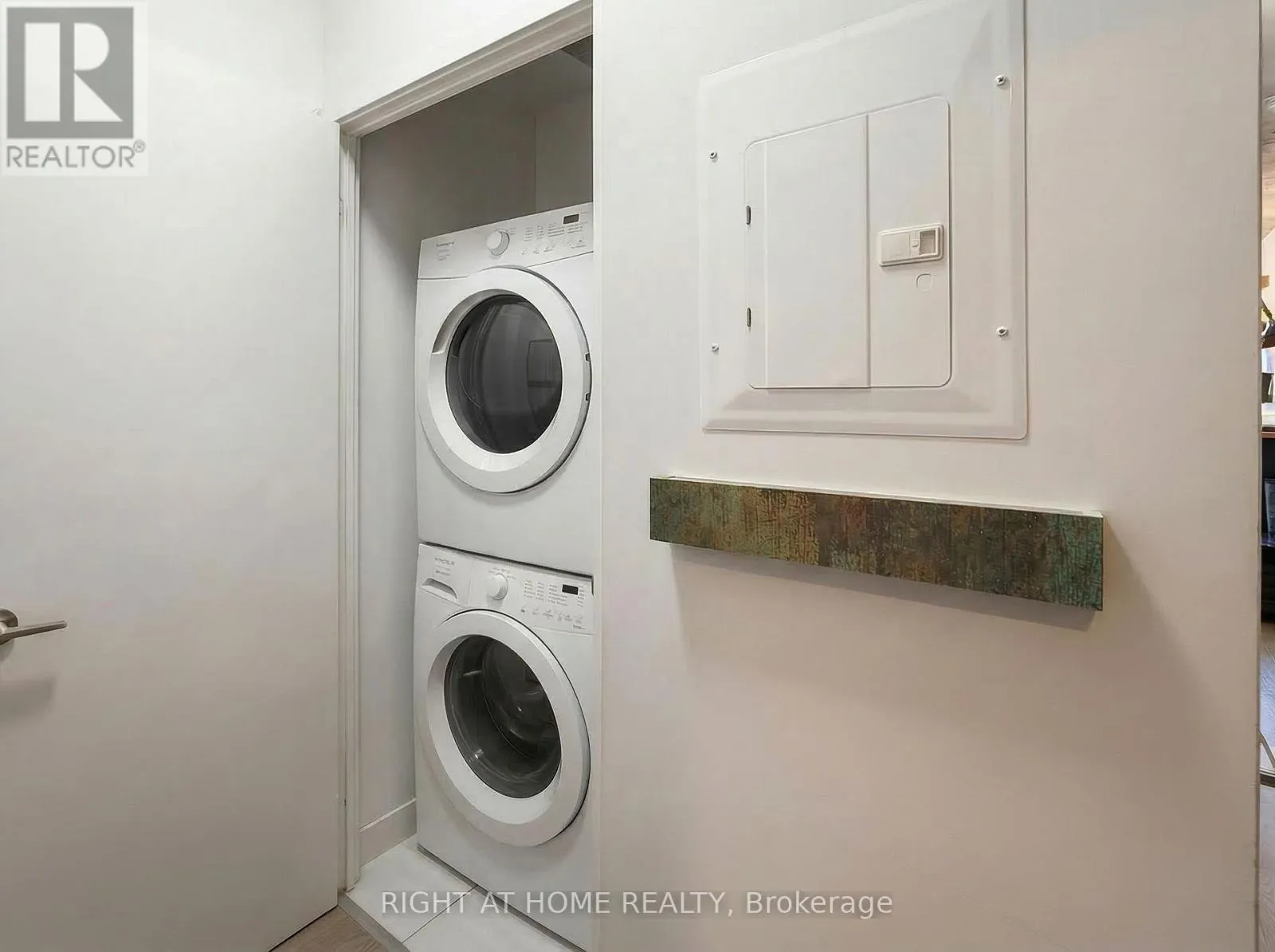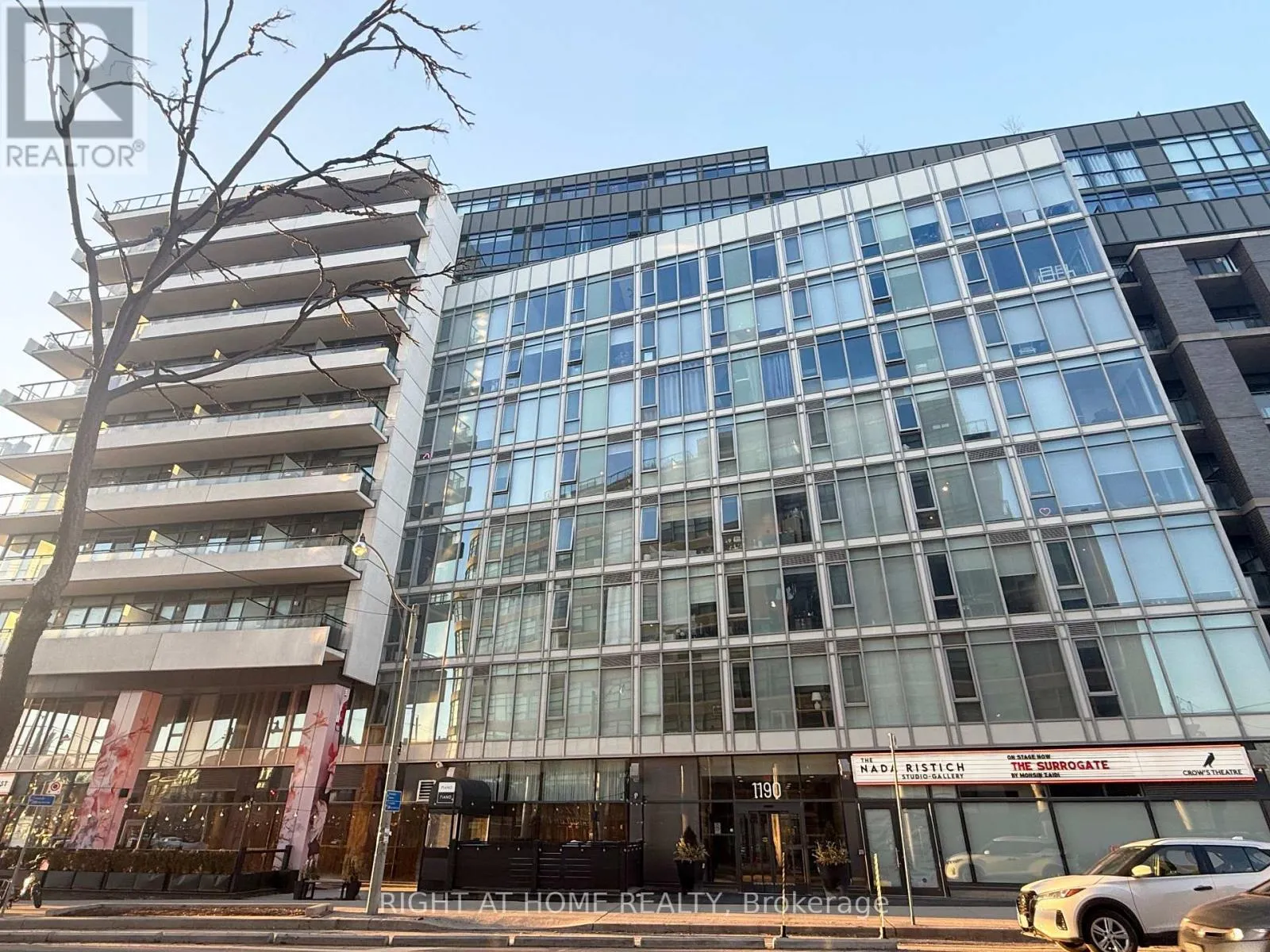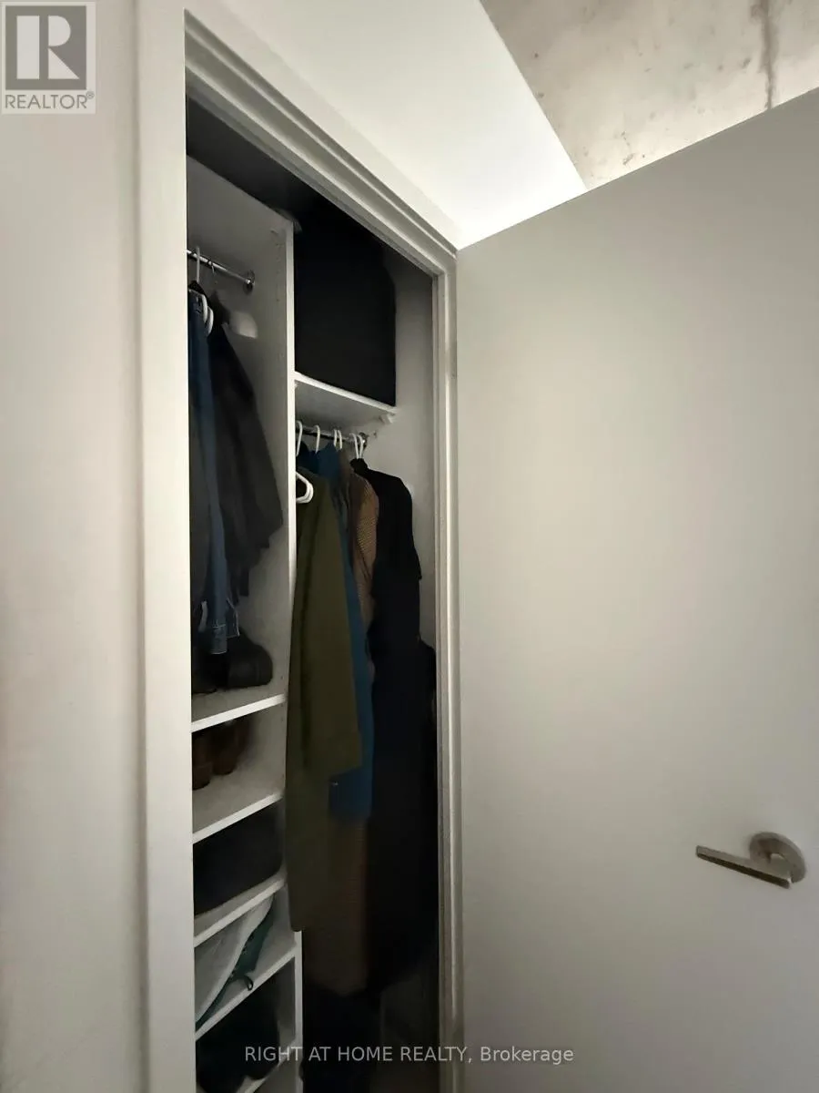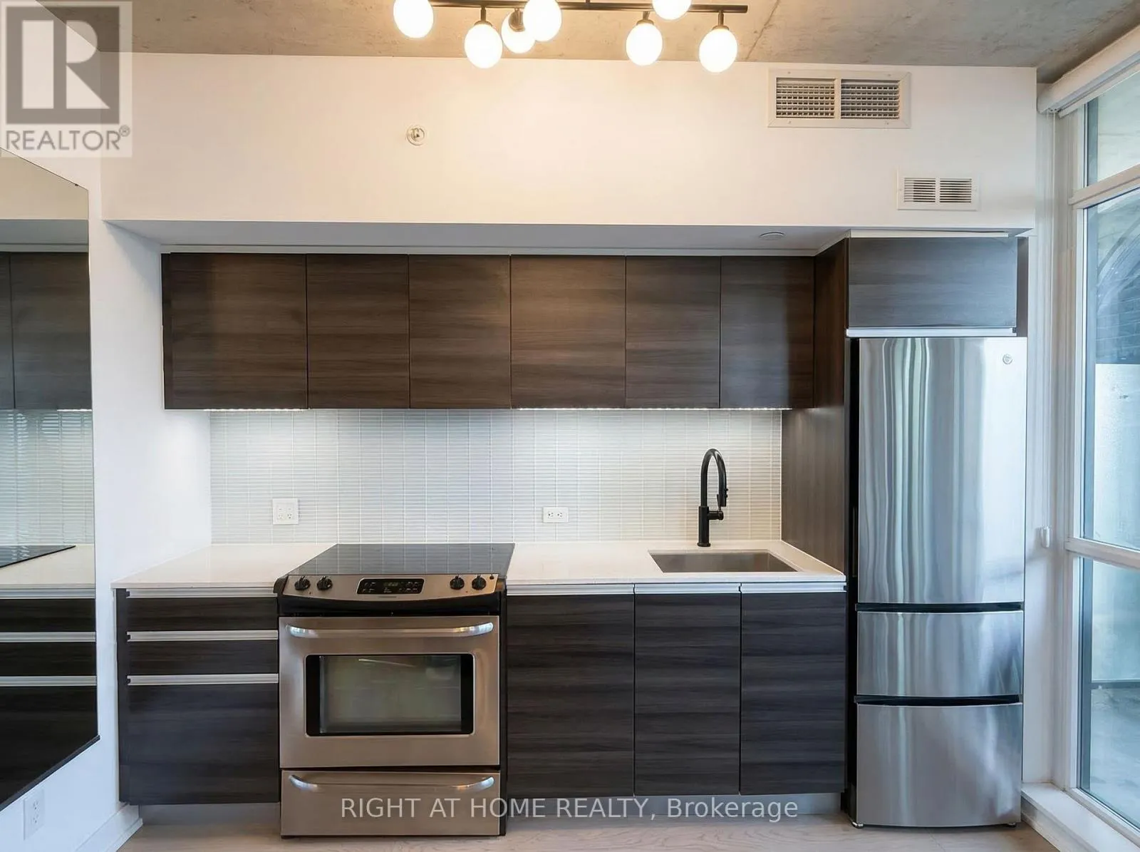 Cross Streets: Dundas/Carlaw. ** Directions: Intersection of Dundas and Carlaw. Functional and stylish 1-bedroom condo in the heart of Leslieville at Dundas & Carlaw. This bright suite features a well-designed open-concept living, dining, and kitchen layout with a walk-out balcony from the living room-perfect for morning coffee or evening relaxation. Thoughtful upgrades throughout include zebra roller blinds for graded light and privacy, modern light fixtures with dimmers, and custom built-in storage solutions. The bedroom features a full-wall (10+ ft) custom closet with shelving and drawers, while the hallway offers a custom shoe and coat closet with both long and short hanging space. Additional updates include a new fridge (2025), spray kitchen faucet, and freshly re-caulked kitchen backsplash and bathroom (2026). Gas BBQ hookup on the balcony. Located in vibrant Leslieville with excellent transit access and a large selection of local eateries, cafes, shops, and fitness studios just steps away. Large storage locker (5'-11" width x 5' depth x 6-8" height) on the same level as the unit available for an additional $100/month. Underground parking available for rent through Impark. (id:27476)