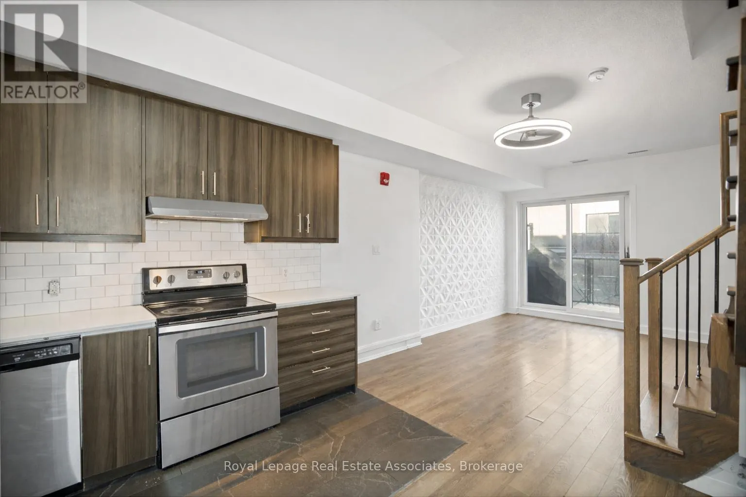 S Of Church On Weston Rd End unit 3-storey townhome offering 3 bedrooms, 3 bathrooms, and 1,334 sq ft of living space. The sun-filled open concept main floor features 9' ceilings and a bright, functional layout. The kitchen includes stainless steel appliances and a convenient nook for additional counter space and storage. The home has been freshly painted and features hardwood floor & tile throughout. The primary bedroom includes a walk-in closet and a fully renovated 4-piece ensuite, while the second and third bedrooms offer flexible space for family, guests, or a home office. Additional features include underground parking, locker and maintenance fees that cover: water, garbage removal, window cleaning, snow removal, and landscaping. Conveniently located near the UP Express and with quick access to Highways 401 and 400. (id:27476)