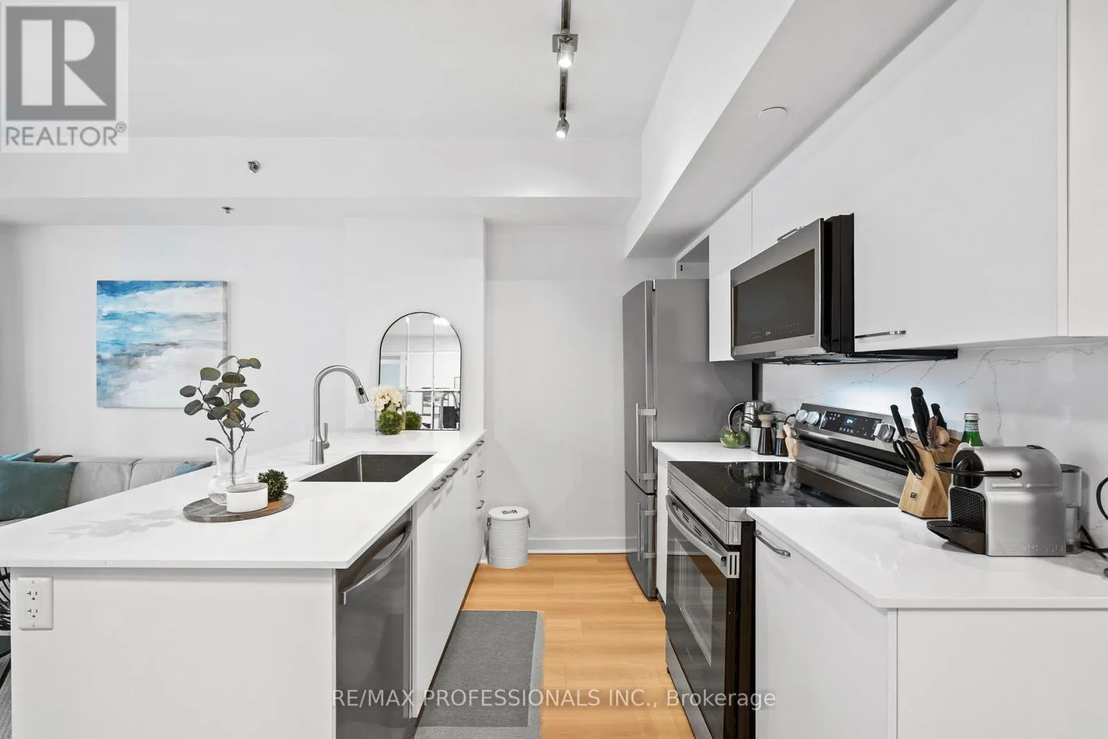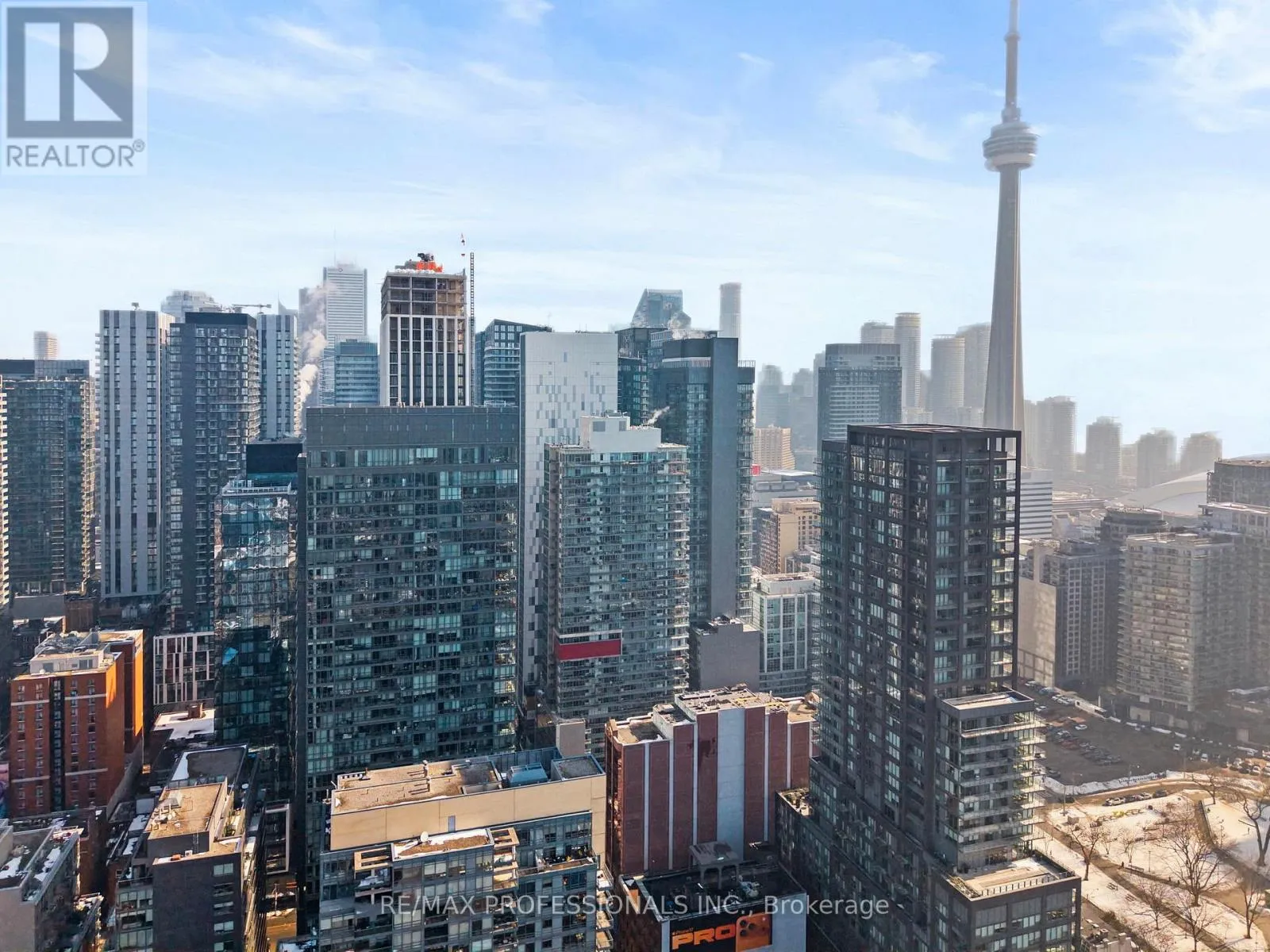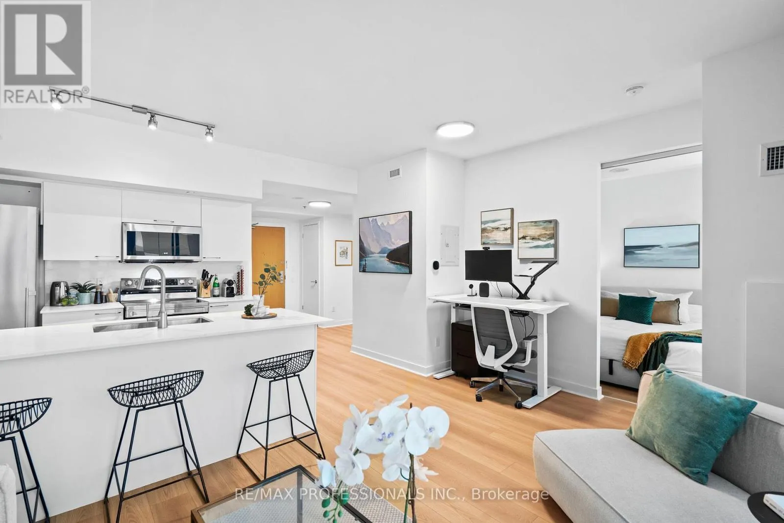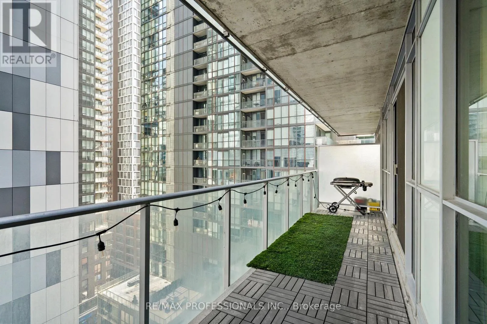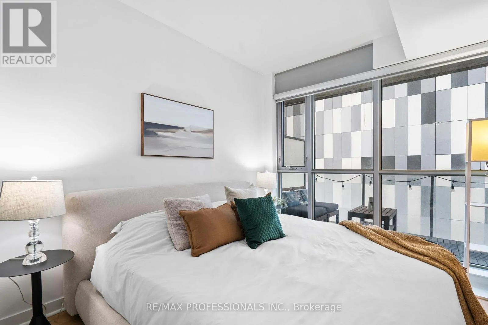 King St W & Spadina Ave Welcome to M5V Condominiums in the heart of Toronto's vibrant Entertainment District! This beautifully NEWLY RENOVATED and freshly painted 1 bedroom + large den, 1 bath suite offers 721 sqft. of thoughtfully designed living space and floor-to-ceiling windows. Featuring a chef's kitchen with quartz countertops and backsplash, stainless steel appliances and breakfast bar, complemented by new flooring and modern finishes throughout. The primary bedroom includes a walk-in closet, while the oversized den can function as a true second bedroom, spacious home office, or additional living area. A separate laundry room provides new LG Smart washer and dryer (2025) and rare in-suite storage for added convenience. Relax on your large private balcony which offers 159 sqft of outdoor living space. Enjoy premium amenities including a gym with free weights and cardio, Peloton bike studio, guest suite, rooftop terrace and games/party room, 24-hour concierge and free visitor parking. Steps to Rogers Centre, CN Tower, and transit in a prime King West location. Parking and locker included. (id:27476)