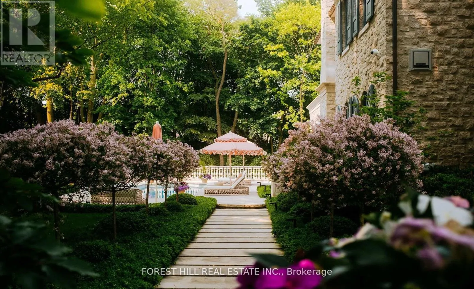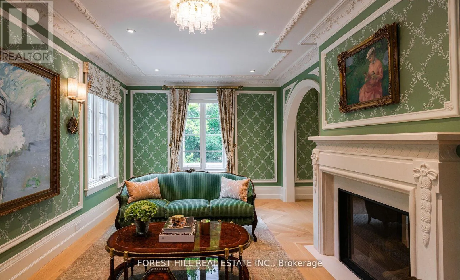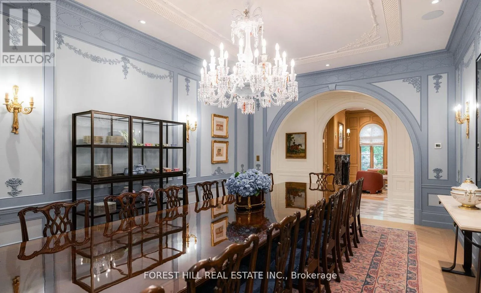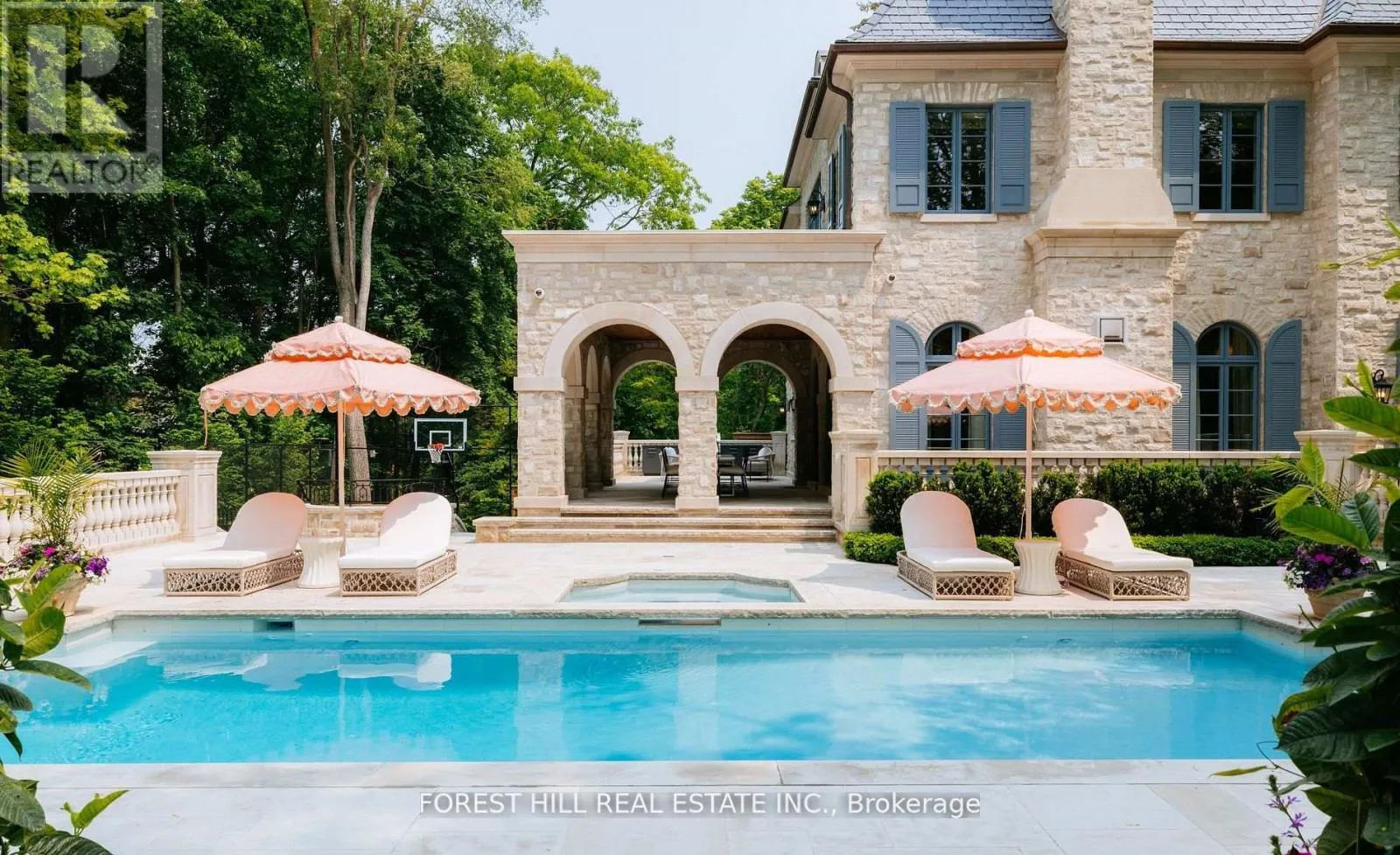 Forest Hill Rd/Larratt St Welcome to 221 Forest Hill Road, an architectural triumph with nearly 13,000 sq ft of living space on a private 17,000 sq ft lot, nestled along the Beltline Trail in the heart of one of Toronto's most exclusive enclaves. This estate represents the pinnacle of bespoke luxury, meticulously brought to life by the city's finest: JTF Homes, Lorne Rose Architect, and Dvira Interiors. Clad in hand-selected limestone and inspired by the romance of the French countryside, the residence evokes the timeless elegance of a Provencal chateau. Arched windows with weathered-blue shutters, a stately turret, and a gracefully symmetrical facade create a striking first impression. A dramatic arcaded loggia opens onto manicured grounds and landscaping imagined by Fitzgerald and Roderick, featuring a lap pool, sports court, and lavish gardens that offer privacy and tranquility. The interiors are nothing short of breathtaking curated blend of old-world grandeur and modern refinement. The main level features soaring ceilings and a dramatic spiral staircase. Chevron-patterned white oak floors, arched passages, imported wallpaper, and tailored lighting reflect impeccable attention to detail. The formal dining room (seating 20) flows effortlessly into a statement kitchen adorned with hand-painted Portuguese tiles and custom cabinetry by Emanuele Furniture Design. The sunlit family room is anchored by a hand-carved fireplace and opens onto the gardens through elegant French doors. The crown jewel is the primary suite, a true sanctuary with vaulted ceilings, whimsical wallpaper, arched detailing, and a fireside lounge that creates a retreat-like atmosphere. The piece de resistance: a couture-inspired, two-storey dressing room with a spiral staircase and chandelier, paired with a spa-like ensuite clad in expansive stone and Shirley Wagner fixtures. The lower level features a sprawling rec room, games lounge, prep kitchen, gym, cedar sauna, and a home theatre for the ultimate cinematic escape. (id:27476)