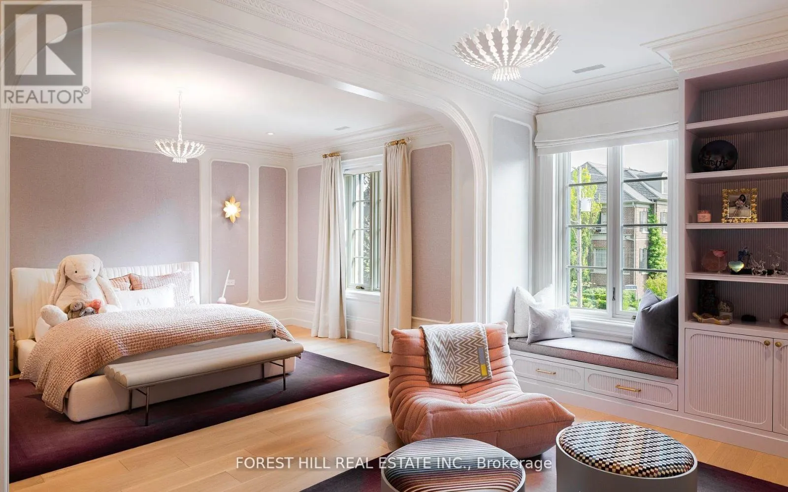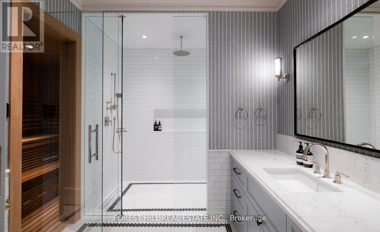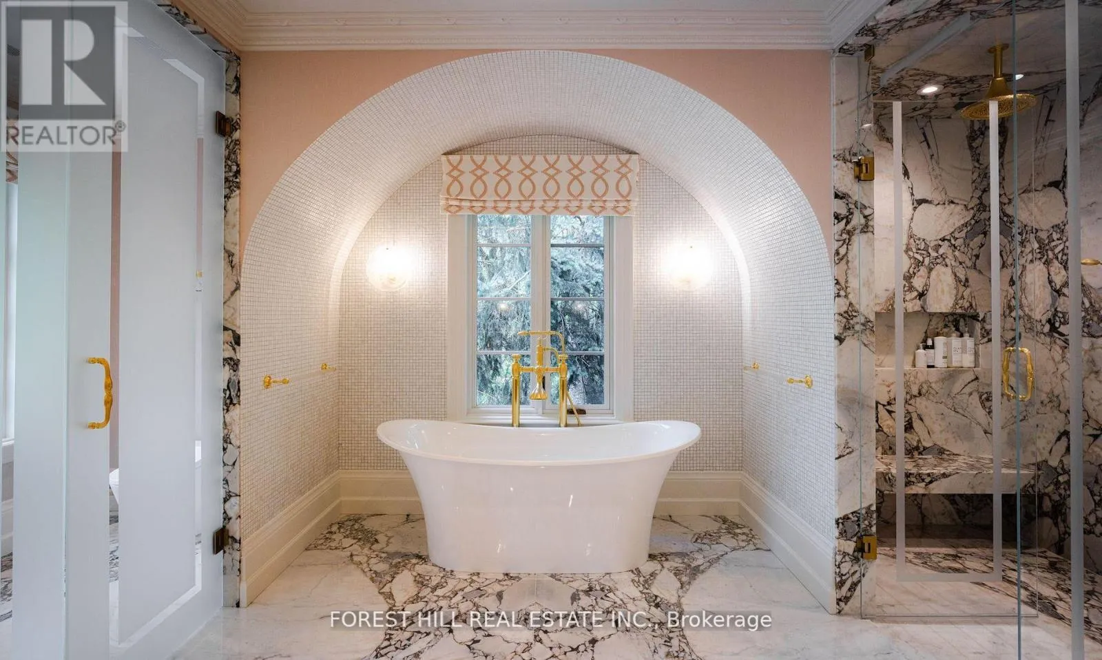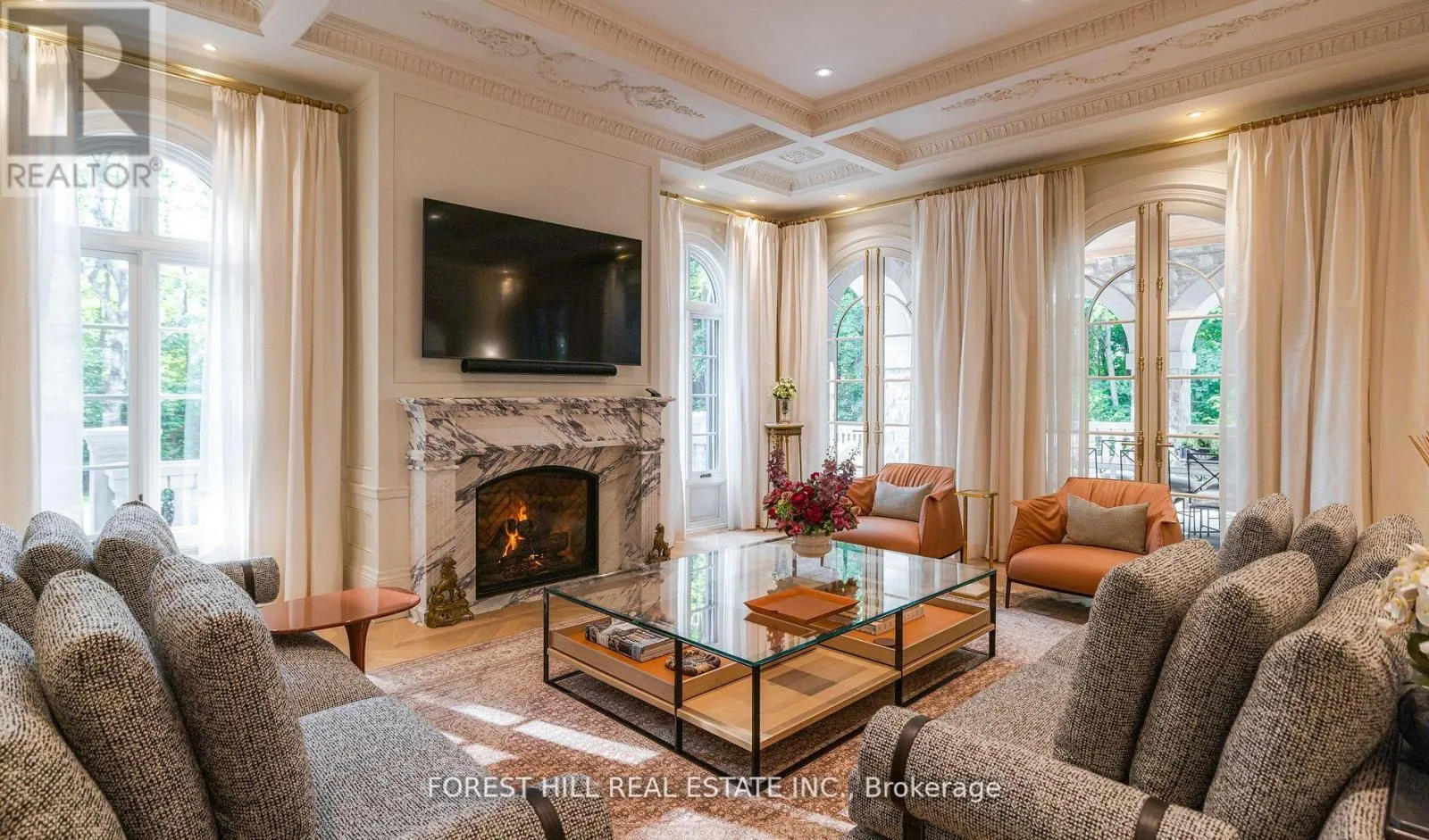 Forest Hill Rd/Larratt St Welcome to 221 Forest Hill Road, an architectural triumph with nearly 13,000 sq ft of living space on a private 17,000 sq ft lot, nestled along the Beltline Trail in the heart of one of Toronto's most exclusive enclaves. This estate represents the pinnacle of bespoke luxury, meticulously brought to life by the city's finest: JTF Homes, Lorne Rose Architect, and Dvira Interiors. Clad in hand-selected limestone and inspired by the romance of the French countryside, the residence evokes the timeless elegance of a Provencal chateau. Arched windows with weathered-blue shutters, a stately turret, and a gracefully symmetrical facade create a striking first impression. A dramatic arcaded loggia opens onto manicured grounds and landscaping imagined by Fitzgerald and Roderick, featuring a lap pool, sports court, and lavish gardens that offer privacy and tranquility. The interiors are nothing short of breathtaking curated blend of old-world grandeur and modern refinement. The main level features soaring ceilings and a dramatic spiral staircase. Chevron-patterned white oak floors, arched passages, imported wallpaper, and tailored lighting reflect impeccable attention to detail. The formal dining room (seating 20) flows effortlessly into a statement kitchen adorned with hand-painted Portuguese tiles and custom cabinetry by Emanuele Furniture Design. The sunlit family room is anchored by a hand-carved fireplace and opens onto the gardens through elegant French doors. The crown jewel is the primary suite, a true sanctuary with vaulted ceilings, whimsical wallpaper, arched detailing, and a fireside lounge that creates a retreat-like atmosphere. The piece de resistance: a couture-inspired, two-storey dressing room with a spiral staircase and chandelier, paired with a spa-like ensuite clad in expansive stone and Shirley Wagner fixtures. The lower level features a sprawling rec room, games lounge, prep kitchen, gym, cedar sauna, and a home theatre for the ultimate cinematic escape. (id:27476)