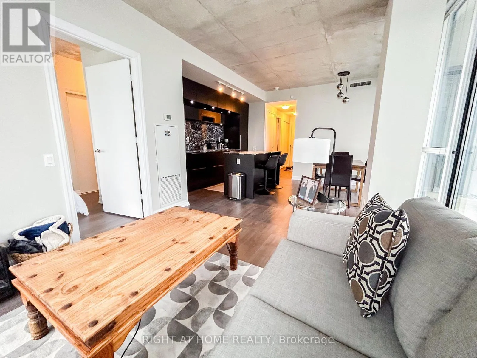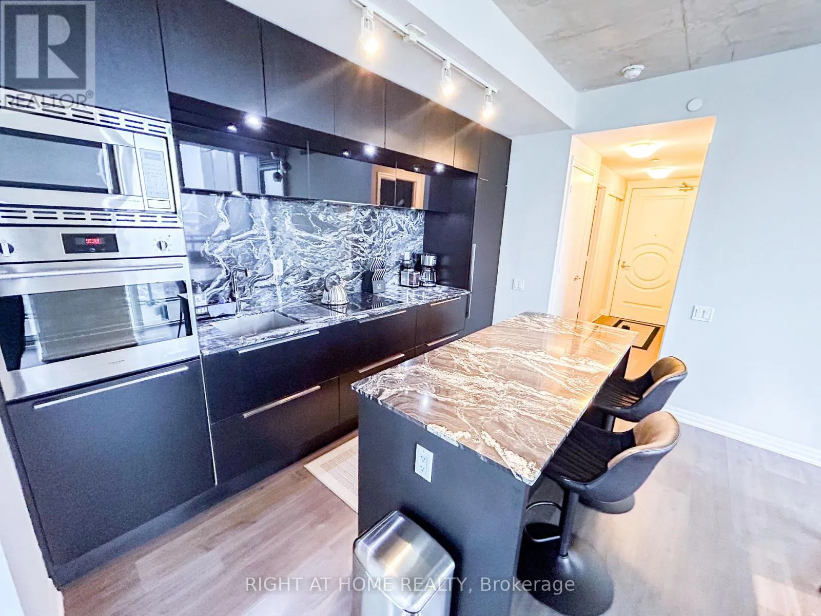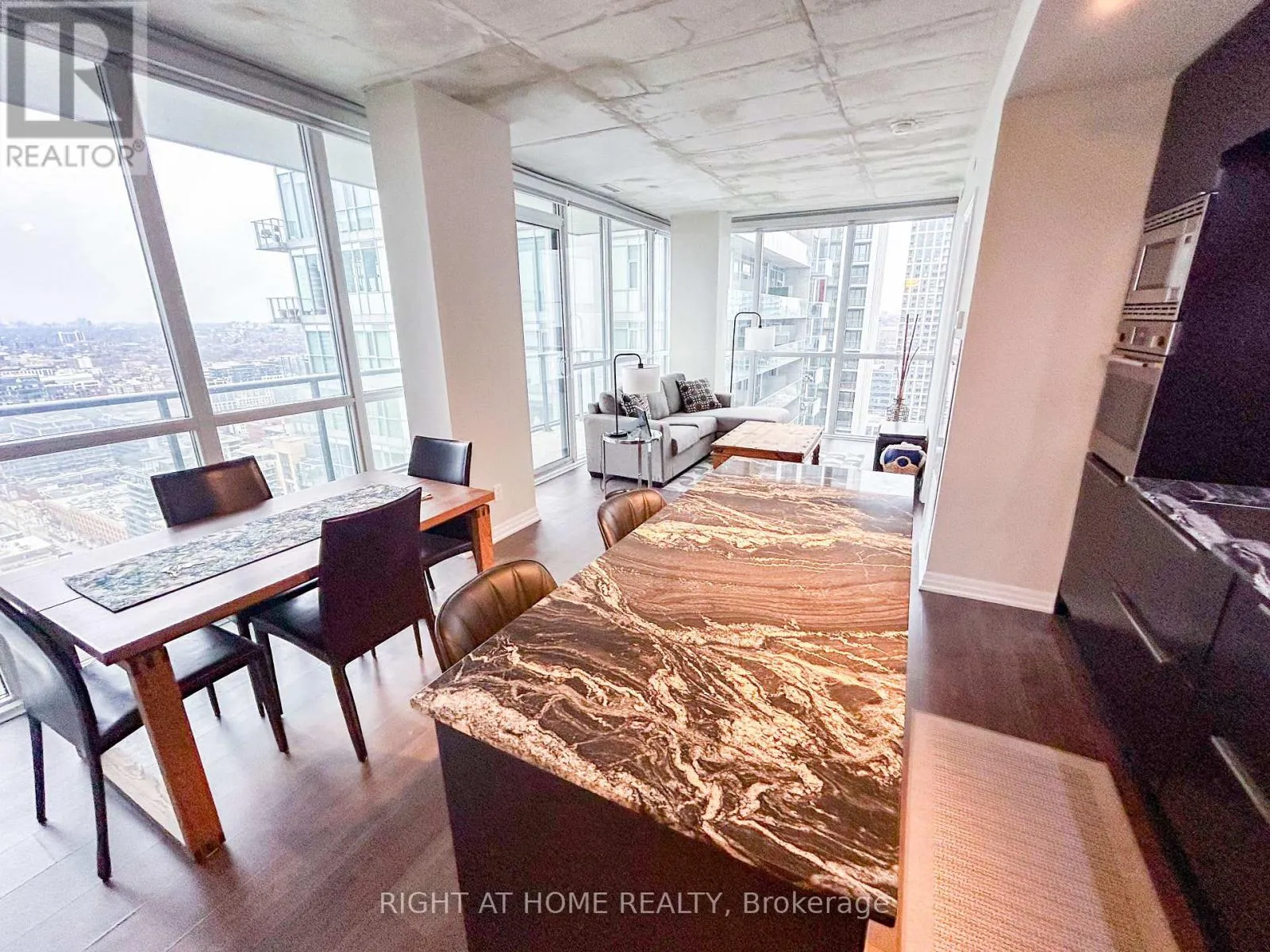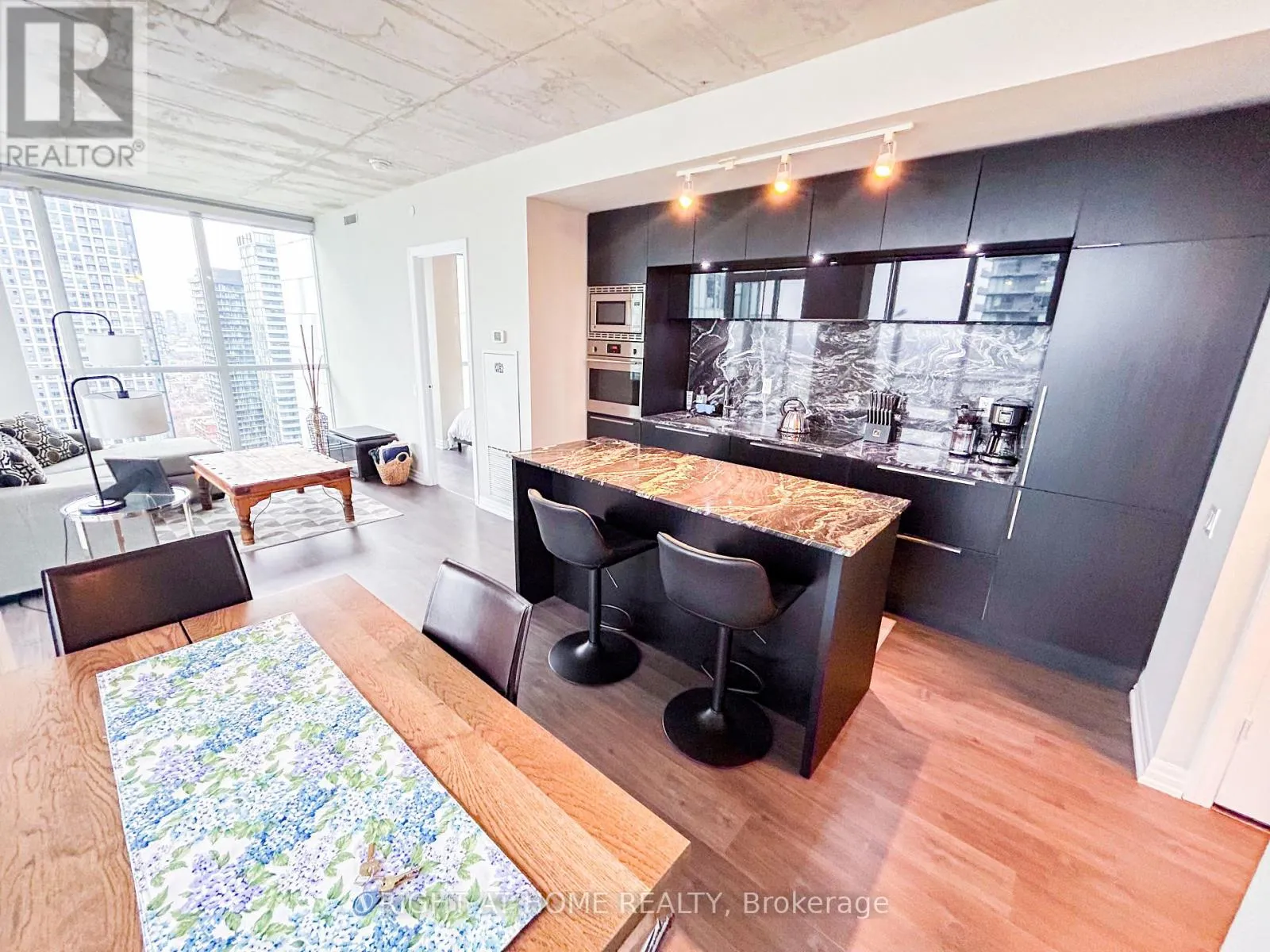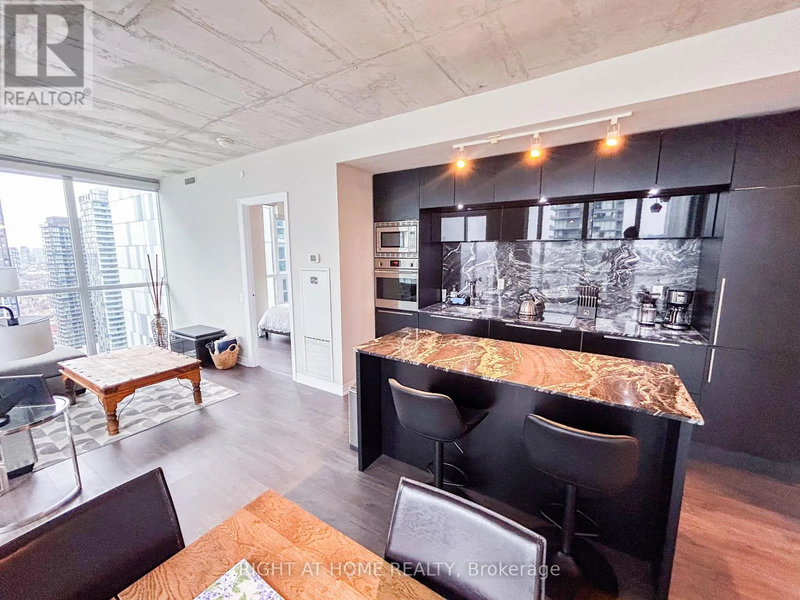 Cross Streets: King And Blue Jays Way. ** Directions: South of King, West side of Blue Jays. Discover elevated living at the iconic Bisha Hotel & Residences in the heart of King West. This sought-after 2-bedroom, 2-bathroom suite offers a desirable split-bedroom layout with 843 sq. ft. of thoughtfully designed living space, complemented by a 109 sq. ft. balcony showcasing expansive northwest views. The interior blends modern sophistication with an industrial edge, featuring exposed concrete ceilings, dramatic floor-to-ceiling windows, and a stylish open-concept kitchen complete with a central island and integrated appliances. Residents enjoy access to exceptional amenities, including a rooftop infinity pool and 24-hour concierge service. With an outstanding Walk Score of 99 and Transit Score of 100, you are just moments from the Rogers Centre, the Toronto International Film Festival, and some of the city's best dining and entertainment-offering not just a place to live, but a true King West lifestyle. (id:27476)