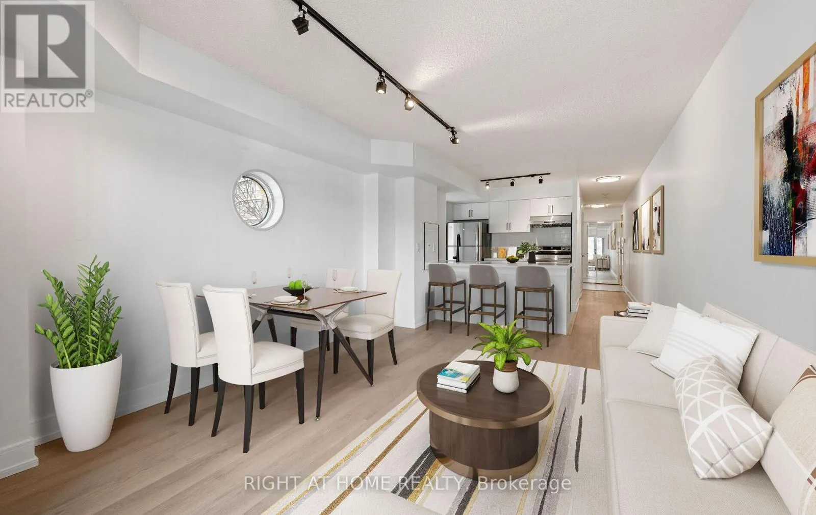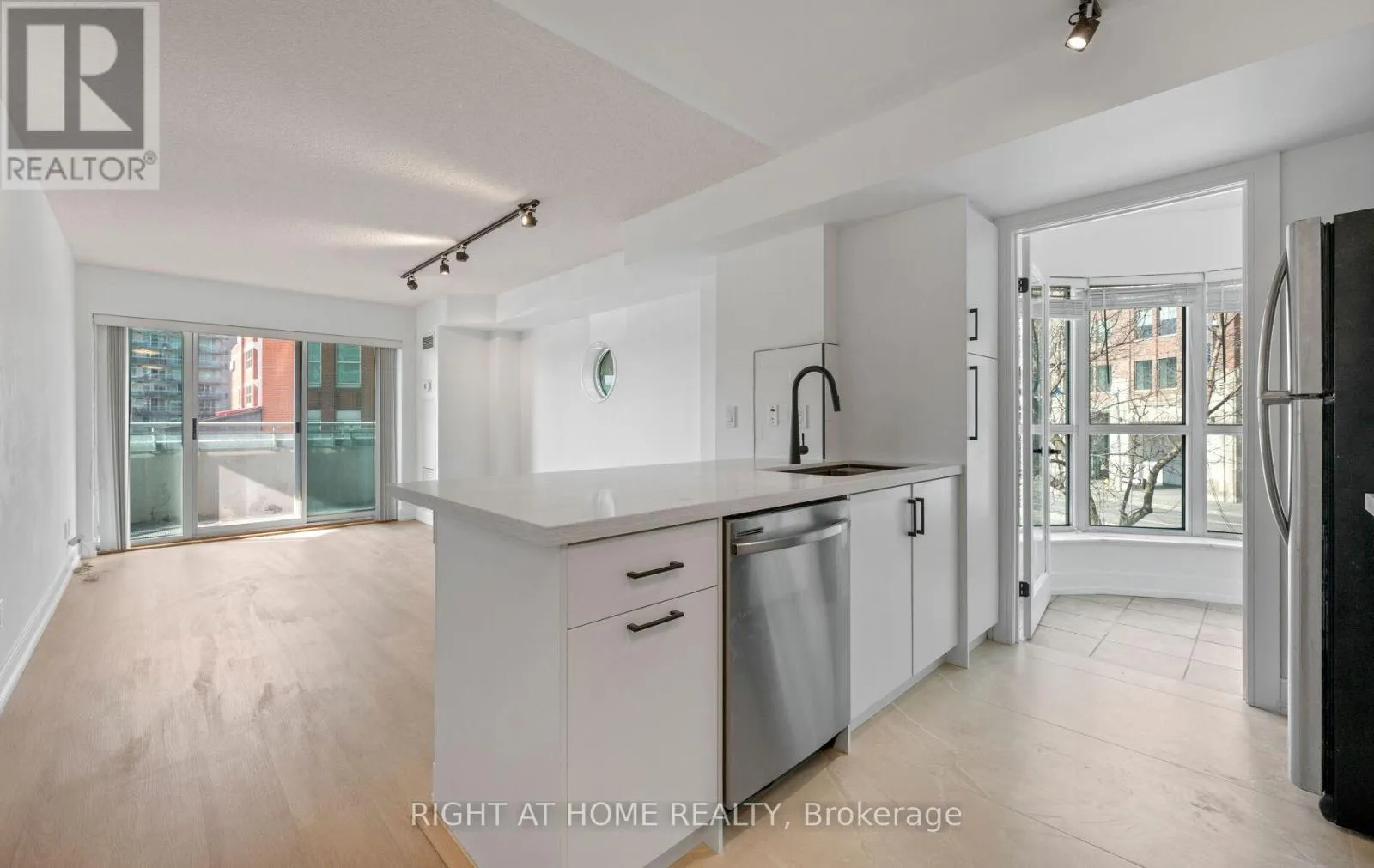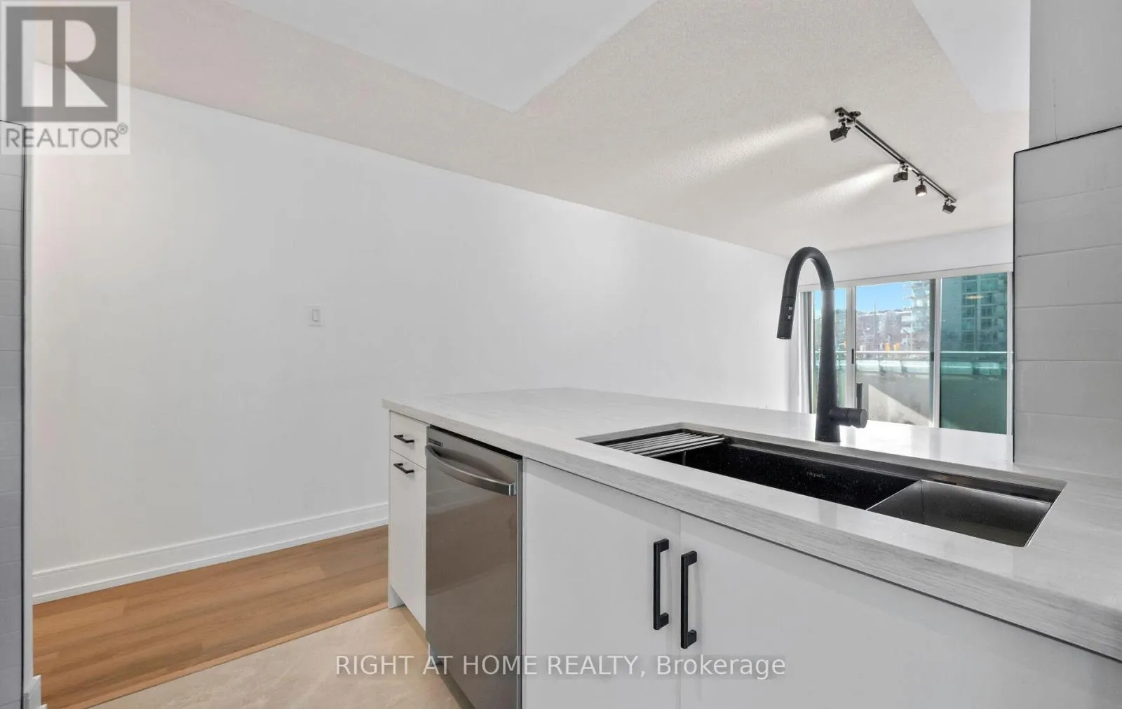 Cross Streets: Bathurst/Queens Quay. ** Directions: east of bathrust on lakeshore. Welcome to Queen's Harbour! This beautifully recently renovated condo is perfectly situated on charming Queen's Quay offering both comfort and functionality. Walk into soaring 9ft ceilings, brand new porcelain tiles and engineered laminate floors.The Spacious primary bedroom features wall-to-wall mirrored closets and a bright window with tons of natural light. Down the hall you will find upgraded bath floors with a spa like vanity, mirror w/built in light and new sliding glass door. Open concept entertainment kitchen showcases brand new porcelain tiles, cabinets, quartz counter tops w/breakfast bar & back splash, deep undermount sink and S/S dishwasher. Direct access to enclosed sun filled den for multi purpose use. Conveniences include ensuite laundry, fridge, stove, dishwasher, parking, locker, hydro & water included in your maintenance fees. A brand new air conditioning unit was installed valued at $4000 and locker brought up to fire code valued at $6000. Lobby was recently upgraded to welcome you and your guests. Ideally located across from the Lakeshore waterfront. Steps to Porter Airlines, Loblaws, scenic parks, recreational trails, restaurants, cafés. TTC transit at your door step and a short drive to the Gardiner. (id:27476)