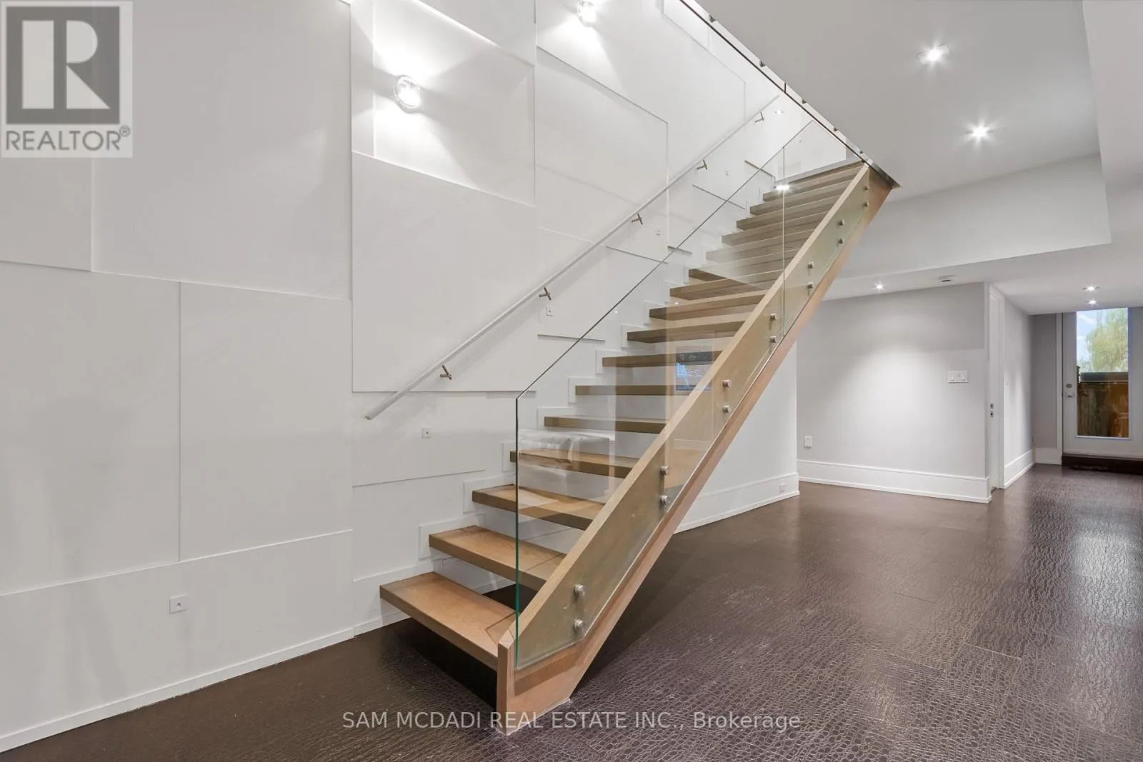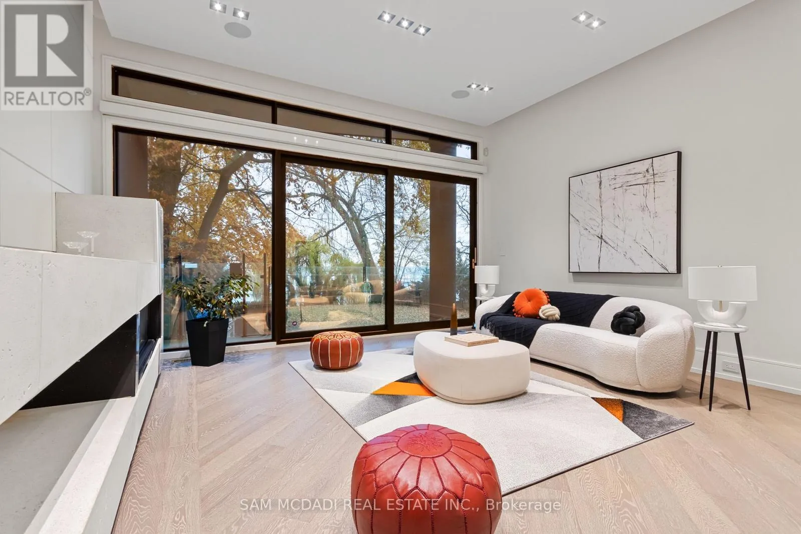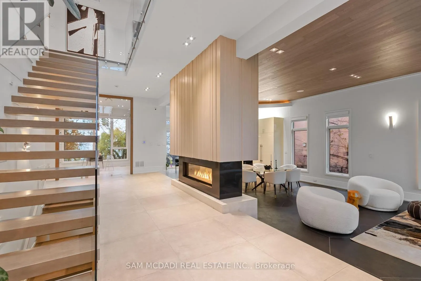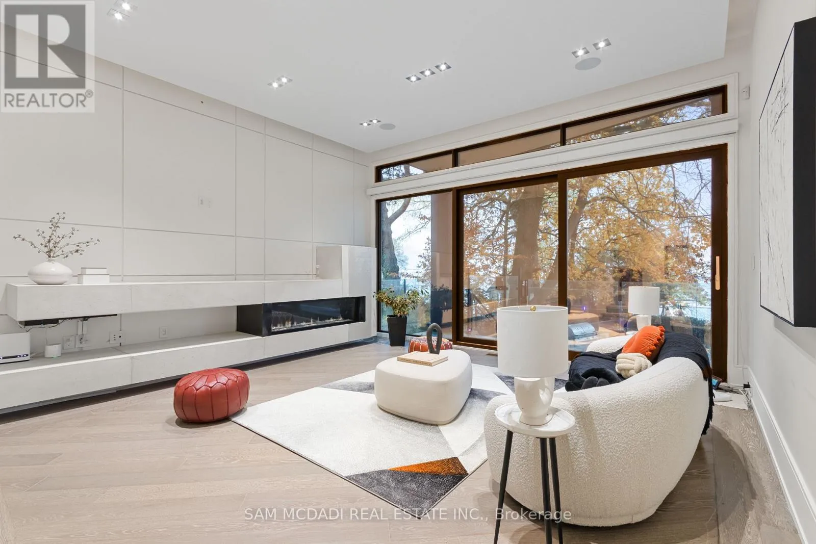 Cross Streets: Thirty First St / Lake Promenade. ** Directions: Head south on Thirsty first St toward Lake Promenade, then turn left onto Lake Promenade. Set along South Etobicoke's prestigious lakefront corridor, this modern estate offers over 6,200 SF of refined interiors paired with resort-style amenities seldom available. Bold in presence and uncompromising in design, it sits behind mature trees with an architectural profile that frames uninterrupted Lake Ontario views. A dramatic open-to-above foyer introduces the home, featuring a floating glass staircase, overhead skylights, and a direct views of the water. The main level unfolds as a sequence of sophisticated living spaces defined by warm wood ceilings, gallery-like walls, and a sculptural double-sided linear fireplace. Near floor-to-ceiling windows wrap the home, inviting natural light and capturing the shoreline from every angle. The chef's kitchen delivers a magazine-worthy experience with Wolf and Sub-Zero appliances, bespoke cabinetry, a custom backsplash, and a striking central island. Adjacent living and dining zones create a fluid setting for elevated entertaining or intimate evenings. Above, 4 serene bedroom suites each offer a walk-in closet and ensuite. The lakefront primary retreat features a boutique dressing room, spa-calibre ensuite with heated floors and a freestanding tub overlooking the water, plus a private balcony for quiet reflections. The lower level extends the home's resort-like character with a recreation lounge, bar, gym, sauna, steam room, wine cellar, and an additional guest suite, opening seamlessly to the tiered backyard. Outdoors, multiple terraces, mature landscaping, a heated pool, a hot tub, and sweeping lake vistas create a breathtaking environment for year-round enjoyment. Additional comforts include a heated driveway, architectural millwork, integrated lighting, and a layout designed for both luxury living and effortless hosting. Moments from waterfront trails, marinas, golf, and downtown Toronto, this estate offers a rare opportunity to own an impeccably crafted lakefront home. (id:27476)