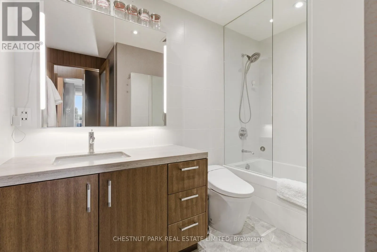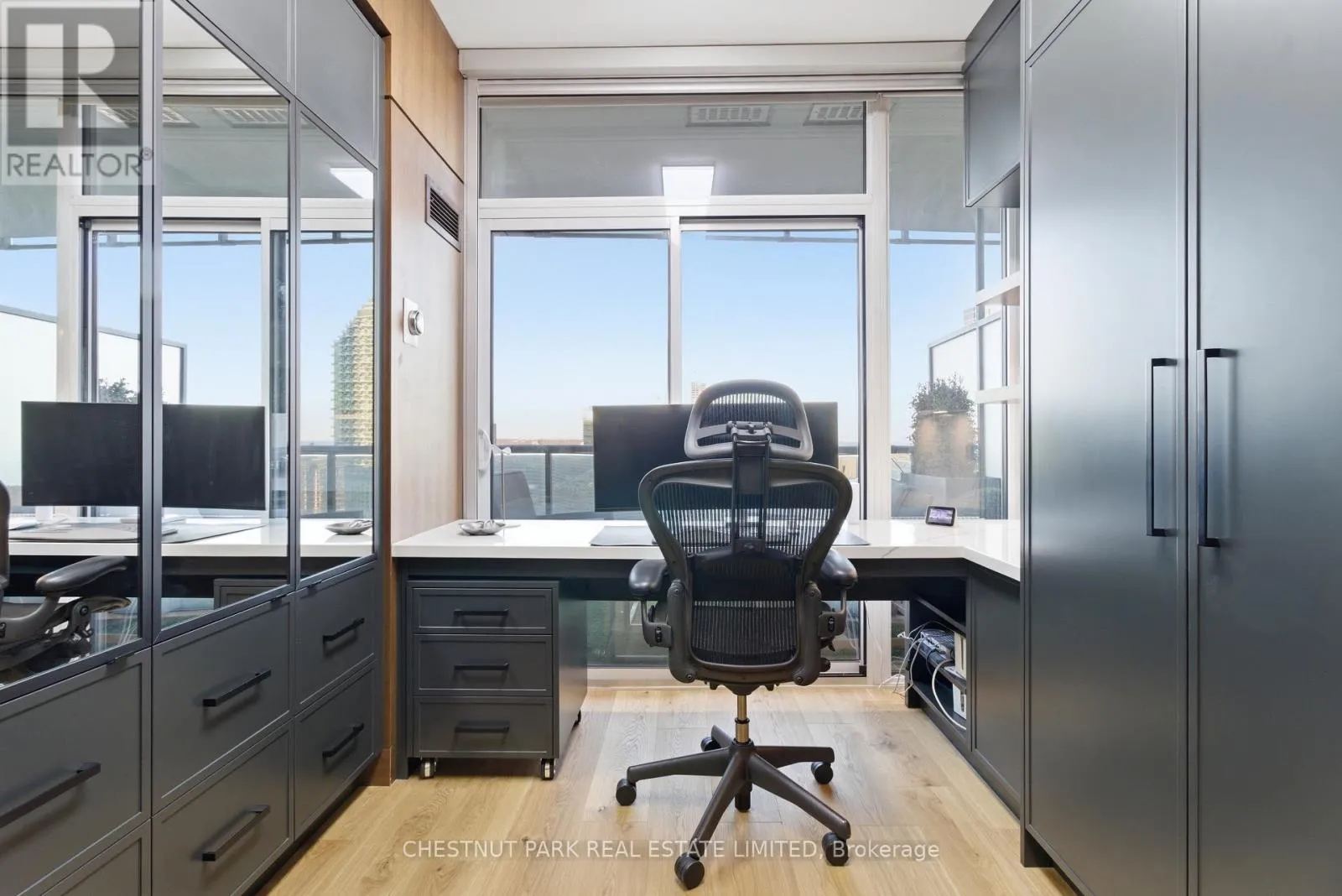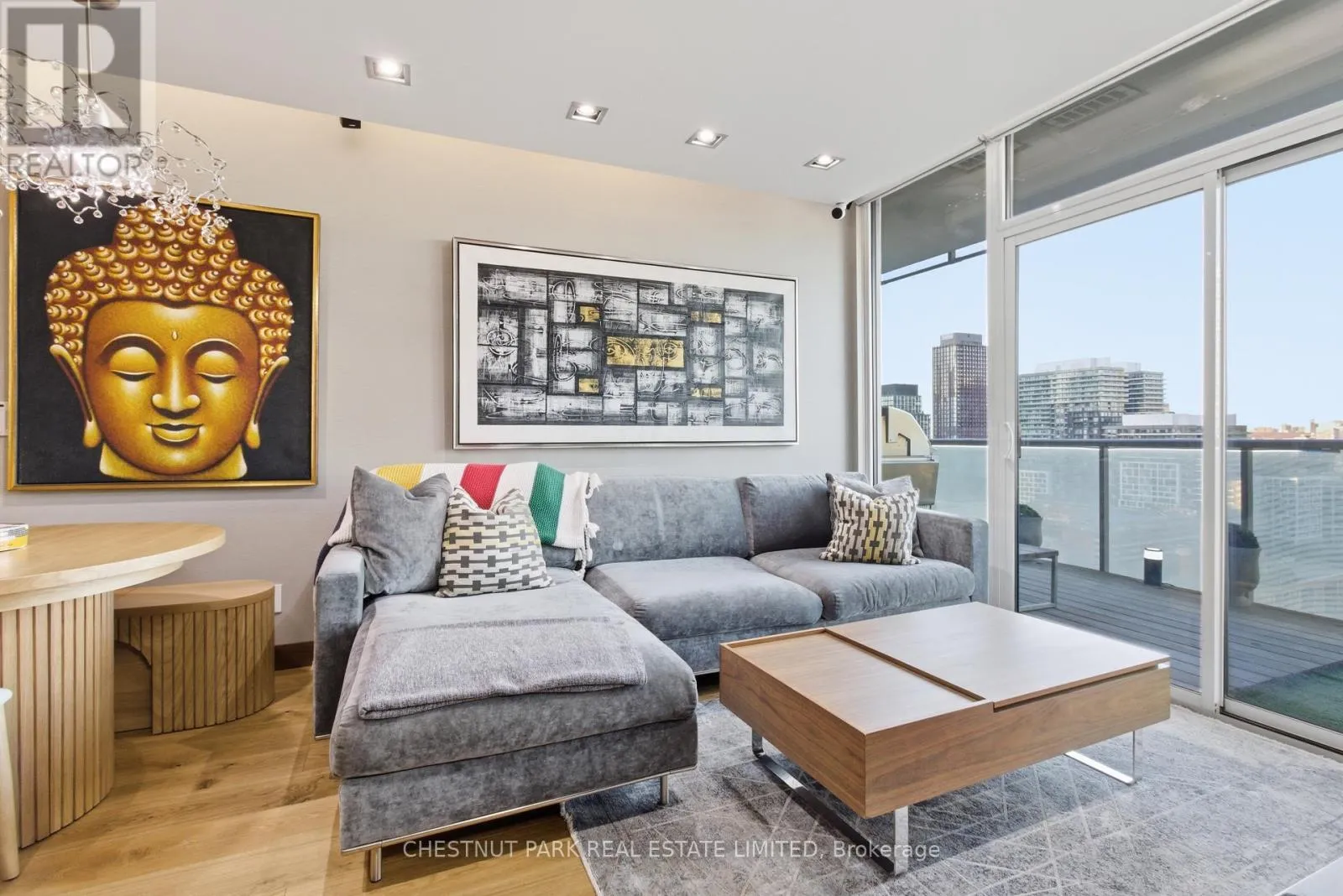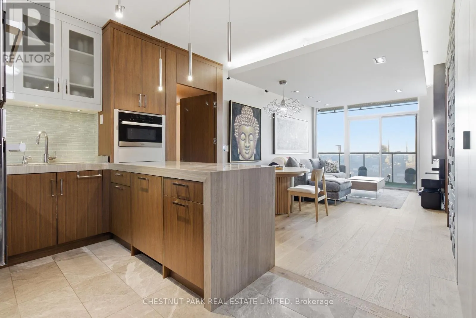 Cross Streets: Jarvis And Front/Esplanade. ** Directions: Immediately south of St Lawrence Market off The Esplanade. Enjoy the pinnacle of luxury in the heart of downtown Toronto; a one-of-a-kind $275K bespoke renovation. Designed by world-renowned Paul Rafauli, this fully-furnished, turnkey 2 Bed / 2 Bath split-floor residence offers 885sf of sophisticated interior living with unobstructed south-east views of the skyline, treetops, and Lake Ontario + 238sf private rooftop terrace! Walnut-paneled walls and doors, custom built-ins, contemporary stone accents, designer lighting, and fully integrated smart home automation create effortless, jet-set-ready elegance.The kitchen is a masterpiece of form and function: granite waterfall island with recessed LED lighting, marble floors, custom walnut and high-gloss cabinetry, glass tile backsplash, built-in pantry, premium Sub-Zero and Miele appliances; perfect for curated entertaining or quiet gourmet moments. An LG Styler keeps your wardrobe perfectly steamed, sanitized, and pressed at a touch.Sun-drenched living and dining areas with floor-to-ceiling windows frame breathtaking vistas, providing a cinematic backdrop for work, leisure, or hosting guests. The primary retreat is a sanctuary of bespoke luxury with walnut millwork paneling, built-in his and hers closets with organizers, illuminated shelving, designer wallpaper, custom blackout shades, and a 4-piece marble ensuite featuring Toto smart toilet and frameless glass shower and tub. The second bedroom, designed as an executive office, includes custom built-ins, abundant storage, and a marble-finished ensuite.Step outside to the gorgeous private terrace with wood-plank flooring, astro-turf, integrated lighting, natural gas BBQ line, an extraordinary outdoor stage for sunset cocktails, intimate entertaining, work & reflection above the city. Steps to Union Station, St Lawrence Market, Financial district, Universities, Film Studios, Sugar Beach, Berczy Park, Loblaws and amenities galore; this is Toronto living at its best! Just bring your suitcase. (id:27476)