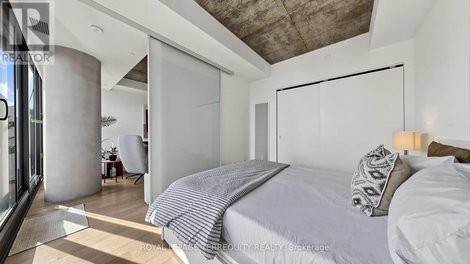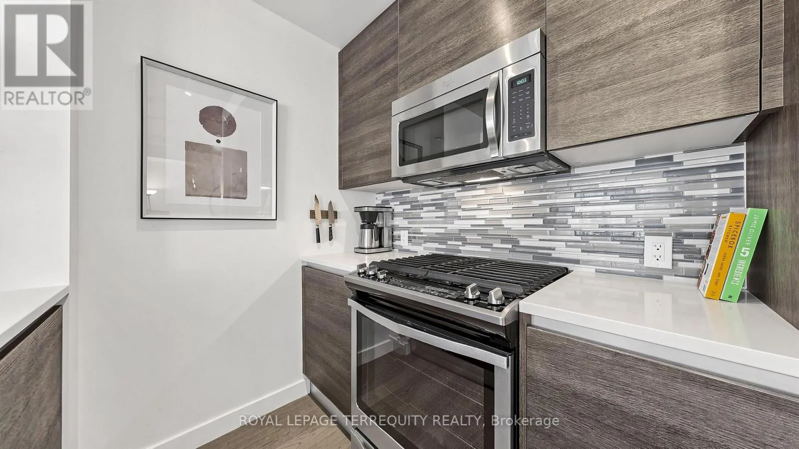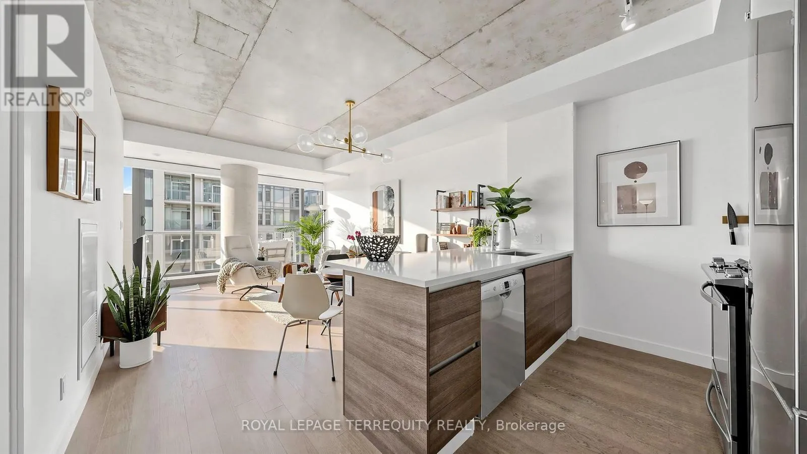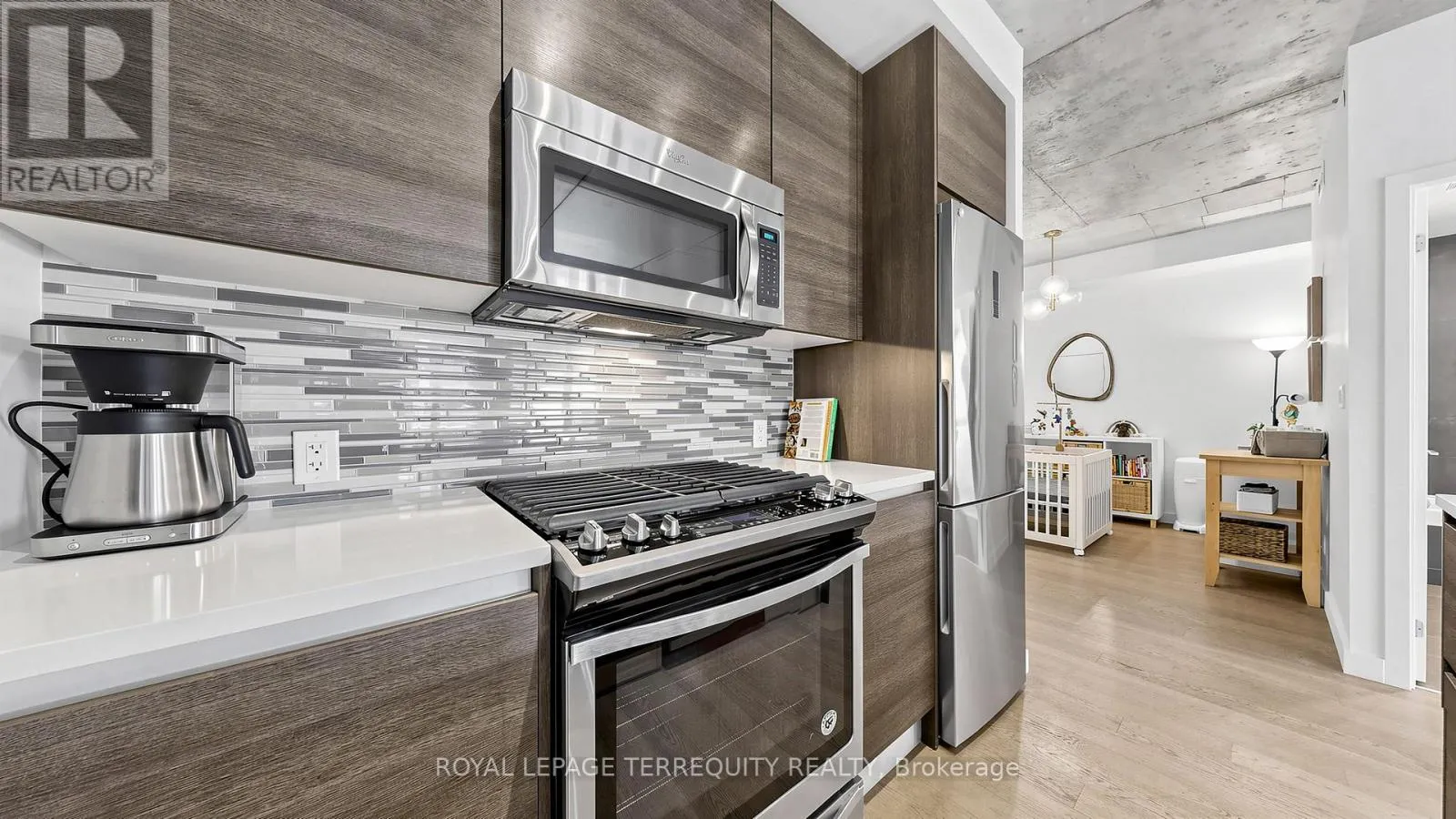 Cross Streets: Bathurst & King. ** Directions: S of Bathurst. King West vibe - this generous 1+den suite is clean, modern, and effortlessly cool. Think 9-ft exposed concrete ceilings, floor-to-ceiling windows, and an open-concept layout that feels both airy and intentional. The east-facing exposure keeps things bright with soft morning light and open terrace views that make the space feel calm above it all. Custom tall kitchen cabinetry, quartz counters, integrated stainless appliances, a sleek backsplash, breakfast bar, and a gas range-rare for condo living and perfect if you actually cook. Engineered hardwood runs throughout, adding warmth to the industrial edge. The den is almost a second bedroom in size, making it genuinely versatile-set it up as a proper home office, guest room, or creative space without compromise. The layout just works-no wasted space, no awkward corners. The terrace spans the full width of the suite, it's an oversized outdoor extension with a gas line-perfect for BBQs, morning coffee, or hosting friends before heading out. It's the kind of space that's hard to find and even harder to leave. Maintenance fees are exceptionally low at $541.55, excellent value for the neighbourhood! The building offers everything you need without overdoing it: rooftop terrace with BBQs, party room, guest suites, great neighbours and concierge that cares. And the location? This is why people want King West. Step outside and you're walking everywhere-coffee, fitness studios, groceries, restaurants, parks, nightlife. It's a real community vibe where you start recognizing faces, favourite spots, and your go-to routines. You're minutes to Stanley Park, Waterworks Food Hall, The Well, STACKT Market, and some of the city's best dining. The waterfront is a quick bike or walk, and the Gardiner is right there when you need to get out of the core. With the future King-Bathurst Ontario Line station around the corner, this pocket is only getting better. (id:27476)